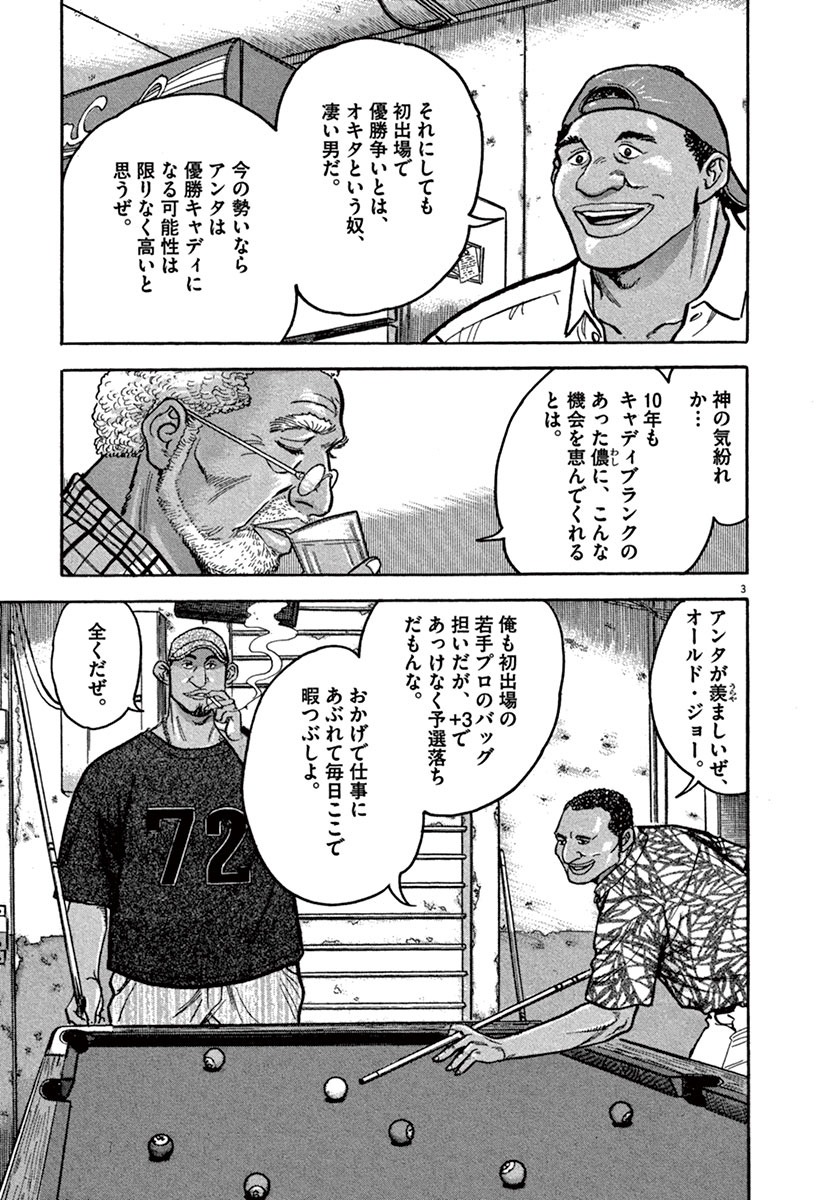●あらすじ/オーガスタの黒人キャディたちが集まる一軒の古びたバー。そこには、言葉少なに喜びを噛みしめる沖田のキャディ、オールド・ジョーの姿があった。沖田によって長年の念願であった最終組のキャディが現実のものとなった今、ジョーの脳裏には、キャディを引退する契機となった10年前のある出来事が浮かんでいて…(第1話)。▼マスターズ最終日前夜。笠崎と杉山は、経営する会社の倒産という苦境に立たされている石倉のことを話していた。長年の付き合いがある笠崎は、石倉のことを「戦友」だと熱く語る。また、麗子と木曽記者も、重要な決戦を控えている沖田には、石倉のことが伝わらないようにと考えていたのだが…!?(第2話)
