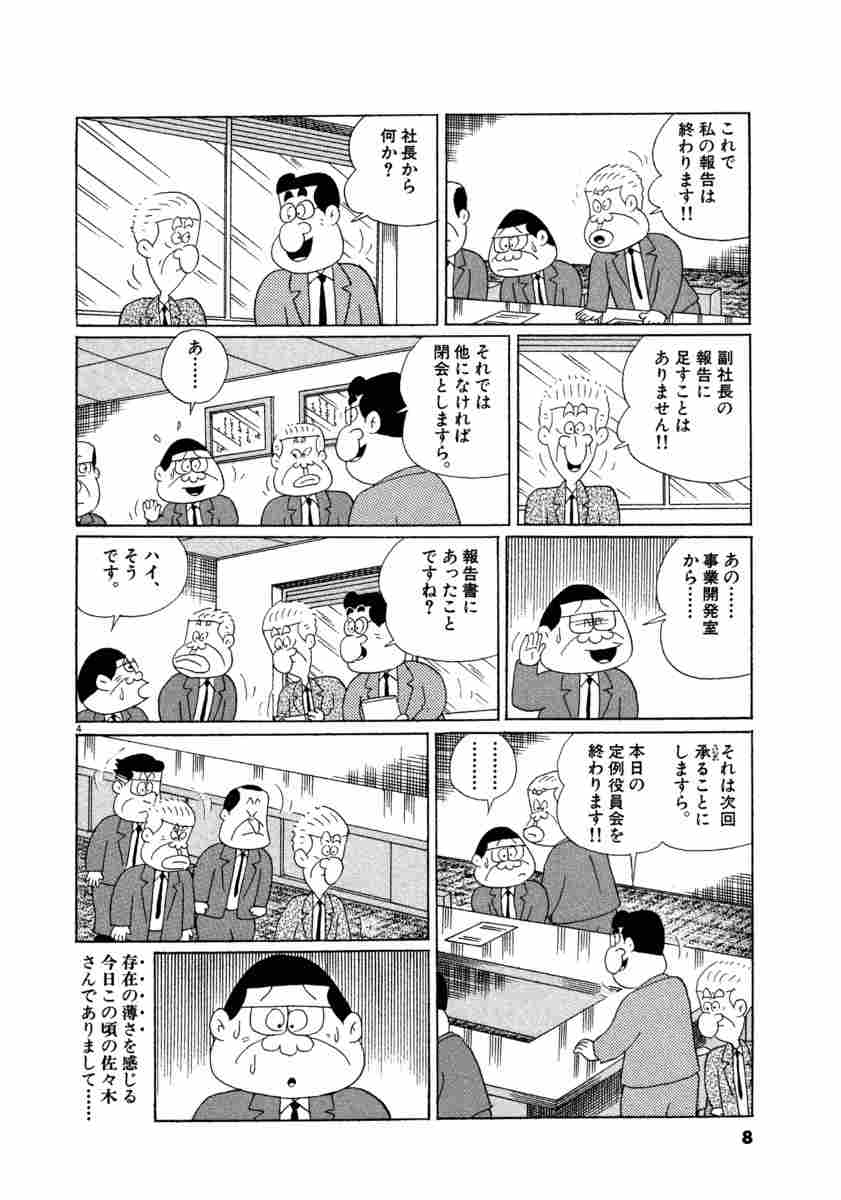 ●あらすじ/鯉のぼりがたなびく5月。株主総会を控えてややピリピリムードの鈴建では定例役員会の真っ最中。そんな中、常務とはいえ閑職で、いつ役員を降ろされるか分からない佐々木さんは気分がどん底に落ち込んでいたが、トイレで偶然出くわした鈴さんから、思いがけずお褒めの言葉を頂いて…(第1話)。▼建設中のビル視察で、油断したすきに地上38階にひとり取り残された佐々木さん。エレベーターの主電源は切られるわ、頼りの携帯電話は階下に落っことしてしまうわで、まさになす術なしの状況に。「銀座に飲みに行こう」と誘っていたハマちゃんたちが気付くことに期待したものの、日頃の存在感の薄さのせいか気付かれることはなく…(第2話)。