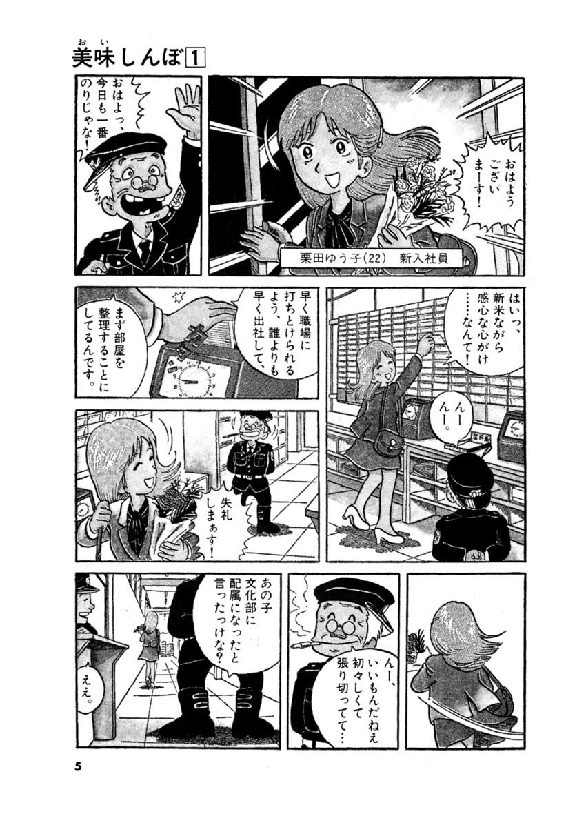 「食」ブームを巻き起こし、アニメ、映画化された大人気コミック! ▼第1話/豆腐と水▼第2話/味で勝負(アンコウの肝)▼第3話/寿司の心(にぎり寿司)▼第4話/平凡の非凡(ご飯、ミソ汁、イワシの丸干し)▼第5話/料理人のプライド(バター)▼第6話/油の音(天プラ)▼第7話/ダシの秘密(カツオブシ、昆布)▼第8話/野菜の鮮度(ダイコン)▼第9話/舌の記憶(水たき) ●登場人物/山岡士郎(東西新聞文化部員・膨大な食の知識を持つ。東西新聞の壮大な企画「究極のメニュー」の作成を担当)。栗田ゆう子(東西新聞文化部員・山岡とともに「究極のメニュー」を担当する)。海原雄山(名だたる陶芸家にして、食の探究者。「美食倶楽部」主宰。山岡の実父) ●あらすじ/東西新聞文化部に配属された新入社員・栗田ゆう子は、希望あふれる出社初日から、憧れの新聞社にも山岡士郎のような無神経でぐうたらな先輩が居ることに驚かされる。だが文化部全員が受けた味覚テストに合格し、大原社主・肝入りの企画「究極のメニュー」の担当者に選ばれたのは、ゆう子と山岡の2人であった…(第1話)。 ▼「究極のメニュー」作りのスタートにあたり、東西新聞社では名だたる食通を集めての会議が行なわれた。その席上で食通たちのブランド嗜好を嘲笑した山岡。彼が提示した「フォアグラより美味い物」とは、なんと居酒屋などで良くみられる「アンキモ」だった(第2話)。 ●本巻の特徴/この第1巻では、膨大な食への知識などの謎が多い山岡の生い立ちの秘密が徐々に明らかにされると同時に、この長編作品の最大のモチーフとなる、山岡の実父・海原雄山との初対決(第6話)が描かれる。 ●その他の登場キャラクター/京極万太郎(第4話)、辰さん(第4話)、「岡星」主人(第4話)、ニューギンザデパート会長・板山秀司(第8話)、栗田一家(祖母・たま代、父・信一、母・文枝、兄・誠)(第9話) ●その他DATA/表紙写真~オマール・ブイール(オマールエビの香草煮)、フォアグラ・ブリオッシュ、サラダ・ペール〔調理/まっくろう〕