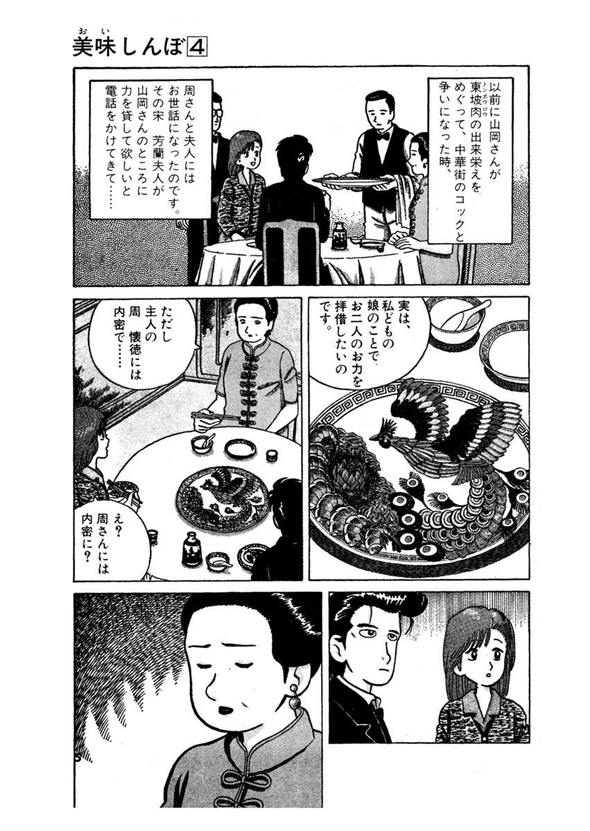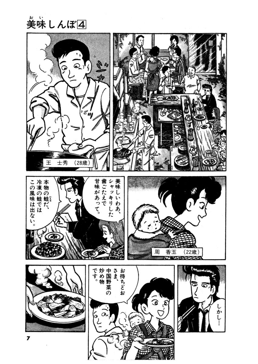 「食」ブームを巻き起こし、アニメ、映画化された大人気コミック! ▼第1話/直火の威力(チャーハン)▼第2話/女の華(握り寿司)▼第3話/旅先の知恵(浜鍋、筍の刺身)▼第4話/酒の効用(日本酒)▼第5話/食卓の広がり(カツ丼)▼第6話/うどんの腰▼第7話/板前の条件(料理人と喫煙)▼第8話/茶の味わい(玉露)▼第9話/縁日のにぎわい(タコ焼き) ●登場人物/山岡士郎(東西新聞文化部員・膨大な食の知識を持つ。東西新聞の壮大な企画「究極のメニュー」の作成を担当)。栗田ゆう子(東西新聞文化部員・山岡とともに「究極のメニュー」を担当する)。海原雄山(名だたる陶芸家にして、食の探究者。「美食倶楽部」主宰。山岡の実父) ●あらすじ/周大人の妻が山岡たちに相談があるという。娘の香玉が、屋敷のコック・王士秀と駆け落ちしたというのだ。この二人が場末で営む中華料理店を訪ねた山岡たちは、王が華僑同郷会の融資を得るために料理の試験を受ける事を知る。だが、王の料理には決定的な弱点があることを、山岡は見抜いていた…(第1話)。▼ひょんことから女の寿司職人・夏子と知り合った山岡とゆう子。男の職人に負けたくないばかりに、荒々しく振る舞う夏子に、客として訪れた女形の名優が「あなたからは男の醜さしか感じとれない」と苦言を呈する。失意の夏子を、山岡が一軒のフランス料理店に招待する。そこは一人の女性シェフが調理場をしきっている店だった(第2話)。 ●本巻の特徴/第7話で海原雄山が主催する「美食倶楽部」が登場。「岡星」の主人の弟・良三がここで働き、喫煙が原因でクビになるが、山岡の機転で許されるというエピソードが描かれる。傲慢不遜なだけではなく、懐の深い雄山の一面が。 ●その他の登場キャラクター/周懐徳(第1話)、「寿司とも」主人・夏子(第2話)、東西新聞編集局長・小泉(第4話)、ニューギンザデパート会長・板山秀司(第4話)、良三(第7話)、京極万太郎(第7話) ●その他DATA/表紙写真~鴛鴦を型どった冷菜のオードブル、香り野菜のサラダ 〔調理/龍の子〕