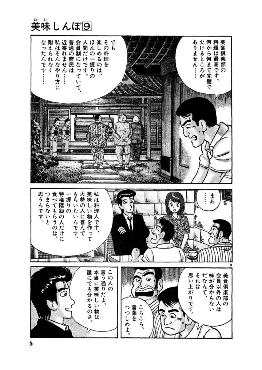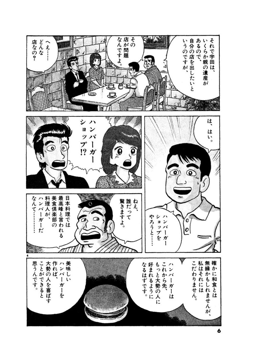 「食」ブームを巻き起こし、アニメ、映画化された大人気コミック! ▼第1話/ハンバーガーの要素・前編、後編▼第2話/食べない理由・前編、後編(フアッテューチョン)▼第3話/再会の丼(牛丼)▼第4話/黒い刺身(カワハギの肝)▼第5話/5年目のパスタ(マカロニ)▼第6話/日米味合戦(化学調味料)▼第7話/最高の肉(サーロインステーキ)▼第8話/新妻の手料理(うずめめし) ●登場人物/山岡士郎(東西新聞文化部員・膨大な食の知識を持つ。東西新聞の壮大な企画「究極のメニュー」の作成を担当)。栗田ゆう子(東西新聞文化部員・山岡とともに「究極のメニュー」を担当する)。海原雄山(名だたる陶芸家にして、食の探究者。「美食倶楽部」主宰。山岡の実父) ●あらすじ/才能あふれる料理人・宇田が美食倶楽部を辞めたいと言い出した。より大勢の人を喜ばせるために、ハンバーガーショップを始めたいというのだ。最高の牛肉を手に入れ、いよいよ開店の日、海原雄山が宇田の店にやってきた。宇田のハンバーガーを一口食べた雄山は「こんなものは売り物にならん!」と一喝。一般の客たちも見向きもしない。山岡には、その理由が判っていた…(第1話)。▼東京のデパートの経営者は2か月に一度、親睦の意味で食事会を開いている。だが、そのメンバーの一人、東起デパートの稲森社長は、どんな料理を出されても、食通ぶるばかりで一口も食べようとしない。板山会長にその話を聞き、興味を持った山岡は稲森社長を訪ねる(第2話)。 ●本巻の特徴/日本料理の基本となる味「旨味」。この味覚に関しては、実は日本人が最も鈍感になってしまっている。その理由は「化学調味料」の氾濫にあった…。現代日本人にとって非常にショッキングなテーマを提示したのが第6話。“社会派コミック”といわれる本作品の面目躍如だ。 ●その他の登場キャラクター/中松警部(第1話)、周懐徳(第2話)、快楽亭ブラック(第3、6話)、辰さん(第5話)、ジェフ・ラーソン(第6話)、ニューギンザデパート会長・板山秀司(第2、6話) ●その他DATA/表紙写真~牛丼、つけもの〔調理/麻布・酒飯包正〕