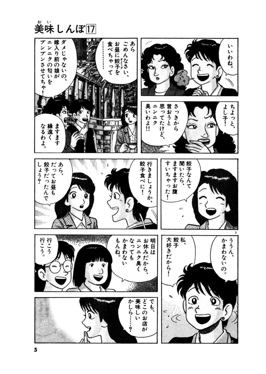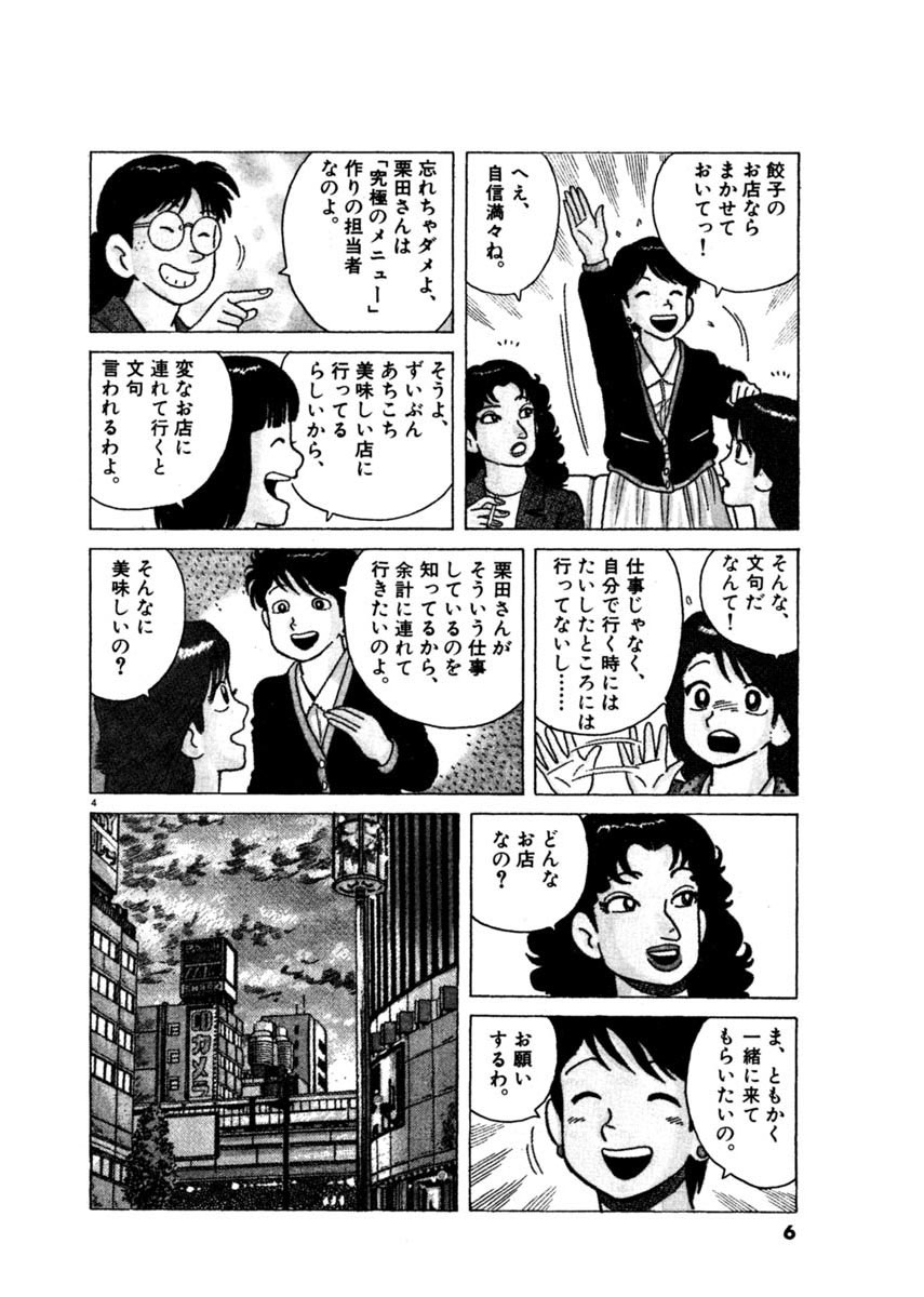 「食」ブームを巻き起こし、アニメ、映画化された大人気コミック! ▼第1話/餃子の春・前編、中編、後編(餃子)▼第2話/エイと鮫・前編、中編、後編(鮫料理、エイ料理)▼第3話/代用ガム(小麦粉のグルテン)▼第4話/贅沢な献立(マグロの大トロの串焼き、鯛の皮のにぎり寿司)▼第5話/海のマツタケご飯(トコブシ) ●登場人物/山岡士郎(東西新聞文化部員・膨大な食の知識を持つ。東西新聞の壮大な企画「究極のメニュー」の作成を担当)。栗田ゆう子(東西新聞文化部員・山岡とともに「究極のメニュー」を担当する)。海原雄山(名だたる陶芸家にして、食の探究者。「美食倶楽部」主宰。山岡の実父) ●あらすじ/栗田ゆう子の同期社員・森沢よし子は、餃子チェーンを経営する山脇にほのかな恋心を抱いていた。だが、山脇は死別した妻の面影を忘れることが出来ず、その妻が作り出した餃子の味にこだわり続けていた。そんな山脇が、ライバル店に対抗するため、遂に新しい餃子の味に挑戦するという。ゆう子は森沢の恋心を応援するべく、山岡に協力を依頼する(第1話)。▼東西テレビのプロデューサーが、文化部を訪ねてきた。記録映画作家の房元にドキュメンタリー番組の制作を依頼したが、なぜか断られてしまったという。房元に聞くと、「プロデューサーの顔、声、服の趣味などすべてが自分の感性に合わないから」とわがままなことを言う。グルメとしても有名な彼が「エイや鮫なんて不味いもの、食べたこともない」と断定するのを聞いた山岡は、“外見だけで決めつける”房元の悪癖を正すべく、美味い鮫料理の探訪に彼を誘う(第2話)。▼富井副部長がめずらしく山岡たちを夕食に誘った。仲の悪い弟と会わねばならず、喧嘩にならないように、第三者である山岡たちに同席してもらいたかったのだ。あんのじょう、貧しかった父親が作ってくれたという“代用ガム”が実在したかどうかで大喧嘩になってしまう富井兄弟。そのガムが「小麦粉をこねて作ったもの」という富井の話を聞いた山岡は…(第3話)。 ●その他DATA/表紙写真~エイの焦がしバターソース〔調理/ドデュ・ダーンド〕