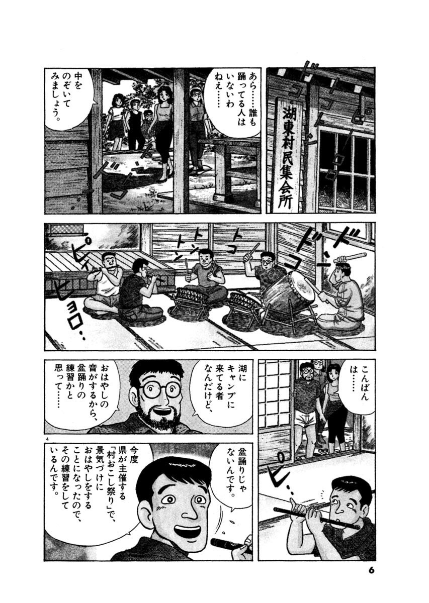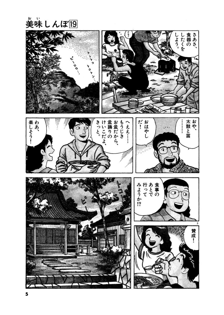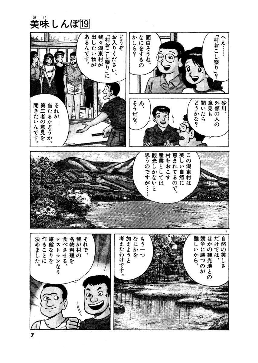 「食」ブームを巻き起こし、アニメ、映画化された大人気コミック! ▼第1話/対決!村おこし・前編、後編(ラーメン、鳥・豚・牛料理)▼第2話/杜氏と水(日本酒と水)▼第3話/舌禍事件!(牛タン焼き)▼第4話/韓国風お好み焼き(チヂミ)▼第5話/食は三代?・前編、後編(生肉各種、アスパラガスと帆立貝の貝柱のムース)▼第6話/仏の足(アヒルの足の蒸し煮、ニワトリの足のスープ、豚足のゆでたもの、豚足の煮込み)▼第7話/大切なミント(ベトナム風春巻き) ●登場人物/山岡士郎(東西新聞文化部員・膨大な食の知識を持つ。東西新聞の壮大な企画「究極のメニュー」の作成を担当)。栗田ゆう子(東西新聞文化部員・山岡とともに「究極のメニュー」を担当する)。海原雄山(名だたる陶芸家にして、食の探究者。「美食倶楽部」主宰。山岡の実父) ●あらすじ/湖にキャンプにやって来た山岡一行は、祭り囃子の練習に励む村の青年団と知り合う。彼らは県が主催する“村おこし祭り”の練習をしていた。この村では、その祭りで村の名物料理を実演するのだが、実は隣村も同じく名物料理を新たに作り出そうとしている。しかも、その助っ人として雄山が関わっているらしい。青年たちは山岡が“究極のメニュー”担当者だと知り、力を貸して欲しいという。思わぬところで「究極VS至高」の番外戦となってしまったが…(第1話)。▼山岡たちと中松警部は路上で何やら争っている二人の男と出会った。この二人は東京の酒造会社の専務と杜氏。自社の酒をもっと旨い物にするため、専務がこの杜氏を地方から呼んだのだが、突然杜氏が「あなたの元では働きたくない」と怒りだしてしまったのだという。専務には彼の怒りの理由がまったく分からない。東京までの道中の状況を聞いた山岡は「それじゃ杜氏が怒って当然だ」という。さて、杜氏は専務のどこに怒りを覚えたのか…(第2話)。●その他の登場キャラクター/カメラマン・荒川(第1話)、中松警部(第2話) ●その他DATA/表紙写真~ベトナム風春巻き〔調理/ドデュダーンド〕