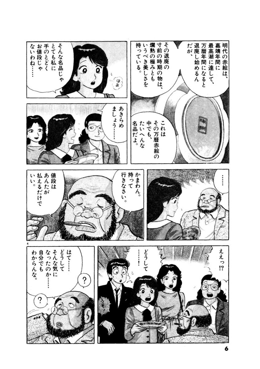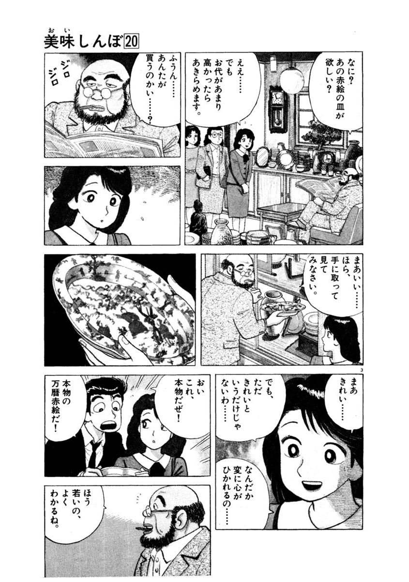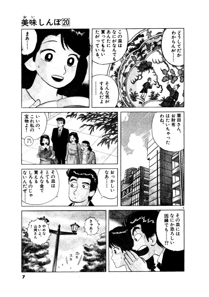 「食」ブームを巻き起こし、アニメ、映画化された大人気コミック! ▼第1話/奇妙な皿(ザーサイと雲南茶のお茶漬け)▼第2話/山の秘宝(シメジのソテー、マイタケのトリ鍋)▼第3話/マツタケ・ドリーム(マツタケ)▼第4話/蒸し焼き勝負・前編、後編(マナガツオの清蒸、乞食鶏、タンドーリ・チキン、子羊の塩蒸し、アワビの塩蒸し)▼第5話/カニカニ大合戦(蟹料理)▼第6話/カキの料理法・前編、中編、後編(牡蠣料理)▼第7話 /真心の正月(トチ餅) ●登場人物/山岡士郎(東西新聞文化部員・膨大な食の知識を持つ。東西新聞の壮大な企画「究極のメニュー」の作成を担当)。栗田ゆう子(東西新聞文化部員・山岡とともに「究極のメニュー」を担当する)。海原雄山(名だたる陶芸家にして、食の探究者。「美食倶楽部」主宰。山岡の実父) ●あらすじ/ある日、山岡たちと一緒に骨董店を訪れたゆう子は一枚の皿に魅せられてしまった。山岡の見立てによると、この皿は“万暦赤絵”と呼ばれ、明代中国の逸品。ゆう子にはとても手が出せないような高価なものなのだが、店主はなぜか、ゆう子の言い値で良いという。「理由はわからないが、この皿があんたに買われたがっている気がした」からだそうだ。この皿を自室に飾った夜、ゆう子はある夢を見た…(第1話)。▼東西新聞の受付で一人の老人が騒いでいた。上京したまま行方がわからない息子を、新聞の尋ね人の欄で探してくれというのだ。山岡たちが事情を聞くと、先祖代々伝承してきた宝物を、自分が死ぬ前にどうしても譲りたいという。だが、現在の東西新聞には“尋ね人の欄”は無い。困った山岡が社会部の部長に相談すると、その「宝物」に興味を示してきた。だが、老人は「宝物」の正体を決して明らかにしない…(第2話)。 ●その他の登場キャラクター/周懐徳(第1話)、唐山陶人(第3・6話)、「岡星」主人(第3話)周懐徳(第4話)、京極万太郎(第4、6話)、中松警部(第6話) ●その他DATA/表紙写真~乞食鶏〔調理/聘珍楼閣樓・渋谷店〕
