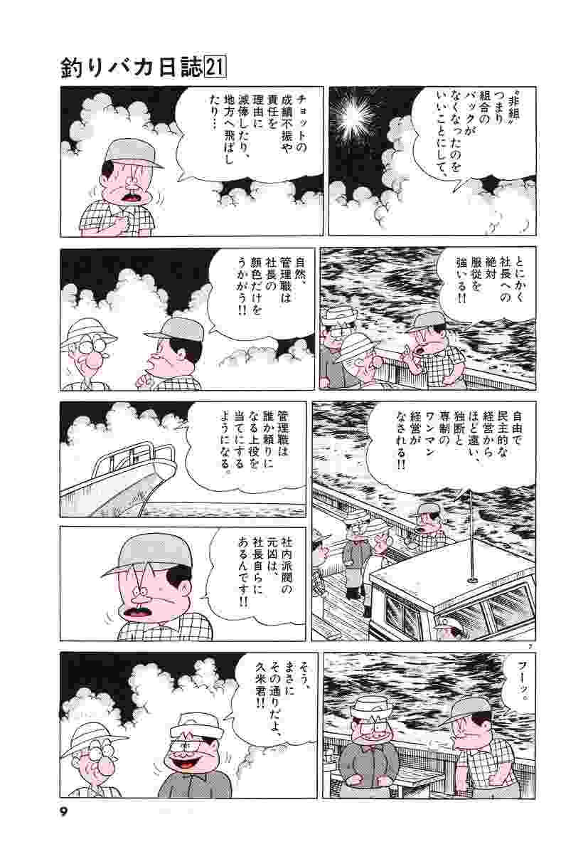 ご存じ“釣りバカ”ハマちゃんとスーさんが繰り広げる珍騒動!! ▼第1話/私は社長…!▼第2話/残暑お見舞い、てんてこ舞い▼第3話/覆水盆に返るか!?▼第4話/社長の緊急発令▼第5話/風林火山、ご乱心▼第6話/鈴(スー)さん、衣笠(てつじん)のように!?▼第7話/多胡氏の造反有理▼第8話/ハムレット佐々木▼第9話/釣るか振るか!? ●登場人物/浜崎伝助(釣りバカで万年ヒラのペケ社員)、鈴木一之助(鈴木建設社長)、佐々木和男(営業部長) ●あらすじ/営業三課の内紛をなんとか穏便に鎮めたいと思う佐々木さんは、クメハマコンビ(久米課長と伝助)の釣行に強引に参加する。釣りをしながら久米課長が折れるように説得しようというつもりだったのだ。ところが、そこに仲間外れにされまいと変装したスーさんが乱入。スーさんが実は鈴木社長であるとは知らない佐々木さんと久米課長は社長の悪口で意気投合してしまい……(第1話)。 ●本巻の特徴/この第21巻では、佐々木さんと久米課長が降格の危機にさらされる。はからずも、佐々木さんと久米課長の、社長である自分に対する不満を聞いてしまったスーさんが、2人を解雇も同然である企画調査室参与に異動という緊急発令を発してしまう……!(第4話) ●その他の登場キャラクター/営業三課課長・久米三郎(第1~3、5、6話)、営業担当重役・秋山(第3~10話)、鈴木社長の甥で次期社長と目される・多胡総務部長(第5~7話) ●その他のデータ/真鯛釣り(第1、2話)、イサキ釣り(第9話)、▼裏表紙の伝助釣り講座~コイ