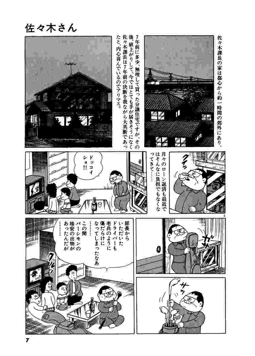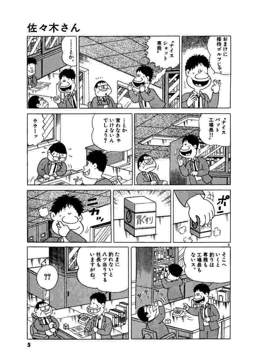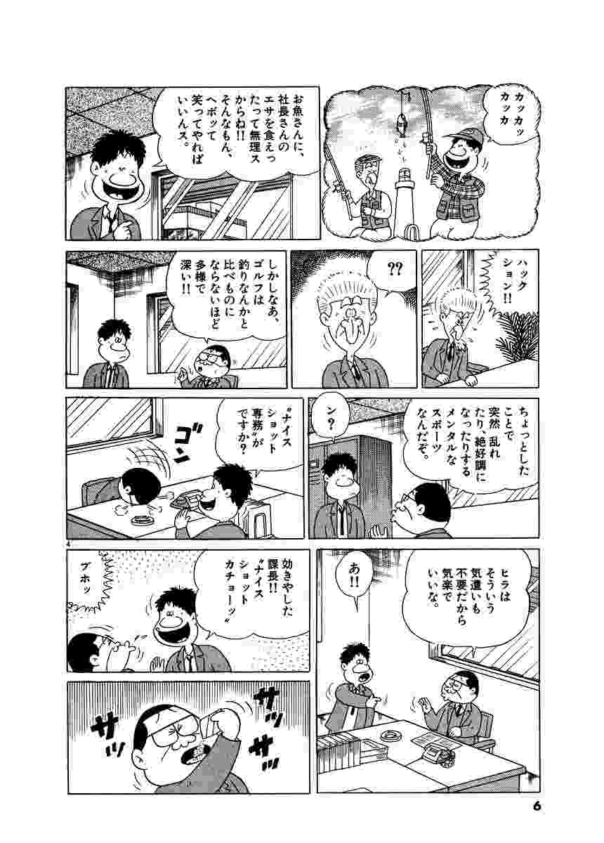 ハマちゃんばかりが主役じゃない。頑張れサラリーマン!! ▼第1話/課長ライフは胃薬が必要です▼第2話/賃上げ作戦はお早めに▼第3話/ダイエットはあわててはいけません▼第4話/結婚式が続くと困りませんか▼第5話/モテようと思う気持が大切です▼第6話/昇進しても張切り過ぎないように▼第7話/接待ゴルフは我慢ゴルフなのです▼第8話/コンペ組み合わせの公式はありません▼第9話/接待されたら堂々とした態度を▼第10話/会員権は地位と名誉のシンボルで▼第11話/デンと呼ばれた男▼第12話/愛は地球を救うのだ▼第13話/マツザカマンモス肉のエサ▼第14/釣りバカ伝蔵 ●登場人物/佐々木和男(鈴木建設営業三課課長)、浜崎伝助(釣りバカで万年ヒラのペケ社員)、鈴木一之助(鈴木建設社長) ●あらすじ/週末に接待ゴルフに出かけた佐々木さん。優勝賞品は、なんと佐々木さんが常々手に入れたいと願っていたパーシモンのドライバー。“最近の調子からすると優勝も充分狙えるが……イヤイヤ今日は接待ゴルフなんだからとんでもない”と葛藤する佐々木さんであった。ところが強風のため、皆そろって絶不調。ひとりだけ堅実にプレーを重ねる佐々木さんが1ホールを残して現在トップというからさぁ大変。わざとミスをしようとする佐々木さんだったが……(第1話)。 ●その他の登場キャラクター/営業部長・秋山(第1、7~9)