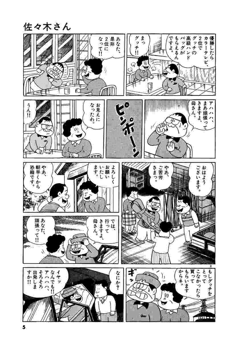 ハマちゃんばかりが主役じゃない。頑張れサラリーマン!! ▼第1話/招待ゴルフでは謙虚な態度が好感です。▼第2話/女子社員にモテたいですか。▼第3話/大ブロシキは疲れます。▼第4話/O.A機器に振りまわされていませんか。▼第5話/仲人も大切なおシゴトです。▼第6話/ライバルから塩を贈られたことはありますか。▼第7話/年頃の娘には虫がつきものです。▼第8話/財テクには向き不向きがあります。▼第9話/重役とは気まぐれな生き物なのです。▼第10話/銀河系からのお客様▼第11話/釣りバカじいさん▼第12話/鯉太郎、鬼が島へ▼第13話/さすらいのデーン▼第14話/団地のヤマちゃん野球バカ ●登場人物/佐々木和男(鈴木建設営業部部長)、浜崎伝助(釣りバカで万年ヒラのペケ社員)、鈴木一之助(鈴木建設社長) ●あらすじ/佐々木さんはどこにでもいそうなごくごく普通の部長さん。ところがそう滅多にないことが佐々木さんの身に起きた。テレビ局からの依頼で“部長さんちのお夕食”という番組に家族で出演することに。テレビ局からは“普段のままの食事風景”でと言われているが、そうはいってもミエは張りたいもの。カーペットまで新しく買って万全の体制で撮影に臨んだ佐々木さん一家だったが……(第3話)。 ●その他の登場キャラクター/秋山取締役(第7、8話)