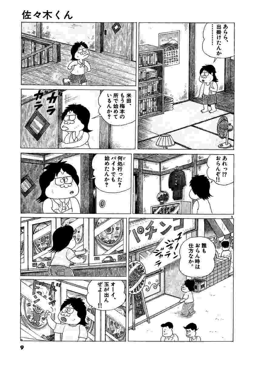 ハマちゃんばかりが主役じゃない。頑張れサラリーマン!! ▼第1話/大学は出るけれど▼第2話/就職戦線まっさかり▼第3話/入社式の遅刻▼第4話/歌う新人▼第5話/それは経費か横領か?▼第6話/花束でおとせ▼第7話/帰省は大変▼第8話/和男くんの蹉跌(さてつ)▼第9話/有馬(ありま)こりゃま▼第10話/幸福の青い尻▼第11話/たま多摩ニュータウン▼第12話/おいしいバツ ●登場人物/佐々木和男(鈴木建設取締役兼営業本部長兼営業三課長。典型的なニッポンの中間管理職)、佐々木くん(若かりし頃の佐々木さん。昭和40年代、今では比べ物にならないほど小さかった鈴木建設でがんばる若手営業社員) ●あらすじ/鈴木建設を受けに来た学生を面接していた佐々木さん。そこで「自分たちが学生の時は遊ぶ暇なんかなかった」と演説を始めてしまう。だが、今から約30年前、学生だった佐々木さんは、演説に値するほどの学生ではなかったようだ。時は1966年。高度成長にさらに拍車がかかってきた頃、大学4年生であった佐々木くんは、就職活動もせずにバイトとマージャンの生活に明け暮れていた。周囲の動きも知らず、会社回りは9月からだと信じていた佐々木くんは、実際は7、8月には内定がでると知り、あわてて就職活動を始めるのであったが……(第1話)。▼学校の求人広告で見つけた鈴木建設の面接に出掛けた佐々木くんであったが、もうすでに全員の内定が決まったところだと告げられてしまう。落胆する佐々木くんに、面接官は、「二股かけてる奴が取り消せばチャンスがある、それまで待つ気はあるか」と救いの言葉をかけた。その後数社を受けた佐々木くんであったが、いずれもほぼ内定を出しており、一人憂いの秋を迎えているのだった(第2話)。 ●本巻の特徴/第5巻では、佐々木くんが鈴木建設に入るまでのいきさつと、まるで今の浜崎ちゃんのようであった新人時代を中心に話が進んでいる。 ●その他の登場キャラクター/浜崎伝助(鈴木建設の×社員。本編の主人公)、鈴木一之助(鈴木建設社長)