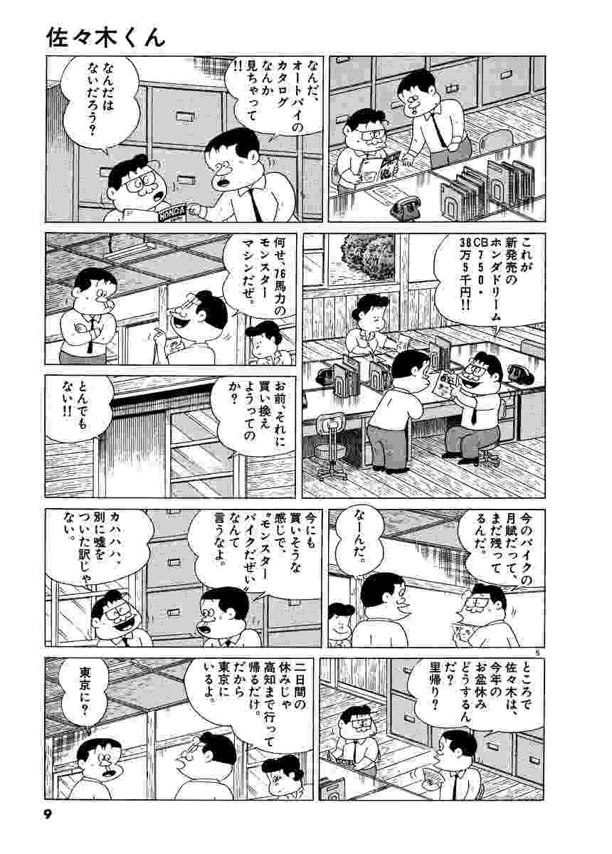 ●あらすじ/昭和44年、夏のボーナスをもらった佐々木くん(佐々木和男)。お盆休みはたった2日間なので、東京で過ごそうと思ったが、同僚に「彼女もいないのにどうやって過ごすの?」とからかわれてしまう。「俺だって」と社内の女性に声をかけまくる佐々木くんだったが、三球三振し…(第1話)。▼新米社員時代の佐々木くんの唯一の娯楽は、当時大ブームだったヤクザ映画を見ること。映画を見終わると、いつも自分が健さんになってしまったかのように振る舞ってしまう佐々木くん。ある日、いつものように健さんになりきって行きつけのスナックに行くと、人相の悪い奴等が入ってきて、店の立ち退きをママに迫り始めた。ついつい、横から「仁侠道も地に堕ちたもんだぜい」とタンカを切ってしまった佐々木くんは…(第2話)。