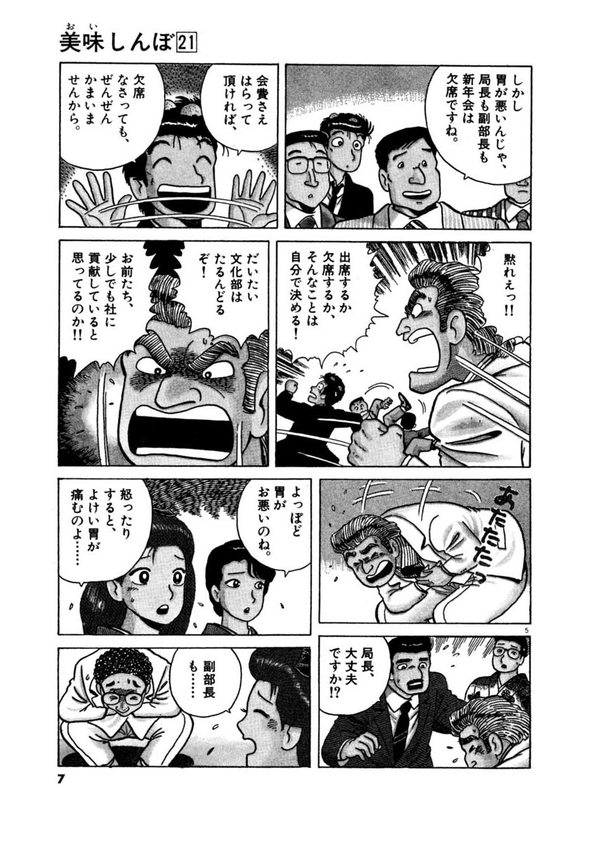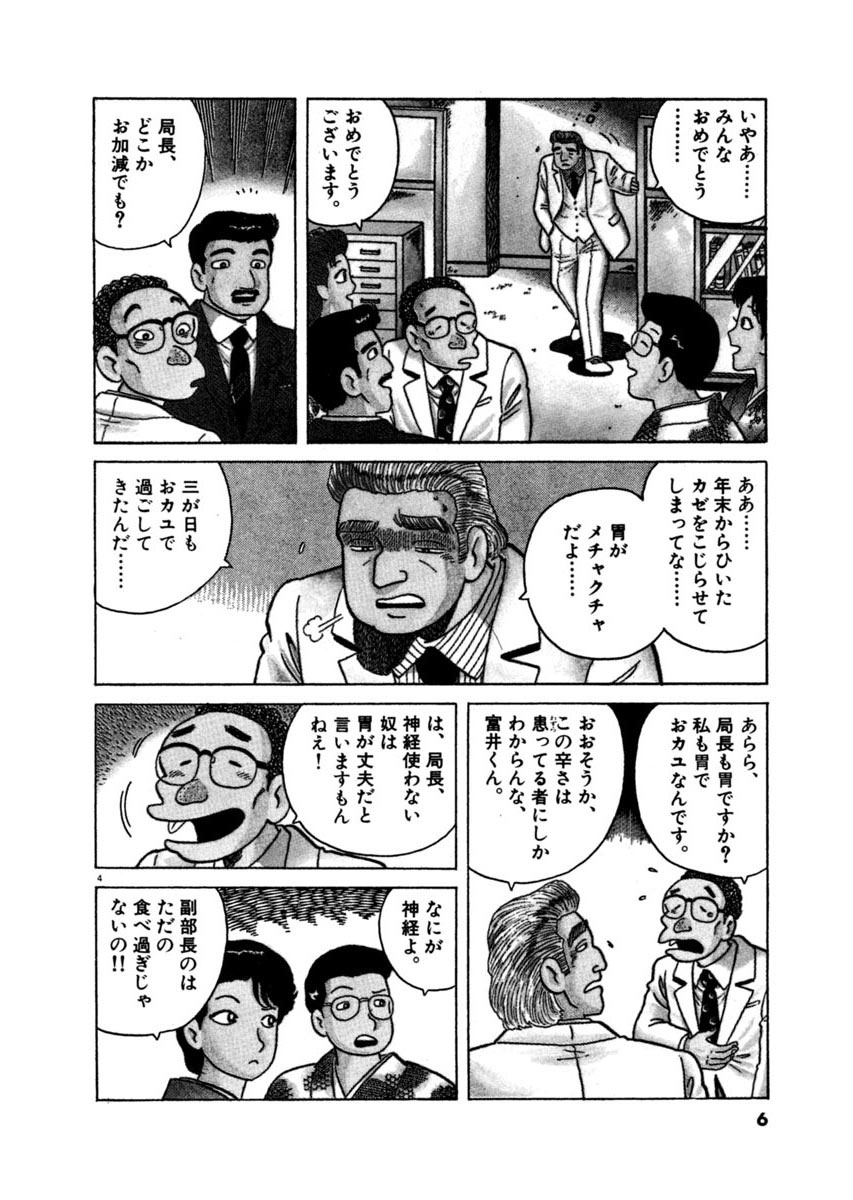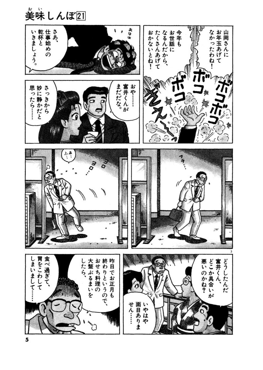 「食」ブームを巻き起こし、アニメ、映画化された大人気コミック! ▼第1話/穏やかな御馳走(おカユ)▼第2話/及第ガユ(及第ガユ)▼第3話/新しい企画(イノシシ鍋)▼第4話/禁断の鳥(ツグミ)▼第5話/挑戦精神(朴葉味噌)▼第6話/カジキの真価(マカジキの寿司・刺身)▼第7話/二人の花嫁候補(鮭の粕汁)▼第8話/日本の根っこ(握り飯、キュウリのヌカ漬け)▼第9話/辛し明太子▼第10話/命と器(ソバガキ) ●登場人物/山岡士郎(東西新聞文化部員・膨大な食の知識を持つ。東西新聞の壮大な企画「究極のメニュー」の作成を担当)。栗田ゆう子(東西新聞文化部員・山岡とともに「究極のメニュー」を担当する)。海原雄山(名だたる陶芸家にして、食の探究者。「美食倶楽部」主宰。山岡の実父) ●あらすじ/小泉編集局長と富井副部長がどうも苛立っている。二人とも、胃をこわしていたのだ。とはいえ、二人のあまりの小言攻勢に文化部は辟易。このままでは上司としての信頼さえ失ってしまいそうな状況だ。山岡は一計を案じ、文化部の新年会で、恒例の「食べ物自慢大会」を行なうことにした。さて、そのメニューは?(第1話)。▼胃の調子が戻ったはずなのに、小泉編集局長の様子がおかしい。話を聞くと、息子との意思の疎通がままならないという。どうも、エリート意識の強い小泉の言葉に傷ついてしまったらしい。非行化の様子さえうかがえる息子のために、山岡と中松警部が一肌ぬぐことになるが…(第2話)。 ●その他の登場キャラクター/快楽亭ブラック(第3話)、唐山陶人(第10話) ●その他DATA/表紙写真~瓢亭朝がゆ〔調理/瓢亭〕