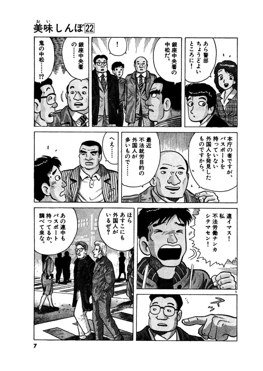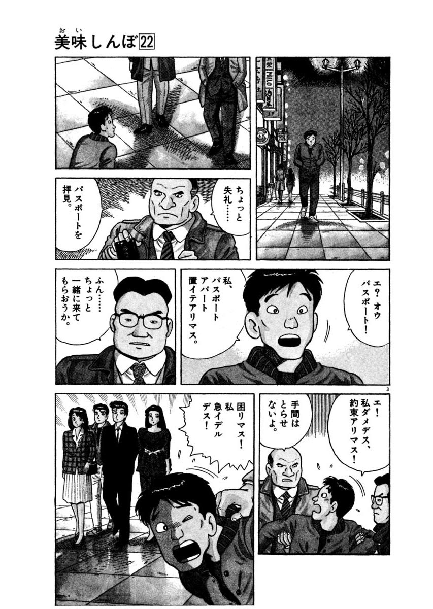 「食」ブームを巻き起こし、アニメ、映画化された大人気コミック! ▼第1話/食品成分表の怪(タイ料理)▼第2話/豆腐勝負!!・前編、中編、後編(汲み出し豆腐、ザル豆腐)▼第3話/韓国食試合!・1~4(韓国料理、牛肉のたたき風焼肉)▼第4話/新ジャガの幸(ジャガイモ)▼第5話/カンテンと恋(トコロテン、カンテン黒蜜) ●登場人物/山岡士郎(東西新聞文化部員・膨大な食の知識を持つ。東西新聞の壮大な企画「究極のメニュー」の作成を担当)。栗田ゆう子(東西新聞文化部員・山岡とともに「究極のメニュー」を担当する)。海原雄山(名だたる陶芸家にして、食の探究者。「美食倶楽部」主宰。山岡の実父) ●あらすじ/パスポートを家に置いて外出したために刑事に連行されそうになったタイ人の留学生を助けた山岡たちは、後日、そのお礼としてタイ料理店に招待された。だが隣席の日本人客が、タイ料理の悪口を言い始めた。そして店主が「日本の野菜はタイに比べて味が落ちる」と嘆いているのを聞きつけ、「発展途上国のくせに大きなことをいうな」と暴言を吐く。そこで山岡は、日本の野菜の末期的な現状を彼らに教えることに…(第1話)。▼富井副部長が怒りだした。山岡たちが東西グラフの「世界味めぐり」の仕事にかまけて、「究極のメニュー」が一向に進展していないというのだ。谷村部長もその意見に同意。次回の至高のメニューとの対決に勝たねば、東西グラフへの山岡の協力を打ち切ると厳命した。山岡に降りられては困るまり子は一計を案じ、おチヨに至高側のメニューをスパイしてくれと頼むが…(第2話)。 ●その他の登場キャラクター/中松警部(第1、5話)、京極万太郎(第2話)、唐山陶人(第2、4話) ●その他DATA/表紙写真~骨付カルビ〔調理/ソウル〕