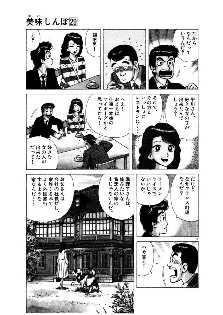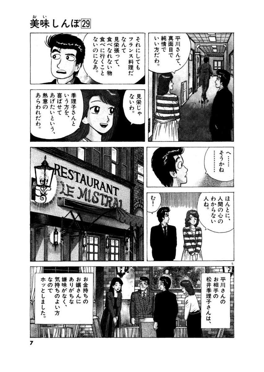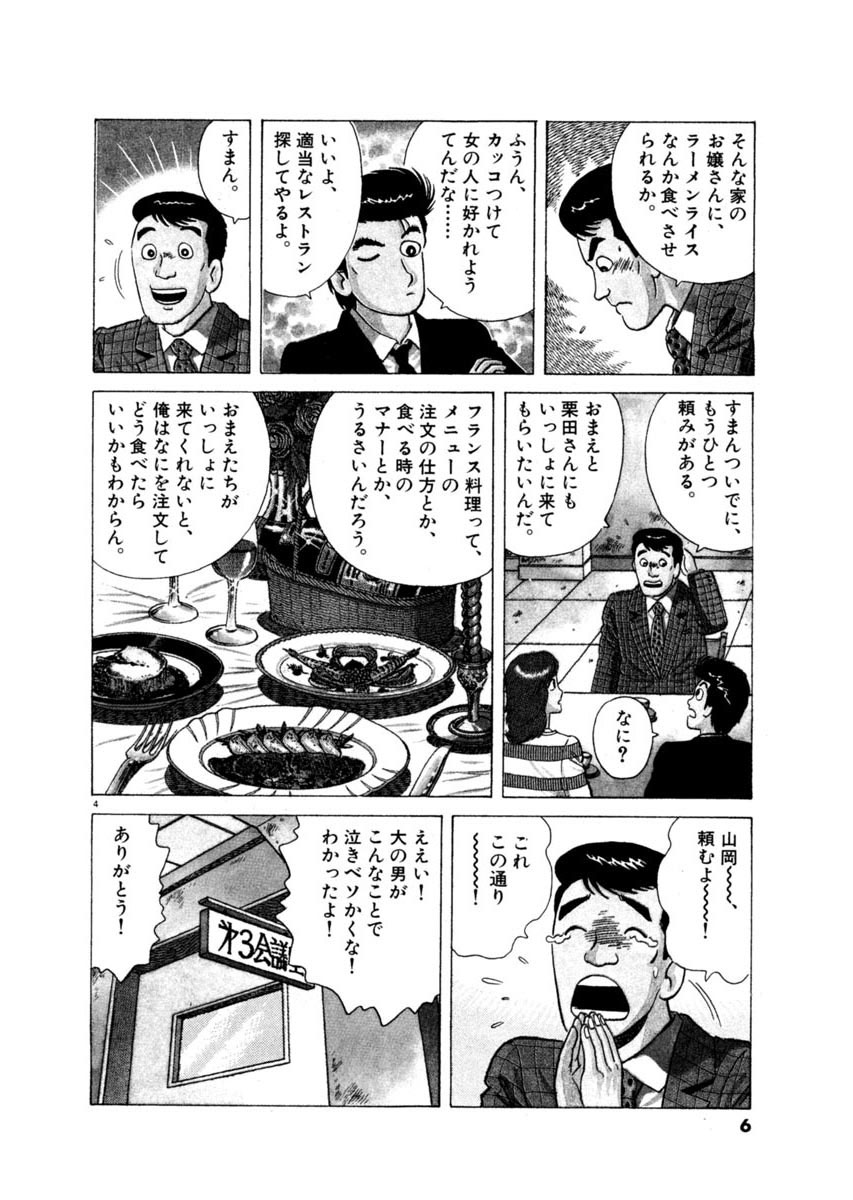 「食」ブームを巻き起こし、アニメ、映画化された大人気コミック! ▼第1話/フランス料理とラーメンライス▼第2話/天日の贈り物(アジの干物)▼第3話/東西うどん合戦▼第4話/美味しい暗号(アワビのシャブシャブ)▼第5話/親子のきずな(親子丼)▼第6話/灼熱のお茶(水出し玉露)▼第7話/「究極」の弱点・前編、中編、後編(鶏のボンボチの串焼き、ギンナンご飯、カツオの中落ち) ●登場人物/山岡士郎(東西新聞文化部員・膨大な食の知識を持つ。東西新聞の壮大な企画「究極のメニュー」の作成を担当)。栗田ゆう子(東西新聞文化部員・山岡とともに「究極のメニュー」を担当する)。海原雄山(名だたる陶芸家にして、食の探究者。「美食倶楽部」主宰。山岡の実父) ●あらすじ/化学部・平川が山岡たちに、いいフランス料理店を紹介してくれと頼んできた。実は最近、お金持ちの令嬢・季理子と付き合い出したのだが、普段はラーメンライス専門の平川には、彼女をつれて行けるような店の心当たりがない。おまけに、メニューやマナーの知識もないので、デートに付き合ってくれないかという。そしてそのデート当日、平川の顔を潰さないようにしながら、フランス料理店での作法を教えて行く山岡だが…(第1話)。▼猫好きの小泉編集局長が新しい子猫を手にいれた。今度の猫は両親ともにチャンピオンという血統の子猫。だが、どんな食べ物もまったく口にしないという。元の飼い主に「アジの干物が大好物」と助言を受け、早速与えてみたが、顔を背けていっこうに食べようとしない。小泉の命令で、子猫のための干物選びをさせられるハメになった山岡だが、デパートの干物売場である事実に気がつく(第2話)。 ●その他の登場キャラクター/中松警部(第5話)、唐山陶人(第7話)、京極万太郎(第7話) ●その他DATA/表紙写真~あわびのシャブシャブ〔調理/REAGAL RESTAURANT〕