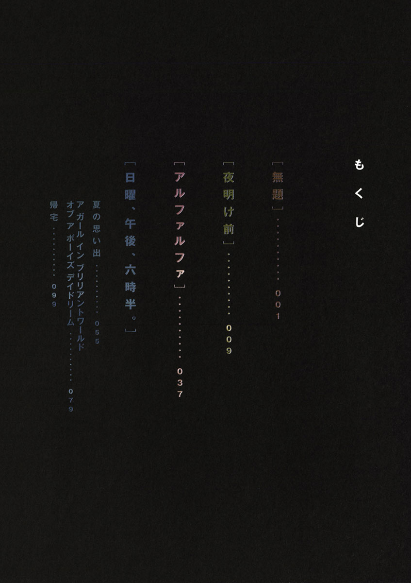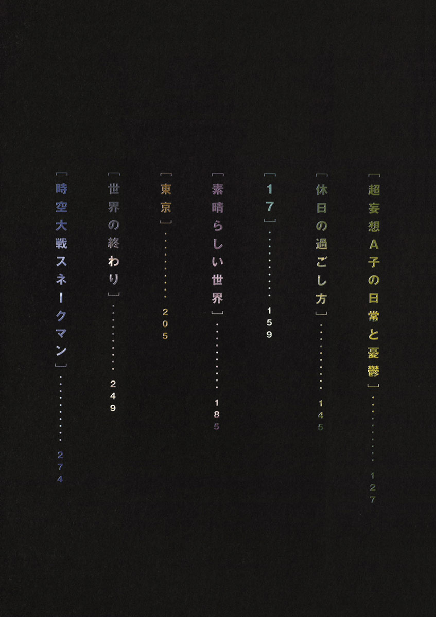 ▼無題▼夜明け前▼アルファルファ▼日曜、午後、六時半。(夏の思い出/ア ガール イン ブリリアント ワールド オブ ア ボーイズ デイドリーム/帰宅)▼超妄想A子の日常と憂鬱▼休日の過ごし方▼17▼素晴らしい世界▼東京▼世界の終わり▼時空大戦スネークマン