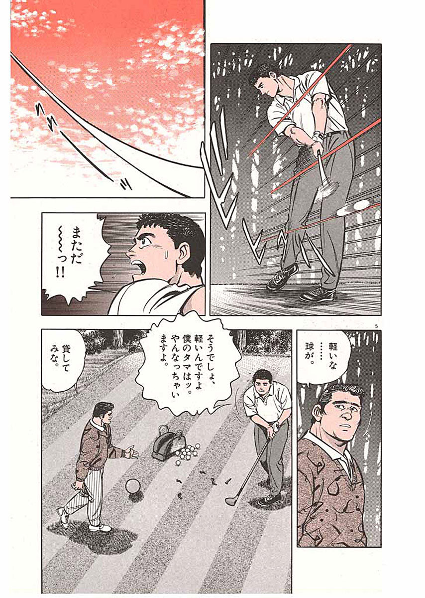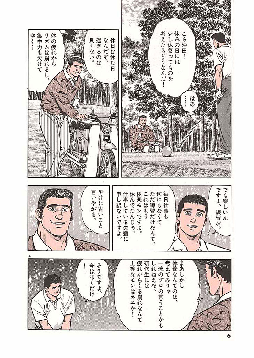 ゴルフに全てを賭けた男・沖田圭介の青春を叙情豊かに綴った物語 ▼第1話/鉄棒ドライバー▼第2話/蟻の命▼第3話/琵琶湖へ▼第4話/気合いトップ▼第5話/電線ショット▼第6話/宇賀神の雲▼第7話/瞬間湯沸かし機▼第8話/計算▼第9話/明暗▼第10話/煙突 ●登場人物/沖田圭介(鹿沼カントリークラブの研修生。プロゴルファーを目指す24歳)、宇賀神正行(研修生の食事の世話などをしているセカンド・チーフで、沖田のよきアドバイザー。肝臓癌を患っている)、笠崎孝(沖田の先輩。通称夜這いの孝ちゃん) ●あらすじ/球質が悪くなってきていることに悩んでいる沖田。練習の様子を見に来た宇賀神は、沖田が使っているクラブを見て、クラブがヘッドスピードを支え切れていないことに気付く。そこで宇賀神は、1本のドライバーを沖田に渡した。それは、今まで誰にも触らせたことのない大切なクラブだった(第1話)。▼支配人は、喫茶室で宇賀神らと談笑していた。いつもと変わらない様子の宇賀神だが、はっきりと分かる彼の痩せぶりを見て、医師の依田に入院の相談をする。一方沖田は、練習場で、蟻の巣の上に乗ったボールをめぐり、長谷川とケンカを始めてしまう…(第2話)。 ●本巻の特徴/第4巻で、沖田はプロテストに合格、念願のプロゴルファーになった。しかし、喜びもつかの間、兄のように慕っていた宇賀神が亡くなってしまったことを知る。悲しみから立ち直った沖田は、プロゴルファーとして、ツアーに生きる決意を新たにする。 ●主な登場キャラクター/長谷川博(第1~2話)、依田先生(第1、3~5、7~8話)、石原建(第2、6、9~10話)、支配人(第1~3、6、8~9話)キャディーマスター・山本(第4~8話)、小平(第9~10話)