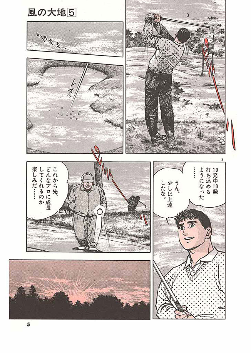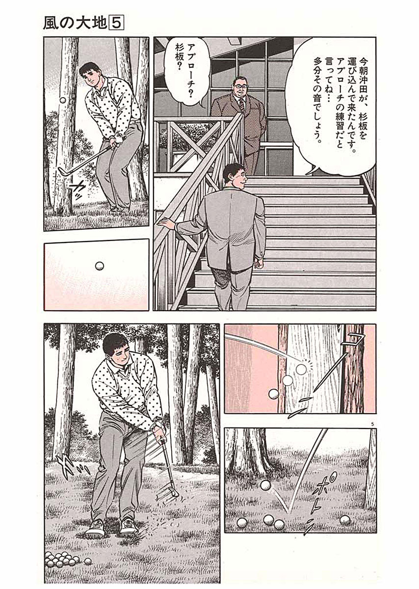 ゴルフに全てを賭けた男・沖田圭介の青春を叙情豊かに綴った物語 ▼第1話/わかれ▼第2話/イチョウの精▼第3話/せん別▼第4話/アジアサーキット▼第5話/フルスイング▼第6話/誤解▼第7話/グッド・ガイ▼第8話/アドバイス▼第9話/誘い ●登場人物/沖田圭介(鹿沼カントリークラブ初のプロゴルファー)、笠崎孝(沖田の先輩。通称夜這いの孝ちゃん)、チッタ(アジアサーキット第1戦での沖田のキャディ。フィリピン人) ●あらすじ/プロテストが終わってから2か月が過ぎた。沖田は、プロになったものの、まだトーナメント戦の出場資格は持っていない。そんな沖田に、資格を得る前に腕試しとしてアジアサーキット全戦に出場させてはどうかと、小針プロから提案があがった(第1話)。▼アジアサーキット間近のある日、沖田は歯の治療に行った。治療を待つ間に立ち寄った神社で、沖田は美しい女性に出会う。一方、凄みが増してきた沖田のプレーを見た笠崎と長谷川は、プロへの気持ちを新たにするのだった(第2話)。 ●本巻の特徴/第5巻では、沖田はフィリピンで行なわれたアジアサーキット第1戦で初陣を飾る。ここでも沖田の実力は遺憾なく発揮され、3日目を終えて5位に食い込む。 ●主な登場キャラクター/小針春芳(第1、4、6、8~9話)、支配人(第1~3話)、長谷川博(第1~3話)、石原建(第1、3話)、物部麗子(第2話)、ロジャー・デービス(第4~8話)、ボビー・ブロー(第4~8話)、笠崎孝(第9話)
