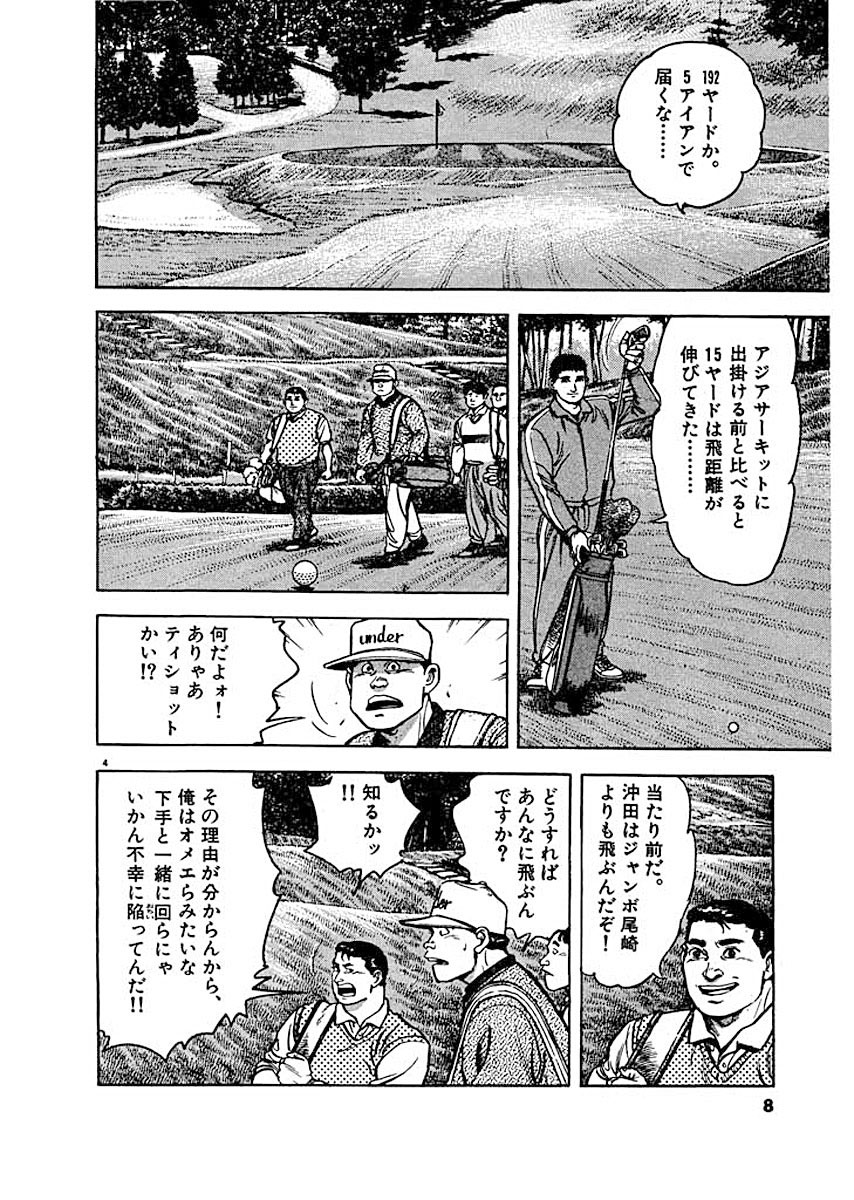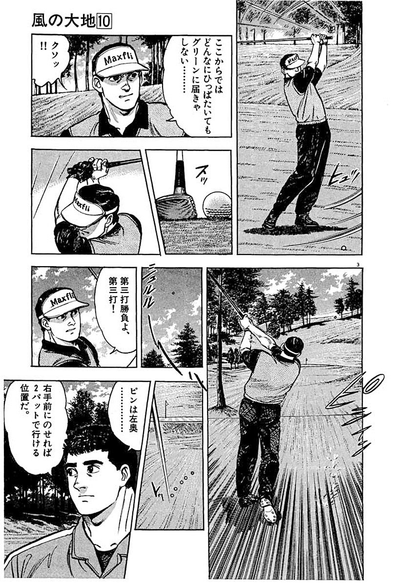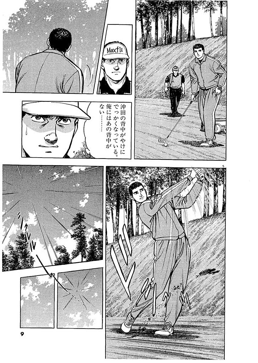 ゴルフに全てを賭けた男・沖田圭介の青春を叙情豊かに綴った物語 ▼第1話/勝負の借り▼第2話/男鹿へ▼第3話/愛の気配▼第4話/日本プロ▼第5話/低い球▼第6話/嵐の前ぶれ▼第7話/風よ吹け▼第8話/風の癖▼第9話/一滴の不信 ●登場人物/沖田圭介(鹿沼カントリークラブ初のプロゴルファー)、長谷川博(鹿沼カントリークラブの研修生) ●あらすじ/鹿沼帰ってきた沖田は、彼に異様なまでの敵愾心を持つ研修生の長谷川博とプライドを賭けたホールマッチを行なう。どちらかが負ければ、相手のキャディをしなくてはならない。沖田に負けまいと、長谷川は日頃の練習の成果をここぞとばかりに発揮するが…(第1話)。▼ある日沖田は、彼の憧れの女性、物部麗子の家に笠崎とともに夕食に招待された。この突然の招待は、実は笠崎が気をきかせてこっそり手を回したものであった。日本プロゴルフを前にした沖田は、楽しいひとときを過ごすことができた(第2話)。 ●本巻の特徴/第10巻では秋田で行なわれた日本プロゴルフ選手権の様子を中心に描いている。沖田はここでジャンボ尾崎と再び対戦する。そしてそこには、物部麗子も応援に来ていた。 ●その他の登場キャラクター/笠崎孝(第1~2話)、物部麗子(第1~4、7~9話)、高橋明美(第1~2、4~5、7、9話)、小平(第2話)、菅原治(第2~9話)、ジャンボ尾崎(第4~5、7~9話)