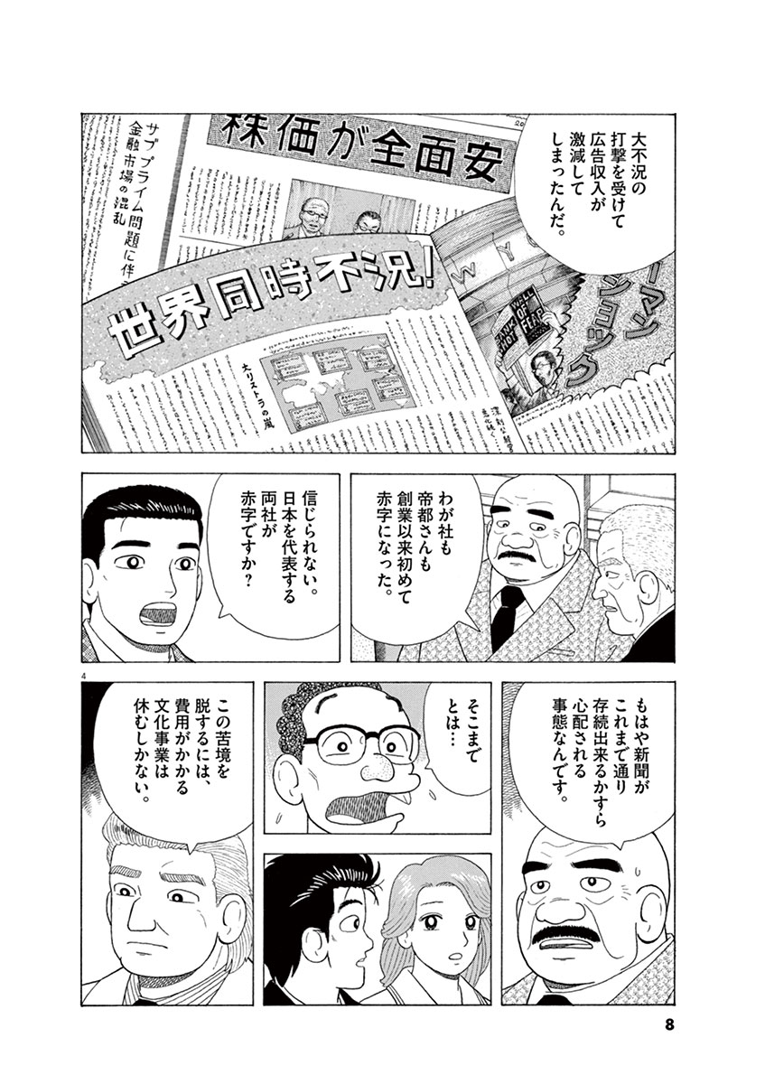 ●あらすじ/「究極のメニュー」「至高のメニュー」それぞれの仕事を次期担当に受け渡し、ひと呼吸ついていた士郎と雄山。しかし、折からの金融崩壊のあおりを受けた新聞不況で、メニュー編纂の母体である東西新聞・帝都新聞が、企画自体を取りやめたいと申し入れてきた。それを聞いた雄山は、こんな時期だからこそ食べて欲しいものがあるといい、一同を和歌山県直営の物産館へと連れだして…(第1話)。
