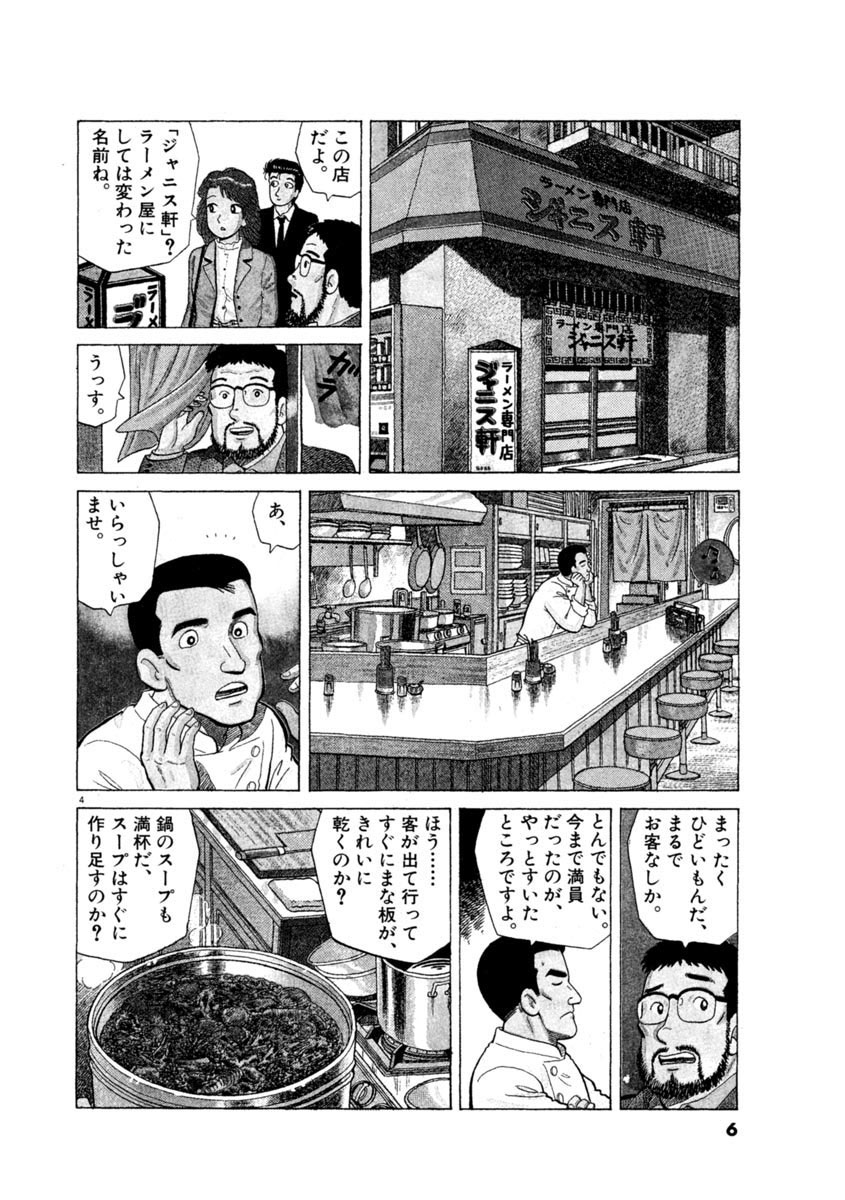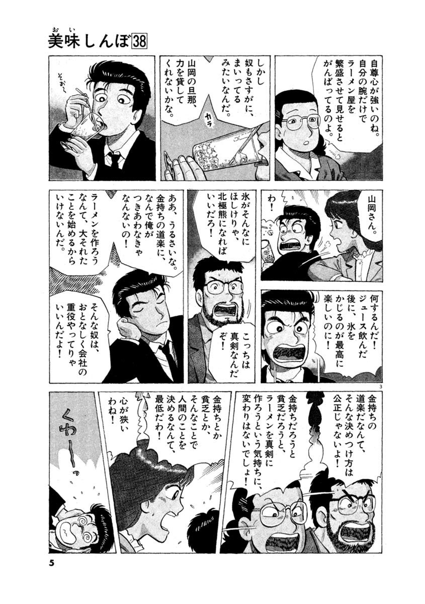 「食」ブームを巻き起こし、アニメ、映画化された大人気コミック! ●登場人物/山岡士郎(東西新聞文化部員・膨大な食の知識を持つ。東西新聞の壮大な企画「究極のメニュー」の作成を担当)。栗田ゆう子(東西新聞文化部員・山岡とともに「究極のメニュー」を担当する)。海原雄山(名だたる陶芸家にして、食の探究者。「美食倶楽部」主宰。山岡の実父) ●あらすじ/山岡は、荒川夫妻から夫妻の友人の橋田という男のことで相談を受ける。彼は大手自動車会社の御曹子で、その将来を嘱望されていたにも関わらず、会社を辞めてラーメン屋を始めたという変わった経歴の持ち主。ところが、そのラーメン屋がまったく繁盛しないという。山岡は、まず皆をおいしいと評判の屋台“流星一番亭”に連れていく。“流星一番亭”は、目星をつけたラーメン屋の近くに屋台を出し、客を奪うことでその店を乗っ取って傘下に入れるという強引なやり方で、急成長しているチェーン店だった。その“流星一番亭”に目を付けられた“金銀軒“の母子と、ひょんなことから知り合った山岡たちは、“流星一番亭”に負けないラーメン作りに取りかかるが……(第1話)。 ●本巻の特徴/この第38巻では全編を通してラーメンについての話が描かれる。その中で、日本人がなぜこんなにもラーメン好きの民族なのかという謎にもせまっており、非常に興味深いストーリーになっている。 ●その他の登場キャラクター/荒川カメラマン、おちよ(第1話)、 ●その他DATA/表紙写真~ラーメン