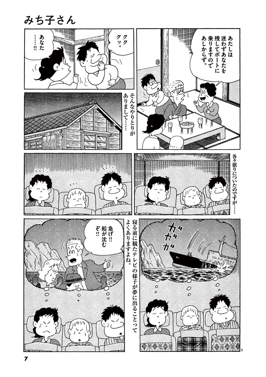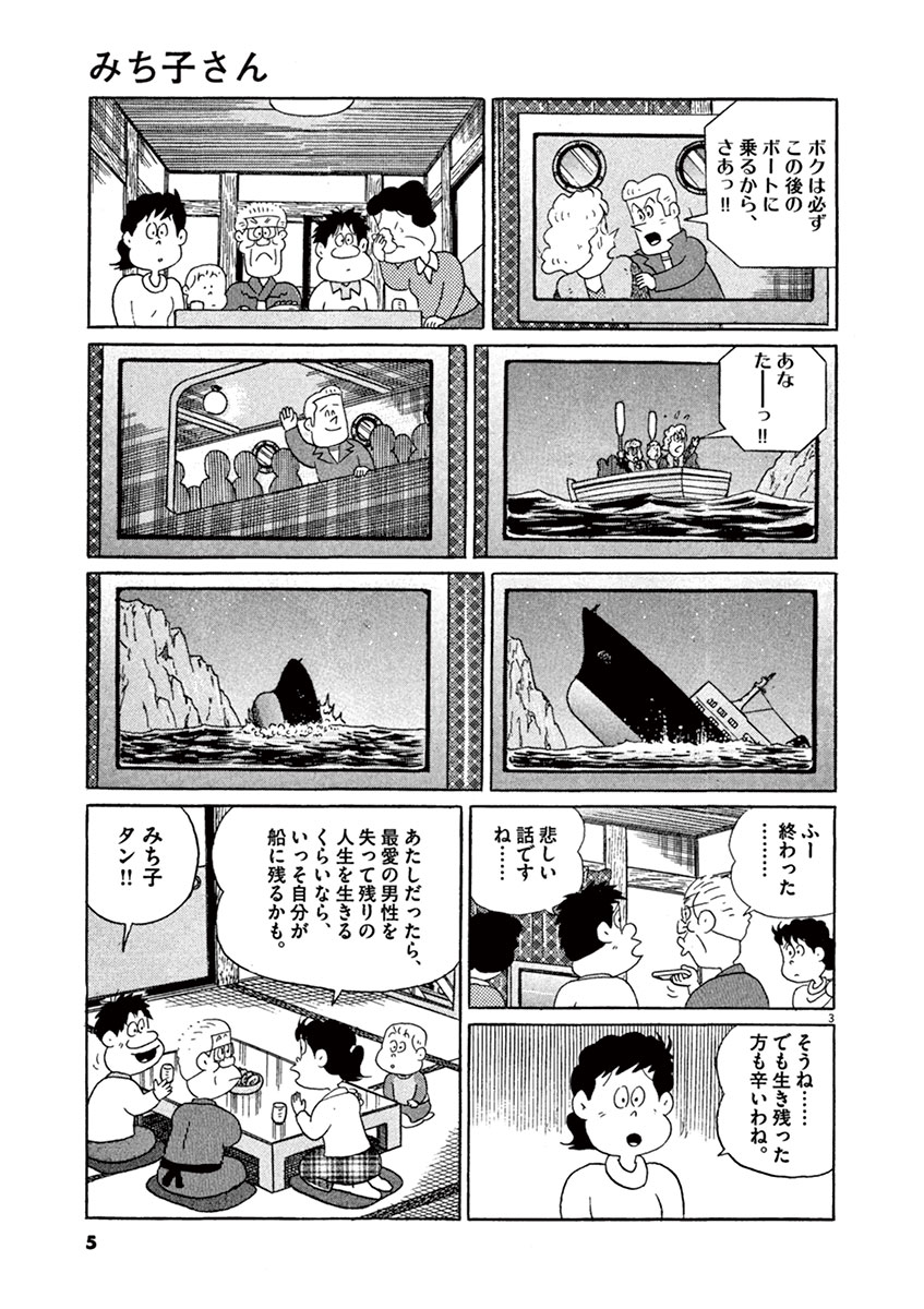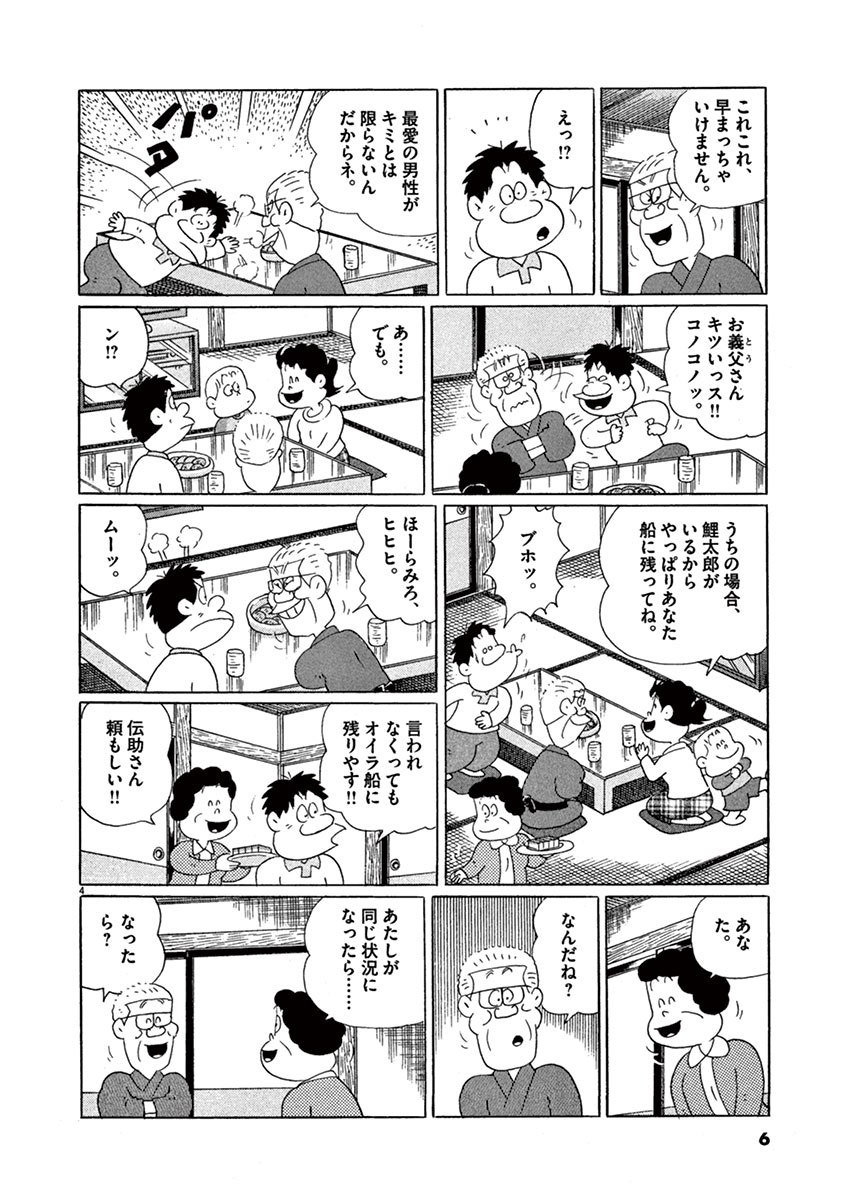 ●あらすじ/豪華客船が沈没していく最中、男は恋人を救命ボートに乗せ、自分は船と運命を共にする…そんな映画を家族で観ていたみち子。翌日、いつにもまして犬のハゼタローの世話に励む鯉太郎を見て、みち子は褒めてあげるのだが、鯉太郎は沈没船にハゼタローを置き去りにする夢を見てしまったと落ち込んでいて…!?(第36話)