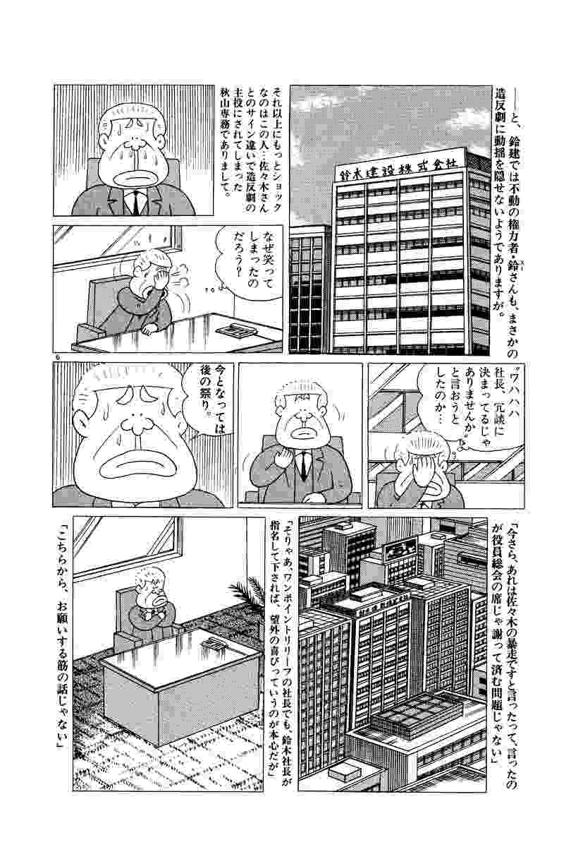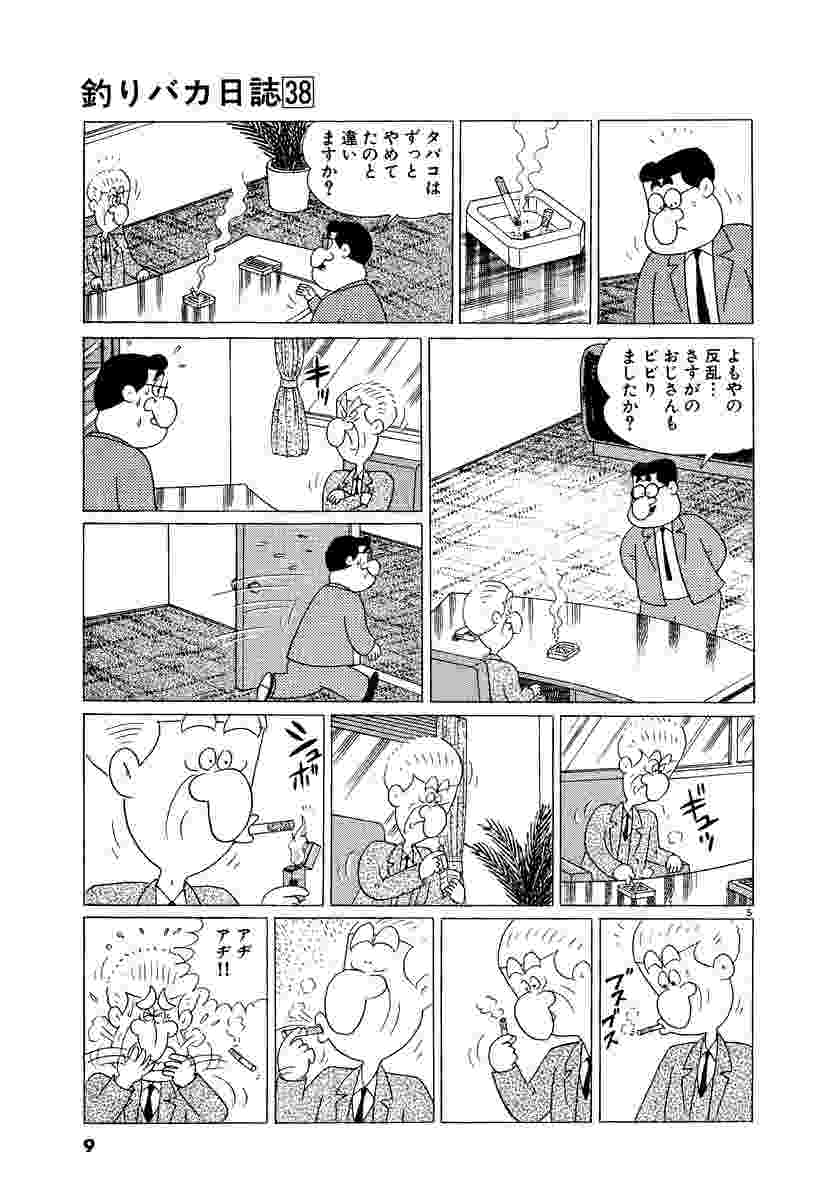 ご存じ“釣りバカ”ハマちゃんとスーさんが繰り広げる珍騒動!! ▼第1話/きつい知らんぷり▼第2話/悩める人々、決戦前夜▼第3話/野良猫、大弱り▼第4話/親の総取りじゃ!▼第5話/君は俺、俺は君▼第6話/釣りバカ、釣りに目覚める▼第7話/つれない奴▼第8話/出世の条件▼第9話/生命保険に入った理由 ●主な登場人物/浜崎伝助(釣りバカで万年ヒラのペケサラリーマン)、鈴木一之助(鈴木建設社長。伝助の影響で釣りバカに)、浜崎みち子(伝助氏には過ぎた明るく賢い奥さん)、浜崎鯉太郎(伝助、みち子の可愛いひとり息子)、佐々木和男(鈴木建設取締役兼営業本部長兼営業部第三課課長) ●あらすじ/自分は末期ガンだと勘違いしたままの佐々木さん。余命幾ばくもないと悟った彼は、役員会議で「社長は辞任して、秋山専務が跡を継ぐべき」と爆弾発言をしてしまう。もちろん一番驚いたのは、他ならぬ秋山専務で…(第1話)。▼結局自分はただの軽い胃炎だと知った佐々木。これで安心…のはずだけれど、先の爆弾発言でとてもじゃないけど会社に行けない。一方宣戦布告された一之助も「受けてたつ」とばかりに戦闘準備に入る(第2話)。 ●本巻の特徴/一之助の社長進退問題を中心に、役員たちの権力争いがコミカルに描かれる。 ●その他の登場人物/鈴木建設専務・秋山(第1、2、3、4、5、6、7、8、9話)、鈴木社長の甥・多胡常務(第1、2、3、4、5、6、7、8話) ●その他のデータ/クロダイ・メジナ釣り(第6話)、イシダイ釣り(第7、8、9話)▼裏表紙の伝助釣り講座~イシダイ