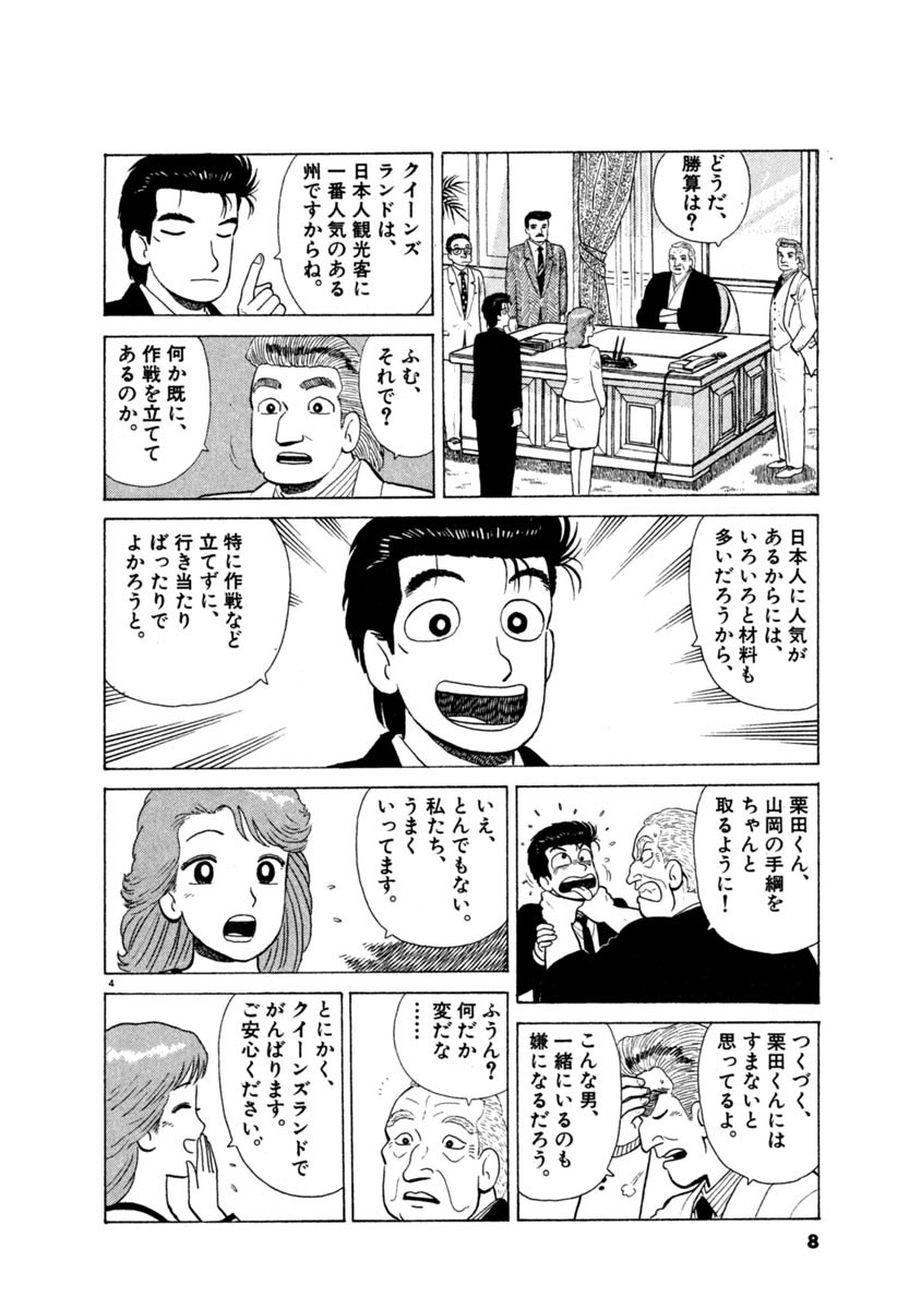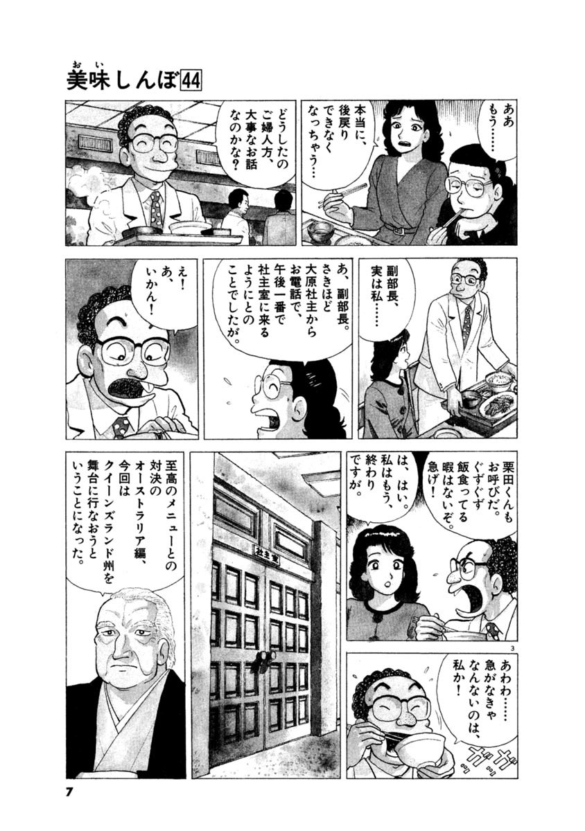 「食」ブームを巻き起こし、アニメ、映画化された大人気コミック! ▼第1話/熱闘!クイーンズランド・1~4(帆立てのラビオリ、グローバーの鍋、ダチョウステーキ・グリーンペパーソース、ライチィ、スパナー・クラブのラビオリ、バラマンディの木の皮包み焼き、ダチョウステーキ・ラム酒ソース、コーヒーの実)▼第2話/とんでもない親友・前編、後編(チョコレート・ケーキ、アップルパイアップル・ストゥリューデル、ザッハ・トルテ)▼第3話/心の傷・前編、後編(スズキのうしお汁、スズキの中落ち焼き、スズキの刺身、ハマグリのコロッケ、キャベツの鶏ガラスープ) ●登場人物/山岡士郎(東西新聞文化部員・膨大な食の知識を持つ。東西新聞の壮大な企画「究極のメニュー」の作成を担当)。栗田ゆう子(東西新聞文化部員・山岡とともに「究極のメニュー」を担当する)。海原雄山(名だたる陶芸家にして、食の探究者。「美食倶楽部」主宰。山岡の実父) ●あらすじ/究極VS至高の対決のオーストラリア編、今回はクイーンズランド州を舞台に行なわれる事となった。取材旅行のメンバーはいつもと同じ山岡、ゆう子、近城、まり子の4人。だが、今回はちょっと事情が違う。近城とまり子の二人はお互いに結婚したいと思っているのだが、それぞれ山岡とゆう子に振られた者同士。山岡たちの結婚が決まったからといって、すぐにプロポーズしては相手を代用品のように扱っているようで、何とも言い出しにくいと二人とも思っているのだ。それを知った山岡とゆう子は今回の取材旅行中に、何とか二人の気持ちを通じ合わせられないかと考えていた…(第1話)。▼上井は山岡の同級生のライター。久しぶりに彼とあった山岡は、ゆう子をフィアンセとして紹介した。だが上井は自分の才能を自慢したり、ゆう子をジロジロと値踏みしたりと、何ともイヤな男だった。「あんな男と付き合うな」と言うゆう子に対し「友だちなんだから仕方がない」と反発する山岡。ところが、後日、ゆう子が山岡に紹介した女友だちというのが、またクセ者で…(第2話)。 ●その他の登場キャラクター/唐山陶人、京極万太郎(第1話)、「岡星」主人(第3話) ●その他DATA/表紙写真~ダチョウのステーキ〔調理/ローズ・ド・サハラ〕