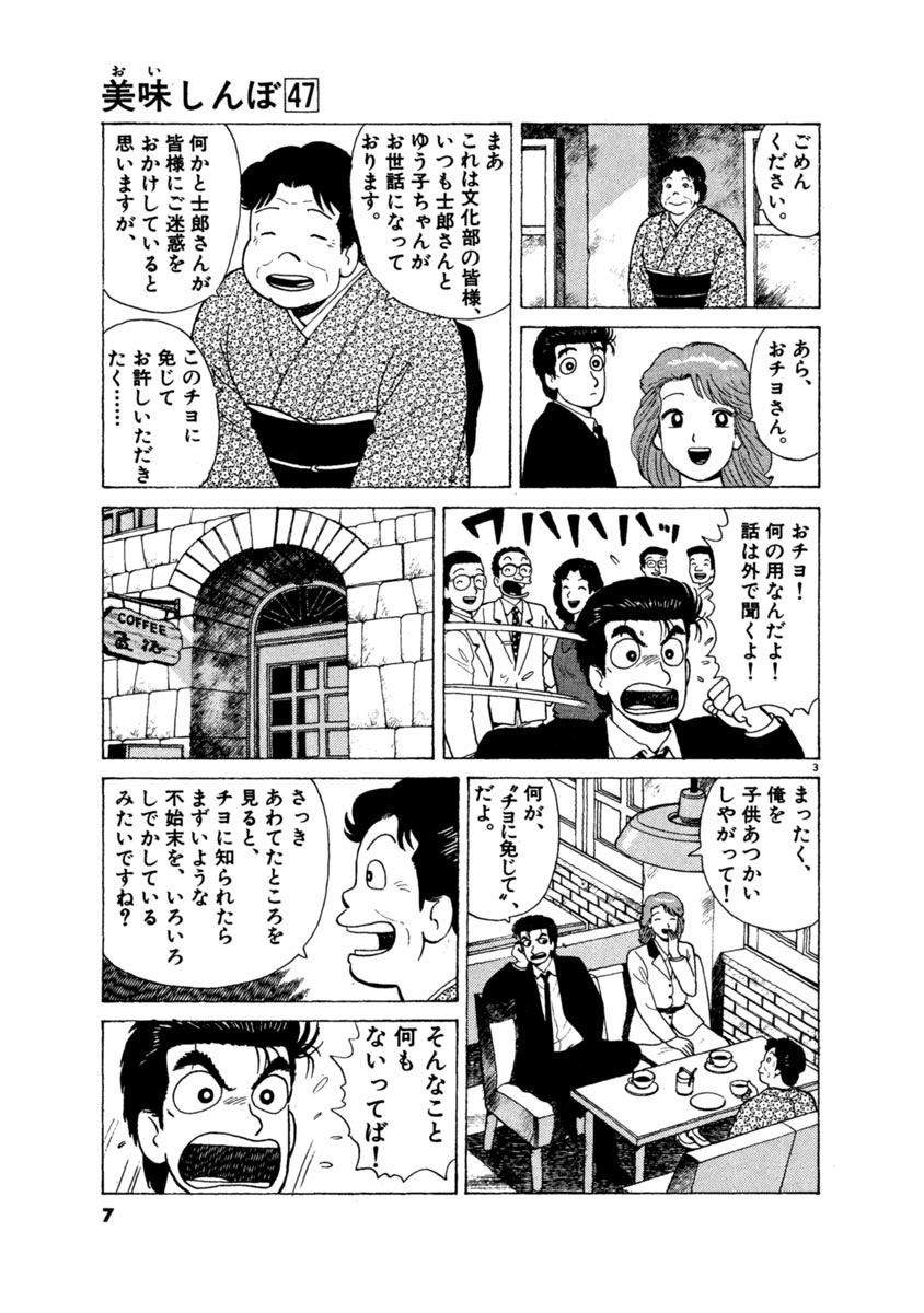 「食」ブームを巻き起こし、アニメ、映画化された大人気コミック! ▼第1話/花嫁の父・1~4(しめサバのサンドイッチ、ゴマ入りかき餅キャヴィアのせ、ソバのトマトソース、子牛のカルパッチョ、牛の腿の骨髄フォアグラソース、コンペイトウ)▼第2話/病の秘密・前編、後編(生麸、ヒラメの薄造り、鍋焼きうどん)▼第3話/結婚披露宴・1~7(鯨の尾の身の刺身、鯛の刺身、大根の一夜漬け、鰯の焼物、豆腐のあんかけ、鶏のモツと大根の煮物、ゆで卵のトリュフソースかけ、大トロのあぶり、豆腐よう、フグの唐揚げ、牛肉の刺身、ファッテューチョン、鯛の細造り、鴨丸の椀、マナガツオの味噌幽庵焼き)▼特別架空座談会・四人で話しましょう ●登場人物/山岡士郎(東西新聞文化部員・膨大な食の知識を持つ。東西新聞の壮大な企画「究極のメニュー」の作成を担当)。栗田ゆう子(東西新聞文化部員・山岡とともに「究極のメニュー」を担当する)。海原雄山(名だたる陶芸家にして、食の探究者。「美食倶楽部」主宰。山岡の実父) ●あらすじ/東西新聞文化部に、おチヨが訪ねてきた。山岡たちの披露宴に招待されたことに礼を言いに来たのだ。だが、彼女にはもうひとつ、山岡にどうしても頼みがあるという。一生のお願いだから、結婚を機会に雄山と仲直りをしてくれというのだ。それだけは出来ないと、耳を貸さずに立ち去る山岡。残されたゆう子とおチヨの前に、やはり結婚を間近に控えた近城と二木まり子が現れた。実は、まり子の祖父が「山岡たちの披露宴で究極のメニューを出すのなら、まり子たちも同じ事をして貰え」と言い出して困っているという。だが、大原社主は「会社の財産でもある究極のメニューを使い回すなど、認められん」と、これを許さない。だが、ゆう子はこの二つの問題を解決する妙案を思いついたという。そのアイデアとは…(第1話)。▼所帯道具を買いにデパートにやって来た山岡たち。買物に夢中のゆう子に付き合いきれず、一人で休憩していた山岡は、ひと組の老夫婦と意気投合した。一方、ゆう子は作品展の打合せのため来店していた雄山と出会っていた。そして実は、老夫婦の夫が雄山の妻、つまり山岡の母の主治医であったことが判明する。それを知ったゆう子は、元医師の老人に山岡の母の死の真相を問いただすが…(第2話)。