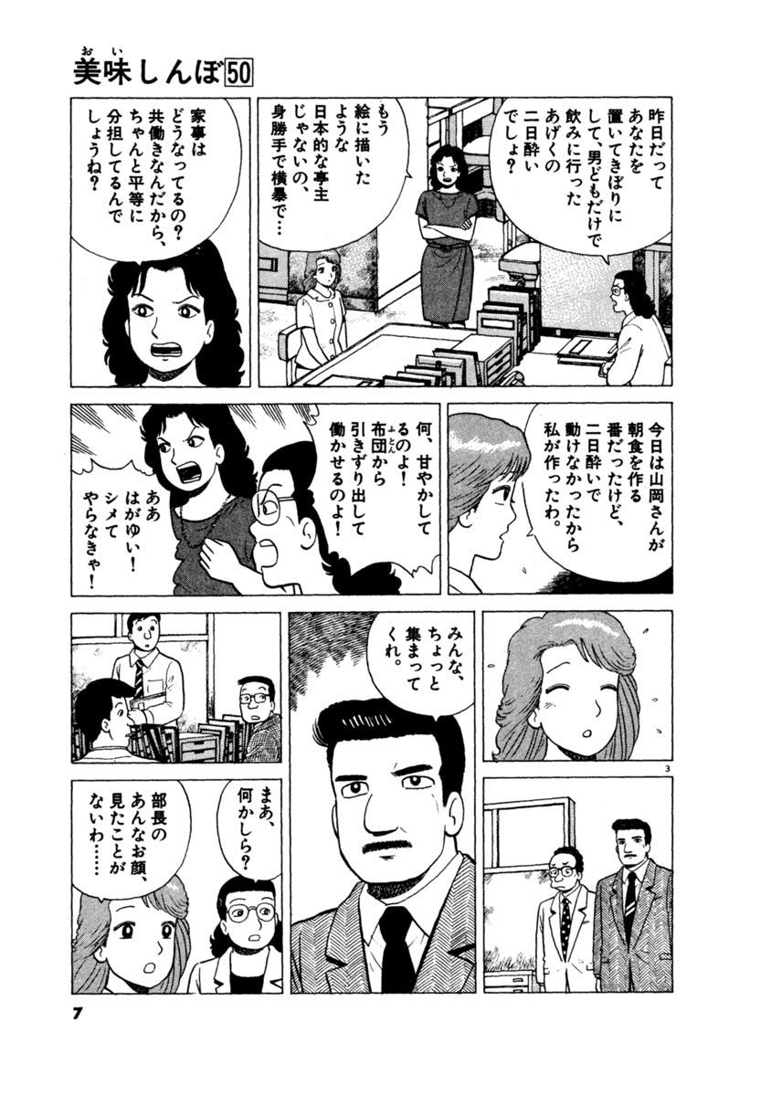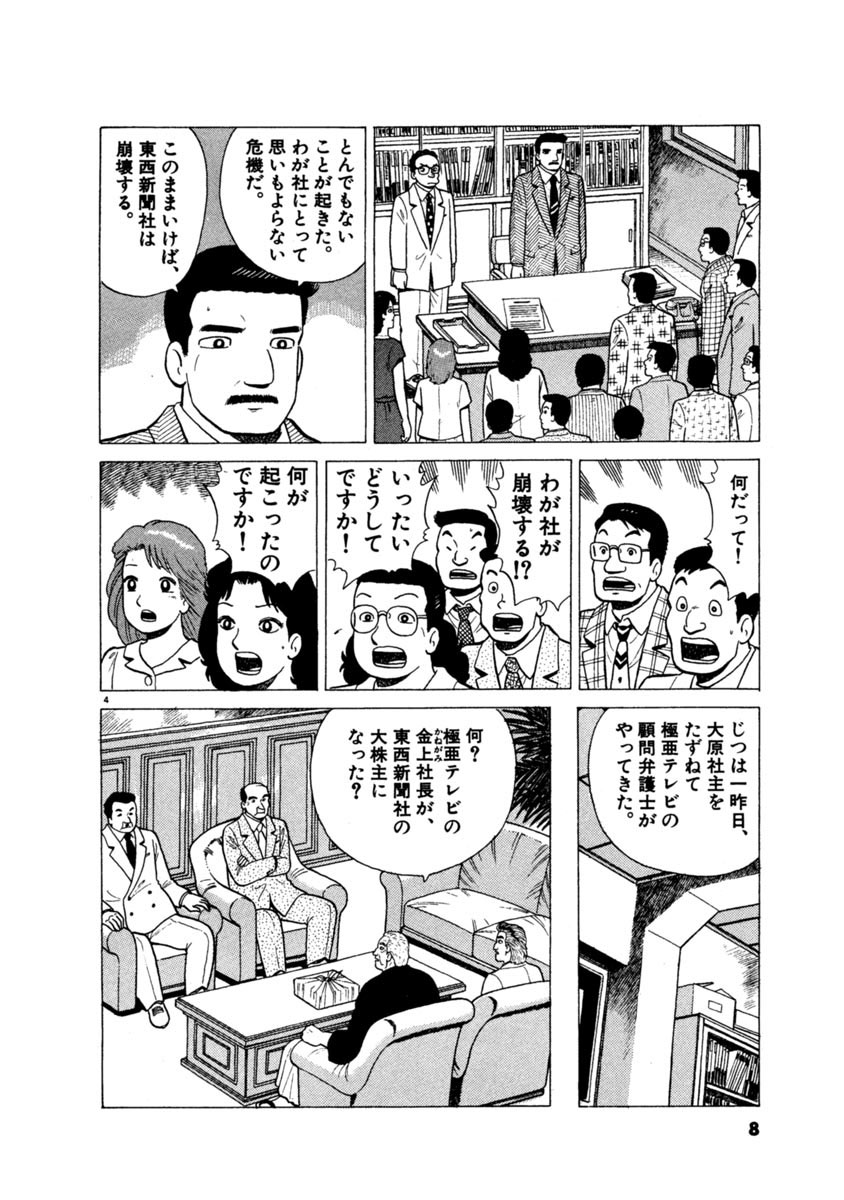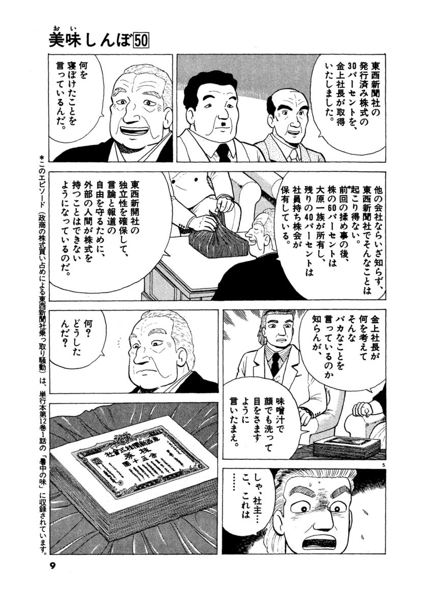 「食」ブームを巻き起こし、アニメ、映画化された大人気コミック! ▼第1話/黒いマスコミ王・1~6(水キムチ、蔘鶏湯、じゅんさい胡麻豆腐、落としハモ、ハモ造り、ハモの照焼、ハモの真蒸、ハモの八幡巻き、ハモとマツタケの椀、イタリア風ドーナツ)▼第2話/部長昇進!(酔っぱらい海老)▼第3話/団の弱点・前編、後編(うずらの丸の椀、うずらの丸焼き、うずらの卵トリュフソースがけ、うずらの卵の目玉焼きキャヴィアのせ、フォアグラのソテーうずらの黄身塗り) ●登場人物/山岡士郎(東西新聞文化部員・膨大な食の知識を持つ。東西新聞の壮大な企画「究極のメニュー」の作成を担当)。栗田ゆう子(東西新聞文化部員・山岡とともに「究極のメニュー」を担当する)。海原雄山(名だたる陶芸家にして、食の探究者。「美食倶楽部」主宰。山岡の実父) ●あらすじ/極亜テレビの金上社長が、年老いた大原社長の叔父をだまして、なんと東西新聞社の株30%を買い占めてしまった。金上は、1年ほど前に父親の跡を継いだばかりの冷酷無比な若手社長。自身の極亜テレビでは、低俗で俗悪な番組で視聴率を稼ぎつつ、社内では完全な恐怖政治をしき、気に入らない者は容赦なく切り捨てている。もちろん、大原社主以下東西新聞社の社員は、悪名高き金上の新聞社経営介入に大反対。意気揚々と社を訪れる金上を玄関で待ち受けるのだが、そこに二日酔いの山岡がちょうど出社してき、こともあろうに、金上の顔面に嘔吐してしまった!(第1話)。▼谷村部長が、編集局次長に昇進することになった。そこで、自動的に開いた部長の席には富井副部長が座るものだと、富井自身をはじめ文化部の者は思ったのだが…(第2話)。 ●本巻の特徴/今後金上が、なぜ東西新聞社や雄山を目の敵にして様々な嫌がらせを繰り返すのか、その理由が本巻で明かされる(第1話)。 ●その他の登場キャラクター/金上(第1・2・3話)、「岡星」夫婦(第1・3話)、快楽亭ブラック(第1話)、中松警部、近城夫妻、まり子の祖父、父(第3話) ●その他DATA/表紙写真~うずらの卵とトリュフ、キャビア、フォアグラの料理