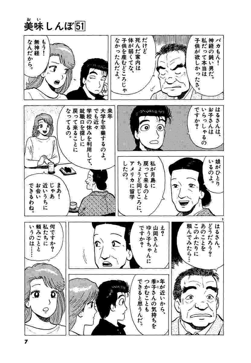 ●登場人物/山岡士郎(東西新聞文化部員・膨大な食の知識を持つ。東西新聞の壮大な企画「究極のメニュー」の作成を担当)。栗田ゆう子(東西新聞文化部員・山岡とともに「究極のメニュー」を担当する)。海原雄山(名だたる陶芸家にして、食の探究者。「美食倶楽部」主宰。山岡の実父)