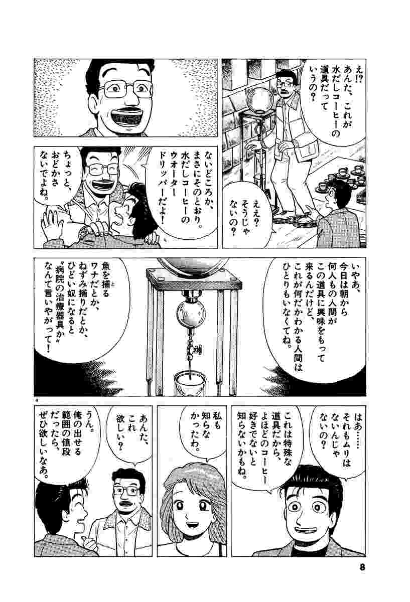 「食」ブームを巻き起こし、アニメ、映画化された大人気コミック! ▼第1話/水だしコーヒー▼第2話/とんでもない新入社員(サワラの味噌漬け、精進揚げ、金目の煮付け)▼第3話/日本酒の実力・1~6(ヒラメのこぶ締め、赤貝の酢の物、蛤のしんじょ椀、キャビア)▼第4話/父のサンドイッチ(サンドイッチ各種) ●登場人物/山岡士郎(東西新聞文化部員・膨大な食の知識を持つ。東西新聞の壮大な企画「究極のメニュー」の作成を担当)。栗田ゆう子(東西新聞文化部員・夫の山岡とともに「究極のメニュー」を担当する)。海原雄山(名だたる陶芸家にして、食の探求者。「美食倶楽部」主宰。山岡の実父)。 ●あらすじ/ノミの市に出かけた山岡夫妻は、水だしコーヒーのウオータードリッパーと出合う。モノの価値の分かる人に会えたと店の主人は喜ぶが、譲る前にこのドリッパーの正しい使い方を伝授したいので、明日また訪ねてきて欲しいという。翌日山岡たちは指定された喫茶店に足を運ぶが、そこは何年も使われていないようなひどく古びた喫茶店で…(第1話)。▼東西新聞文化部に新入社員が入ってきた。しかし彼女は、初日から私用の長電話はするは勝手に早退はするはのハチャメチャぶり。もちろん部内中で大ブーイングが起こるが、ゆう子だけは話せば分かると、彼女の指導役を買って出る(第2話)。 ●本巻の特徴/本巻では、単に「究極のメニュー」を追究するのではなく“料理との相性”をテーマに、日本酒について深く探っている(第3話)。 ●その他の登場キャラクター/「岡星」主人(第3話)、快楽亭ブラック(第4話) ●その他DATA/扉写真~サンドイッチ各種