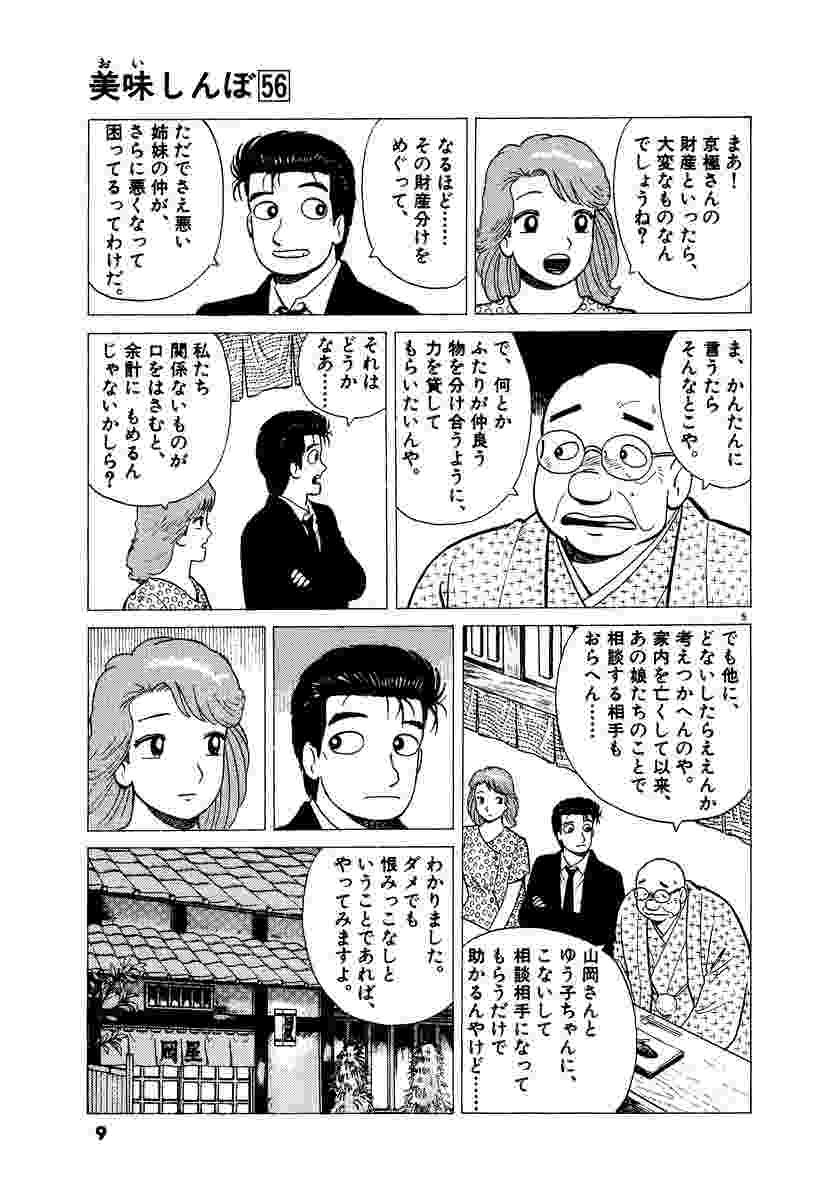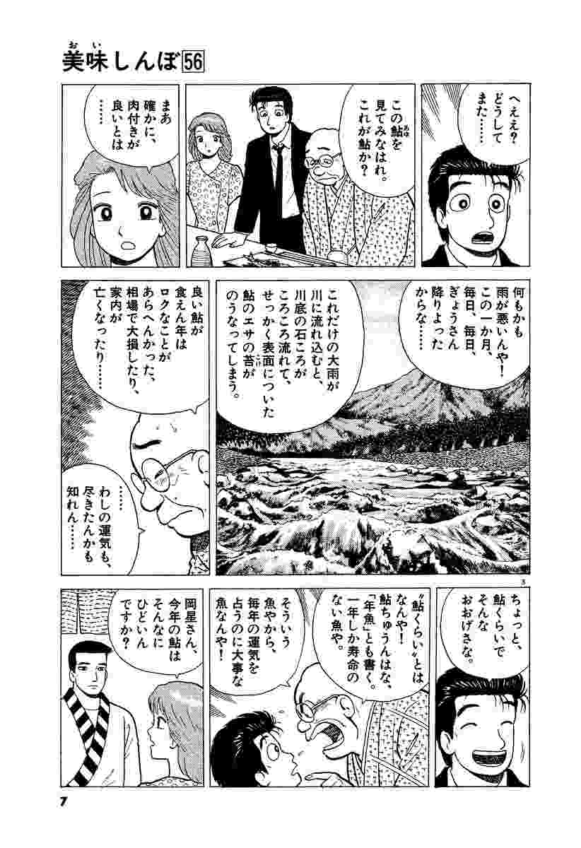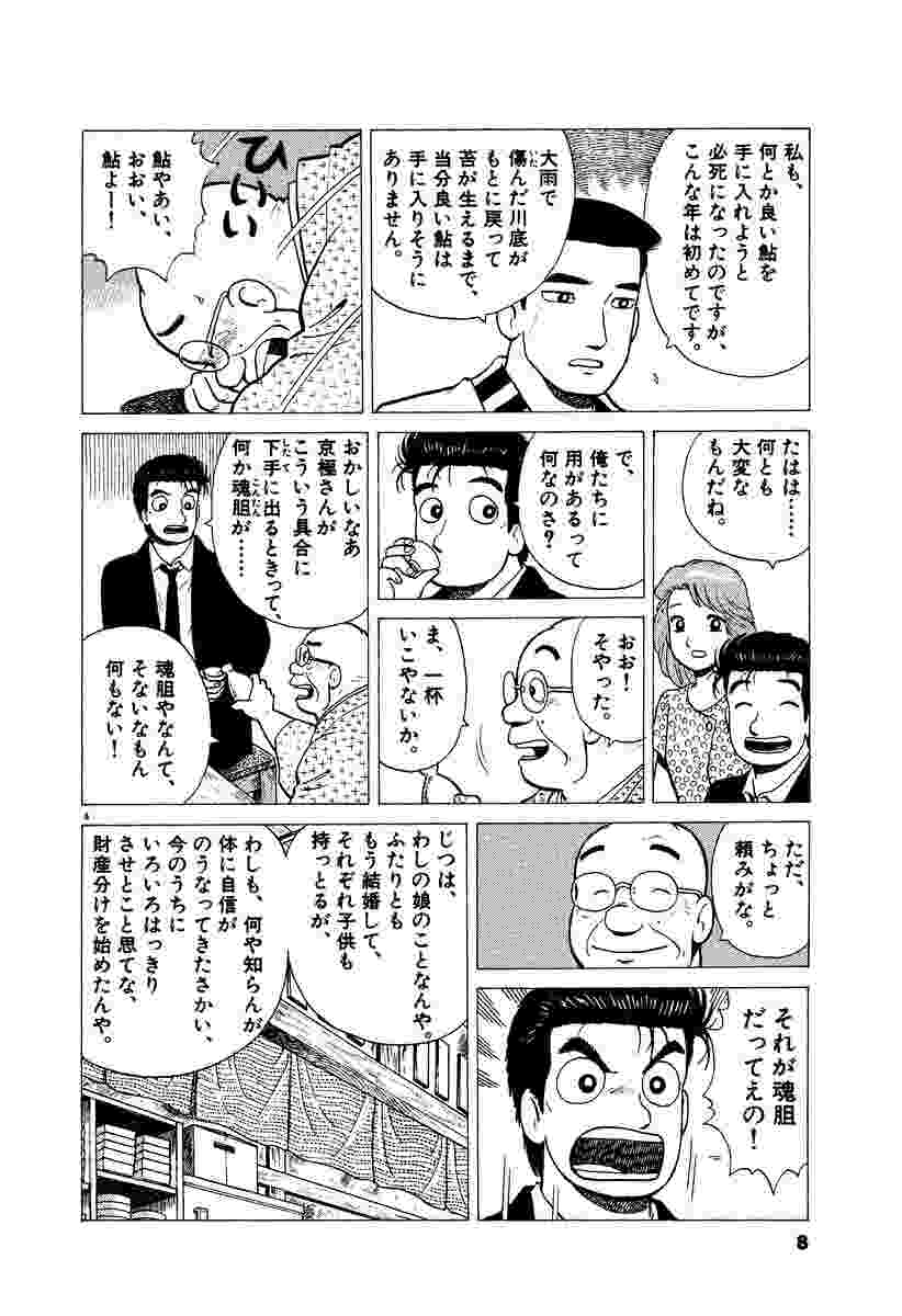 「食」ブームを巻き起こし、アニメ、映画化された大人気コミック! ▼第1話/鮎と姉妹(鮎寿司、苦ウルカ)▼第2話/餡と生きがい・前編、後編(じょう蕷饅頭、金団、金つば)▼第3話/恋のキリタンポ・前編、中編、後編(ニボト、キリタンポ鍋、比内鶏の焼き物)▼第4話/機転の鯛料理(鯛の刺身、鯛のあらの吸い物、鯛の天ぷら)▼第5話/犬を食べる・前編、後編(犬鍋、ヘビ鍋) ●登場人物/山岡士郎(東西新聞文化部員・膨大な食の知識を持つ。東西新聞の壮大な企画「究極のメニュー」の作成を担当)。栗田ゆう子(東西新聞文化部員・夫の山岡とともに「究極のメニュー」を担当する)。 ●あらすじ/莫大な財産を持つ京極は、仲の悪いふたりの娘にどのように遺産分配をすればいいものかと頭を悩ませている。しかし、ふたりは仲が悪いどころか、実はとっても仲良しで…(第1話)。▼大学時代の恩師を訪ねた山岡夫妻は、将来の目標が定まらずに毎日フラフラしている恩師の息子・一良に会う。そこに、和菓子職人である一良の祖父が、一良が子供の頃好物だったという和菓子を持って現われるのだが、「餡なんて下品な味がして大嫌いだ!」と一良は家を飛び出してしまう!(第2話) ●本巻の特徴/ゆう子の兄・誠の恋の話が描かれる(第3話)。 ●その他の登場キャラクター/京極万太郎(第1話)、「岡星」主人(第1話) ●その他DATA/表紙写真~キリタンポ鍋[調理/昔のきりたんぽや]