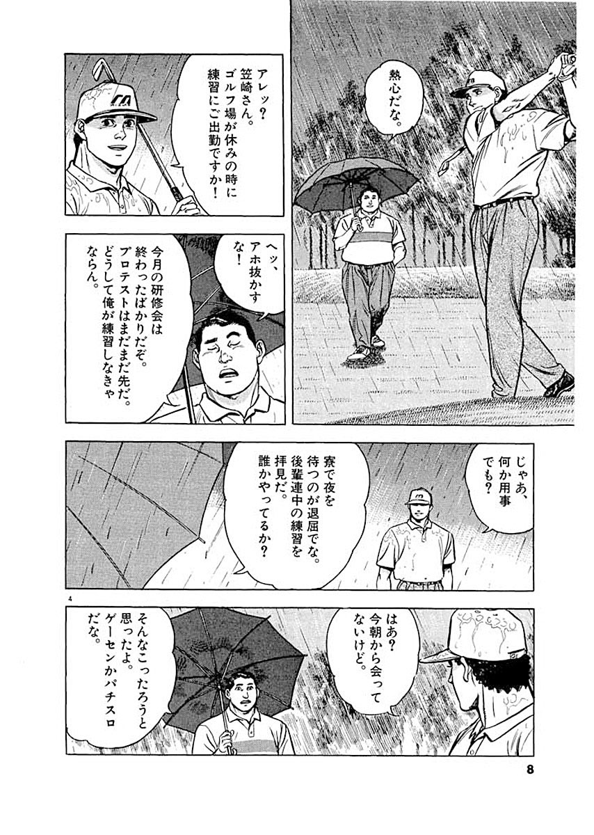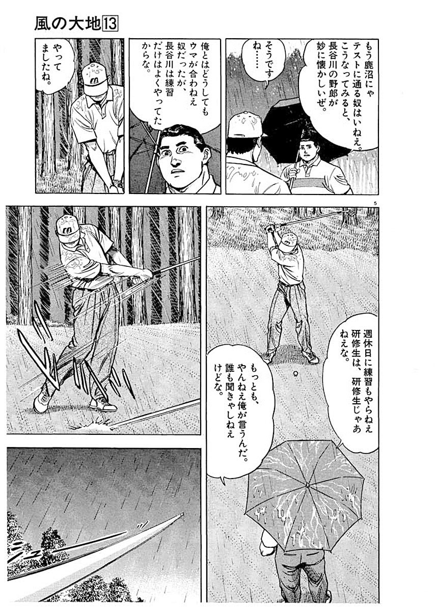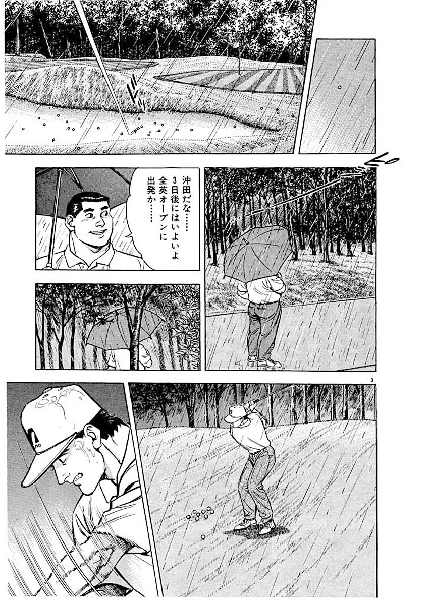 ゴルフに全てを賭けた男・沖田圭介の青春を叙情豊かに綴った物語 ▼第1話/戦士の休息▼第2話/プレストウイック▼第3話/キャディの血▼第4話/再開▼第5話/第1打▼第6話/一人言▼第7話/キャディの役目▼第8話/酔っ払い▼第9話/ラビット ●登場人物/沖田圭介(鹿沼カントリークラブ初のプロゴルファー)、河内俊一郎(かつてはシード選手であったゴルファー)、リリィ・マクガン(沖田のキャディ。キャディの家系に育つ) ●あらすじ/7月上旬、全英オープンを3日後に控えた沖田は、雨の中、最後の調整をしていた。練習の様子を見にきた笠崎は、気をきかせ、物部父娘を鹿沼に呼ぶ。沖田は、麗子と静かな語らいの時を過ごした(第1話)。▼7月14日、沖田は全英オープン開催国であるスコットランドに到着した。大会が始まる前に全英オープン発祥地のコースを回ろうとプレストウィックに宿をとった。そこのホテルで、沖田は日本人ゴルファー、河内に出会う。河内は、本線出場資格を得るためのマンデートーナメントに出場していたのだ(第2話)。 ●本巻の特徴/この第13巻から、全英オープン本線がスタートする。沖田は、プレストウィックで宿泊しているホテルのオーナーの妹、リリィをキャディに、試合に挑む。 ●その他の登場キャラクター/物部麗子(第1話)、笠崎孝(第1話)、リリィの兄(第2~3話)、ロジャー・デービス(第4~5話)、ジャンボ尾崎(第7話)、クランプトン(第8~9話)
