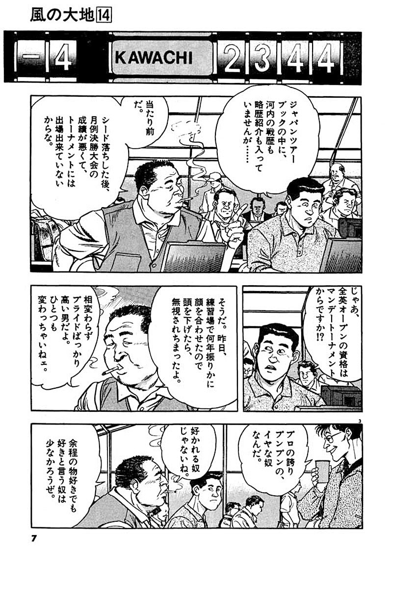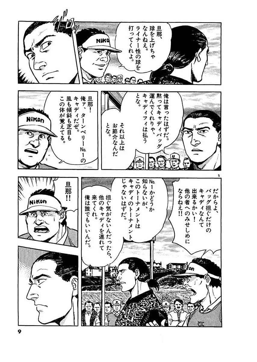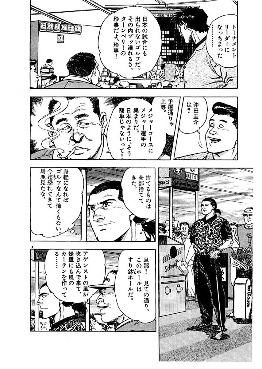 ゴルフに全てを賭けた男・沖田圭介の青春を叙情豊かに綴った物語 ▼第1話/ふたりの女▼第2話/熱い視線▼第3話/花火合戦▼第4話/経験浅き者▼第5話/風の形▼第6話/好きな人▼第7話/信じる道▼第8話/海霞▼第9話/老人の想い ●登場人物/沖田圭介(鹿沼カントリークラブ初のプロゴルファー)、河内俊一郎(かつてはシード選手であったゴルファー)、リリィ・マクガン(沖田のキャディ。キャディの家系に育つ)、クランプトン(元天才ゴルファー) ●あらすじ/沖田は9番ホールの第2打で、ミスショットをし、ボールをグリーン左の茂みの中に落としてしまったものの、第3打でグリーンの上に乗せた。トップの成績である河内は、順調にショットを決めていった(第1話)。▼10番ホールのグリーン上で、沖田はピンまで5メートルの所にボールを寄せた。一見簡単そうで、実は非常に難しいラインであったが、沖田は無事にカップに沈めた。一方、沖田のキャディであるリリィは、彼に好意を持ちながら、過去にプロゴルファーの男に裏切られた経験から、沖田に素直になれないでいた(第2話)。 ●本巻の特徴/第14巻は、全英オープン初日と2日目の様子を中心に描いている。初日、沖田は、一時は河内とともにトップまで躍り出るが、徐々に調子を悪くし、16番ホールで、小川に3個のボールを沈めるというミスを犯す。だが、2日目に巻き返し、予選を通過した。 ●その他の登場キャラクター/物部麗子(第1、2、4、7話)、木曽(第1、4話)、リリィの兄(第5、6話)
