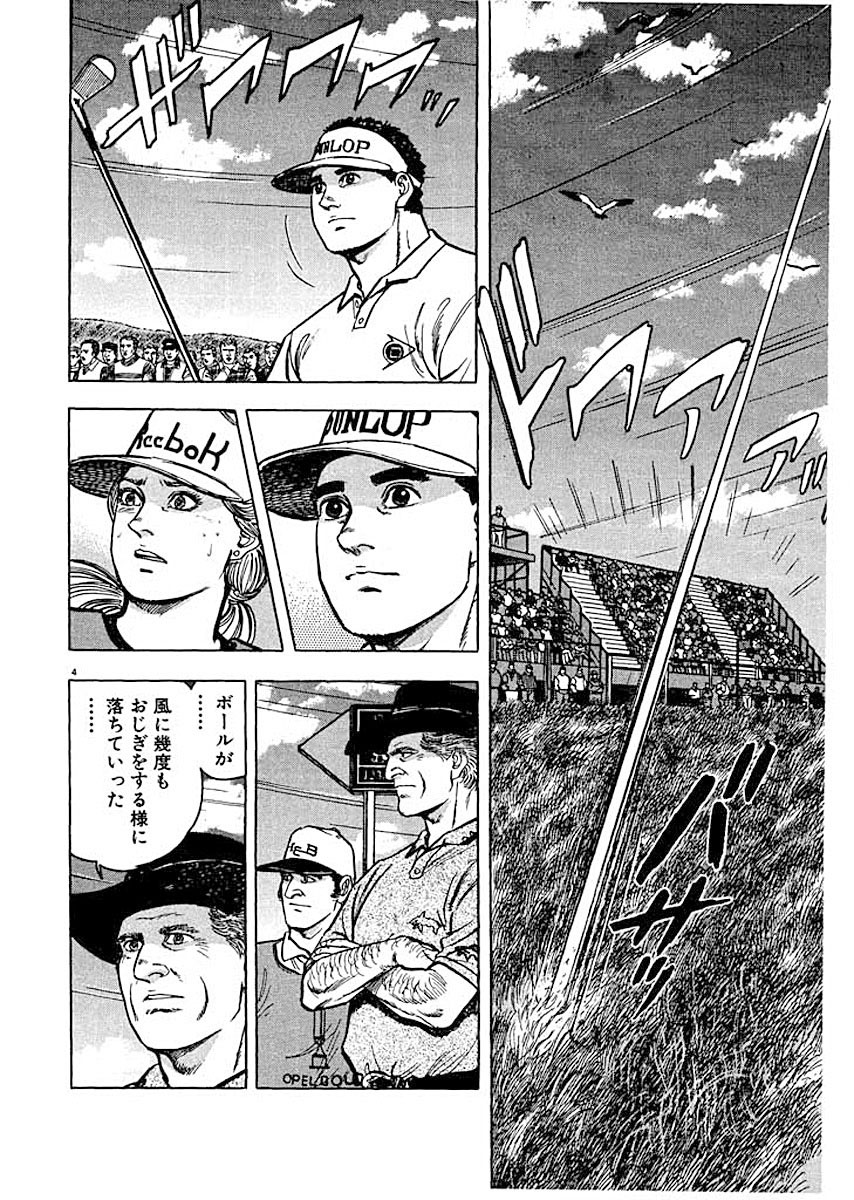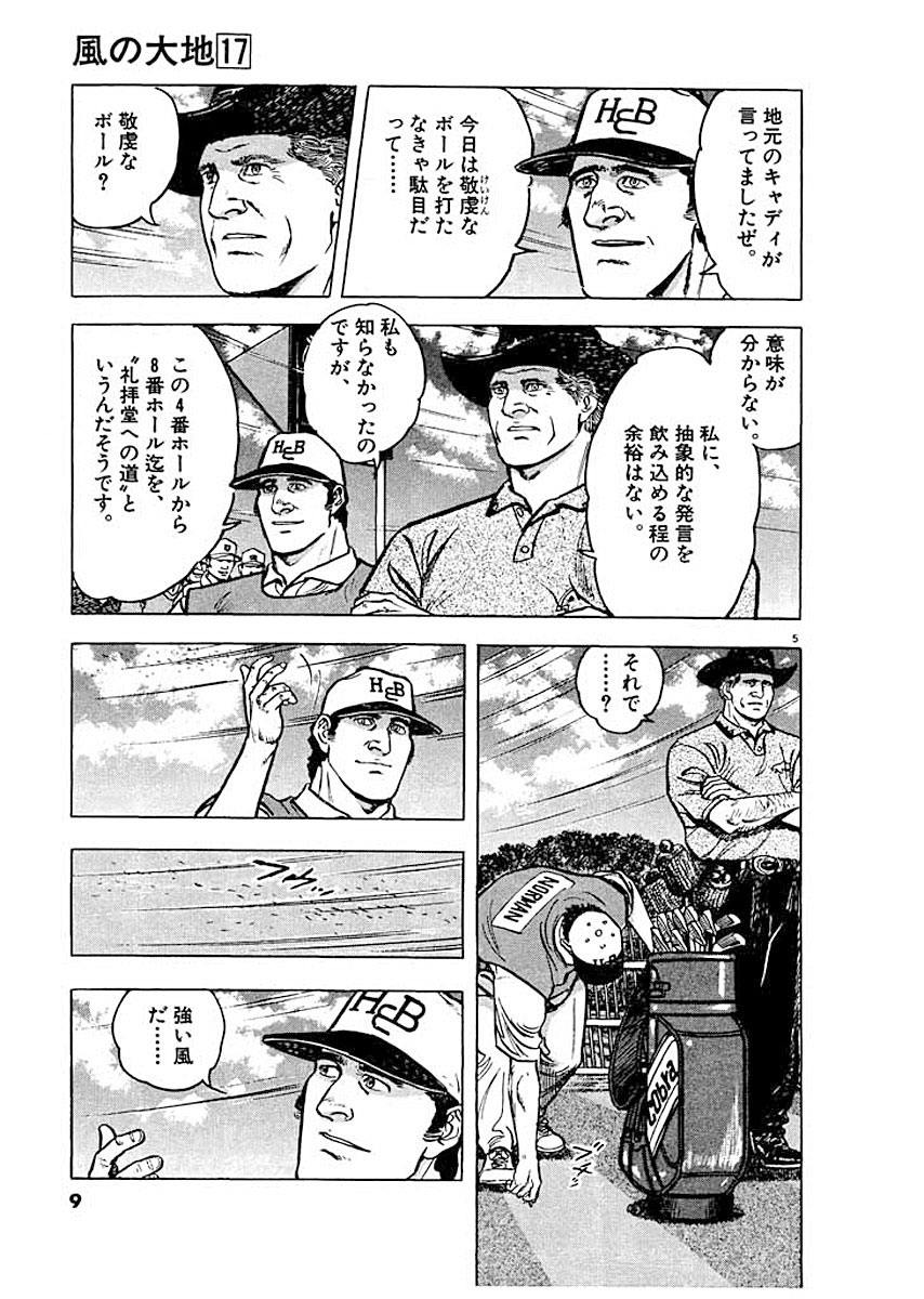 ゴルフに全てを賭けた男・沖田圭介の青春を叙情豊かに綴った物語 ▼第1話/礼拝堂への道▼第2話/七色の風▼第3話/心のアゲインスト▼第4話/追う者、追われる者▼第5話/蛮勇の時▼第6話/勇気には勇気▼第7話/最終組のゴルフ▼第8話/ビューティフル!!▼第9話/最終組のフルショット ●登場人物/沖田圭介(鹿沼カントリークラブが生んだ、クラブ初のプロゴルファー)、リリィ・マクガン(全英オープンでの沖田のキャディ。キャディの家系に育つ)、クランプトン(かつての天才ゴルファー。一人息子のニックを亡くしている) ●あらすじ/ターンベリーでの全英オープン最終日、4番ホール。向かい風が徐々に強くなっていった。沖田が放ったアイアンショットは、ミスと言えるものではなかったが、曲がってしまい、レスキュー草の中に落ちてしまった。続くノーマンは、ベテランらしくボールを上手くグリーン上に乗せる。ノーマンのショットを見た沖田は、向かい風の時の打ち方を勉強した、と嬉しそうにリリィに伝えるのだった(第1話)。▼レスキュー草の中にボールを落としてしまった沖田であったが、これを見事にカップインさせた。続く5番ホールでは、風がさらに強くなっていった。このホールの風は難しいというリリィの言葉を聞いた沖田は、4番ホールでノーマンから学んだアゲンストでの打ち方を試してみる、とリリィに告げた。そして沖田は会心のの一打を放った(第2話)。 ●本巻の特徴/最終日16ホールの全英オープン。トップを走るノーマンと沖田の差は2ストローク。スコアは依然として膠着状態のまま、残り2ホールを残すのみになった。一方、最終ホールを終えた河内は15アンダーで3位という結果を残した。 ●その他の登場キャラクター/河内(第4~6、7~9話)、木曽(第2、3、5、6、9話)、物部麗子(第8話)