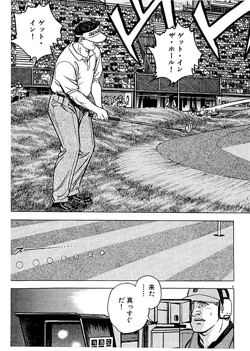 ●あらすじ/全英オープンの最後のパットを奇跡的に決めたことで沖田は、トップのノーマンと並んだ。あとは、ノーマンが5mのパットを決めるか、外すかで勝負が決まる。ノーマンの優勝か?プレーオフか?ノーマンの注目のパットが、今打たれた!!(第1話)。▼完璧と思われたノーマンのパッティングであったが、ボールは右に外れていき、誰もがプレーオフと思った。しかし、ボールはまだ止まっていなかった。運命に向かうボールの行方はいかに…(第2話)。
