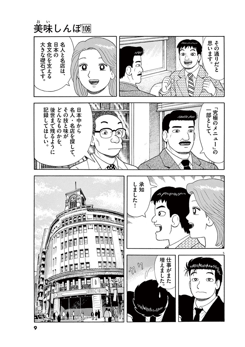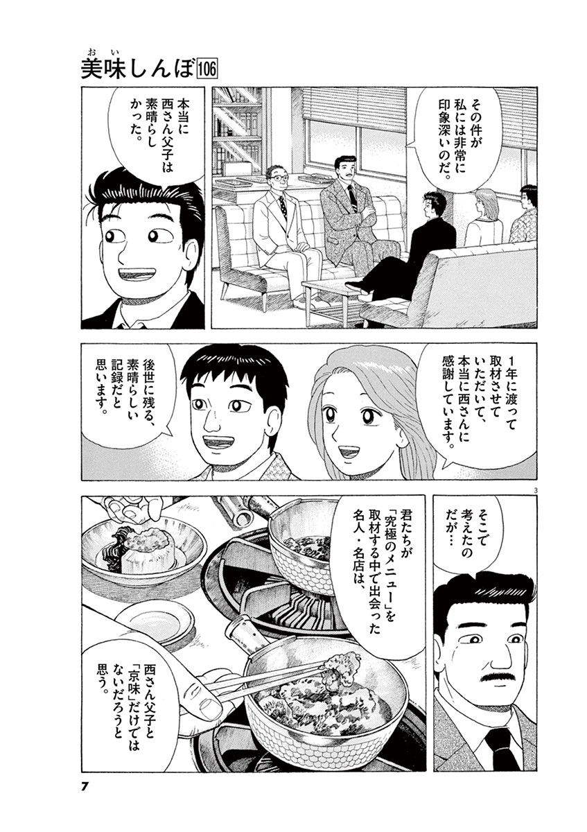 106集・107集は「名人・名店編」! 「究極のメニュー」を作成する中で、山岡達がこれまでに出会った数々の名人・名店。その中でも最高の名人・名店を選りすぐり、第106集と第107集の2冊に収録! 96・97・99集に登場した「京味」と、この2冊で紹介する9店こそが、「美味しんぼ」が選んだ究極の名人・名店です!!