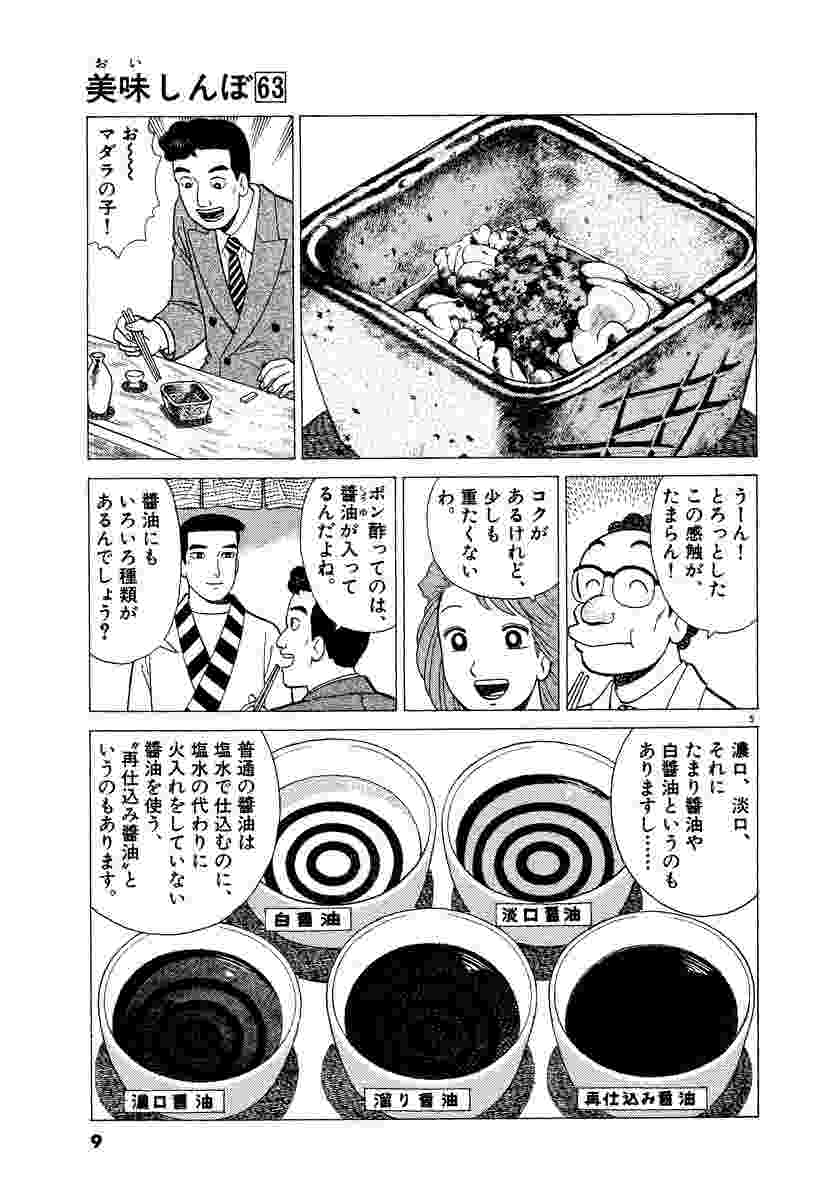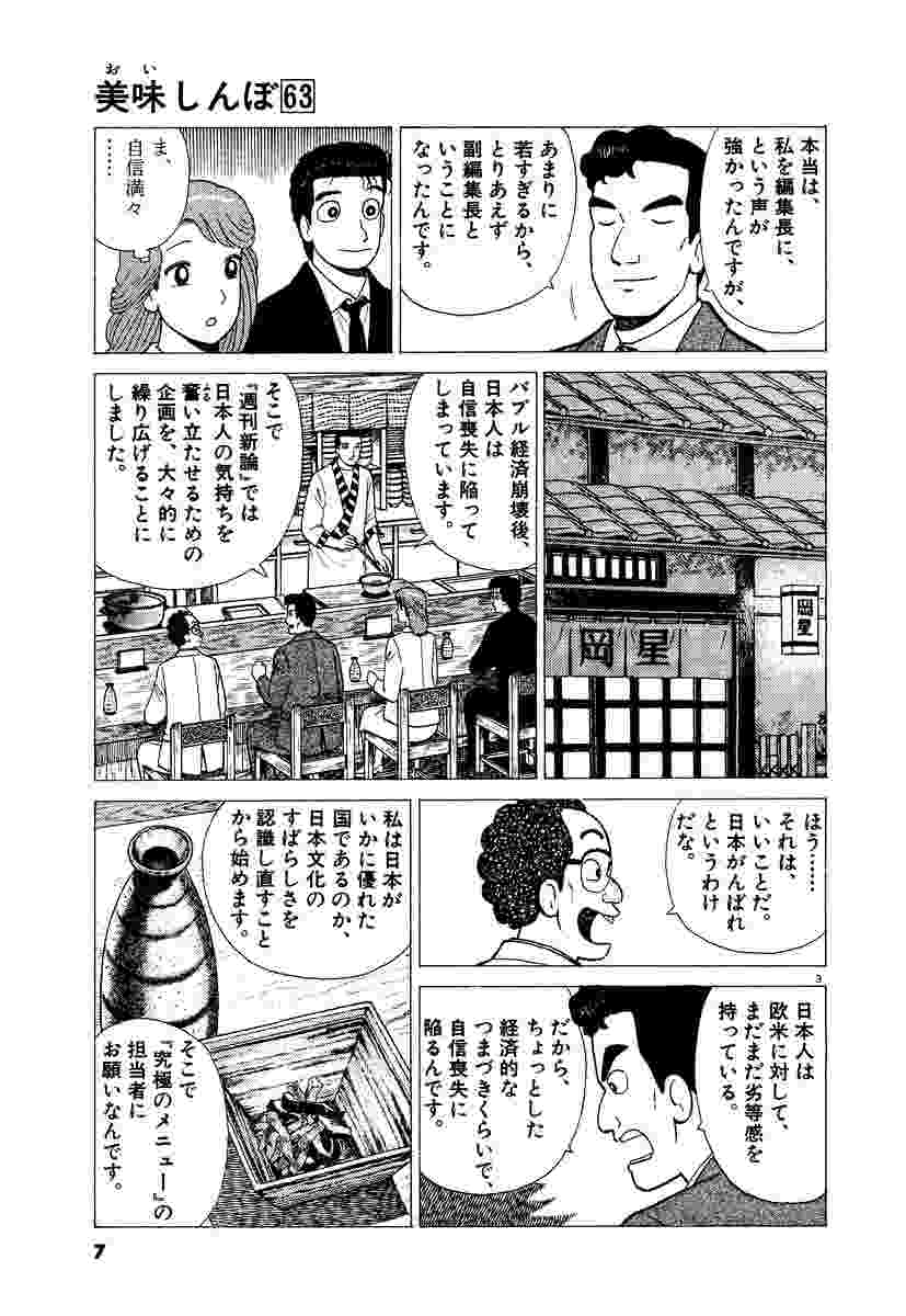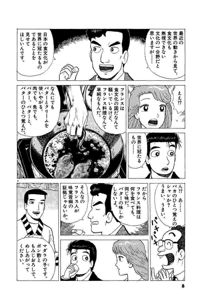「食」ブームを巻き起こし、アニメ、映画化された大人気コミック! ▼第1話/バターと醤油▼第2話/女子高生のお願い・▼第3話/ゼロからの出発▼第4話/東西新聞の危機 ●登場人物/山岡士郎(東西新聞文化部員・膨大な食の知識を持つ。東西新聞の壮大な企画「究極のメニュー」の作成を担当)。栗田ゆう子(東西新聞文化部員・夫の山岡とともに「究極のメニュー」を担当する)。海原雄山(名だたる陶芸家にして、食の探求者。「美食倶楽部」主宰。山岡の実父)。 ●あらすじ/富井から、「週刊新論」の若き副編集長・坂川を紹介された山岡とゆう子。坂川は、欧米に対していまだに劣等感を抱いている日本人を奮い立たせるため、日本文化の素晴らしさを世界中に知らしめようと躍起になっている。そこで、山岡たちに日本の食文化が世界の冠たることを見せてほしいと頼むのだが、彼の「フランス料理なんて、バターばかりを使った低俗なものだ」という言葉が山岡は引っかかり…(第1話)。▼アメリカのメディア王・トレバー・コドラム氏が来日することになった。コドラム氏は、欧米の新聞やテレビ局を次々と買収しているやり手で、山岡はそんな彼を好ましく思わない。今回は、2年前に買収した映画会社の映画宣伝のための来日が名目だが、何か裏がありそうだ。明くる日、コドラム氏の記者会見に行った山岡は、言葉のあやからコドラム氏に「妻の土産に東西新聞を買っていきたい」と言われてしまう。怒った山岡はワサビが大量に入ったのり巻きをコドラム氏に食べさせる。むろんコドラム氏は激怒してしまい…(第4話)。 ●本巻の特徴/アメリカのメディア王・コドラム氏が金上と手を組んで、東西新聞の乗っ取りと海原雄山の失脚を企む。そんな彼らと闘うために手を組んだ山岡と雄山。そのなかで山岡は、雄山と母親(雄山の妻)の意外な関係を知ることとなる(第4話)。 ●その他の登場キャラクター/「岡星」主人(第1、4話)、料理屋「大咲」の板前・中本恒一(第1話)、東西新聞社員食堂料理長・相川(第2話)、大原社主(第4話)、アメリカのメディア王・トレバー・コドラム(第4話)、極亜テレビ社長・金上(第4話) ●その他のデータ/表紙写真~つくね親子丼、裏表紙写真~空豆のスープ、扉写真~天神様の梅茶漬け
