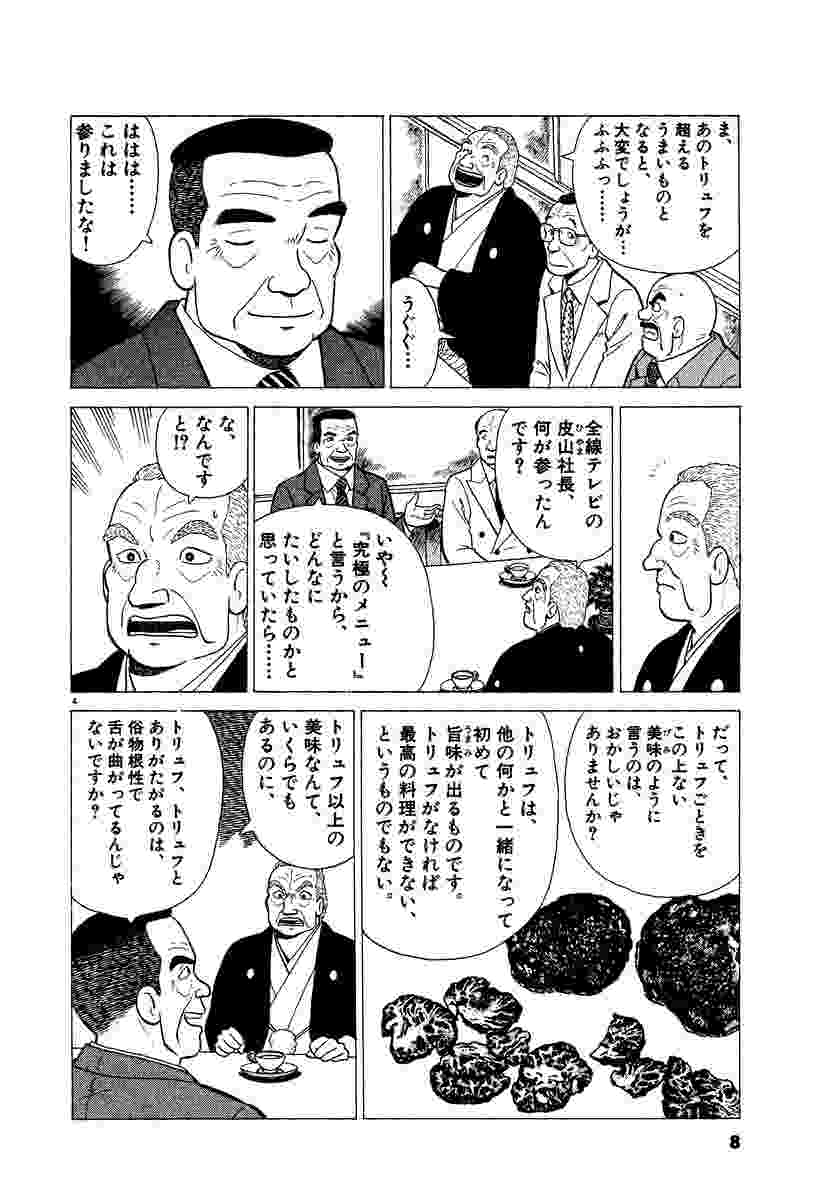 「食」ブームを巻き起こし、アニメ、映画化された大人気コミック! ▼第1話/『究極のメニュー』の真価!?▼第2話/真心に応える食品▼第3話/出産のお祝い▼第4話/“究極の紅茶”(前編・中編・後編)▼第5話/ベトナムの卵(前編・後編)▼第6話/競馬で本年を占う!! ●登場人物/山岡士郎(東西新聞文化部員・膨大な食の知識を持つ。東西新聞の壮大な企画「究極のメニュー」の作成を担当)、栗田ゆう子(東西新聞文化部員。夫の山岡とともに「究極のメニュー」を担当する)、海原雄山(名だたる陶芸家にして、食の探求者。「美食倶楽部」主宰。山岡の実父) ●あらすじ/前に山岡たちが出した最高級のトリュフに気をよくした大原社主は、全線テレビ社長・皮山の「『究極のメニュー』とやらは、結局トリュフを超えられないのか?」という挑発的な意見に、つい「トリュフ以上の『究極のメニュー』を作る。出来ない場合は『究極のメニュー』作りをやめる!」と宣言。さっそく山岡たちに、1000万円かかってもいいから、トリュフ以上のものを作れと命令する。社主のあまりに子供じみた発言にあきれかえる山岡とゆう子…。そんな折、山岡たちの隣人で画家の貴恵子が、画学生としてイタリア留学の奨学金がもらえることになった。喜ぶ山岡とゆう子だが、夫と離れてまで留学したくないという。お金さえあれば、夫も一緒にイタリアへ渡れるのだが…(第1話)。▼富井副部長が局長から大目玉をくらった。理由は、昔“化学調味料”と呼ばれていたものが、今では“うま味調味料”と言い換えられていることを知らなかった富井が、「自然の“うま味調味料”は、“化学調味料”とはまったく違う」という記事を書いてしまったからだ。あいまいな名前で消費者を混乱させる日本企業のやり方に、富井はすっかり人間不信になってしまった…(第2話)。 ●本巻の特徴/板山会長は妻の誕生日プレゼントに、マイセンのティーセットを贈りたいと思っているのだが、紅茶の価値が分からない人には売りたくないと、アンティークショップの主人に言われてしまう。そこで、板山と山岡たちは、紅茶の味を探求すべくインドへと向かう(第4話)。 ●その他の登場キャラクター/東西新聞社主・大原(第1話)、全線テレビ社長・皮山(第1話)、帝都新聞・嶺山社長(第1話)、東西新聞文化部副部長・富井(第2、5話)、辰さん(第3話)、中松警部(第3話)、ニュー・ギンザ・デパート会長・板山(第4話)、団・ジュディ夫妻