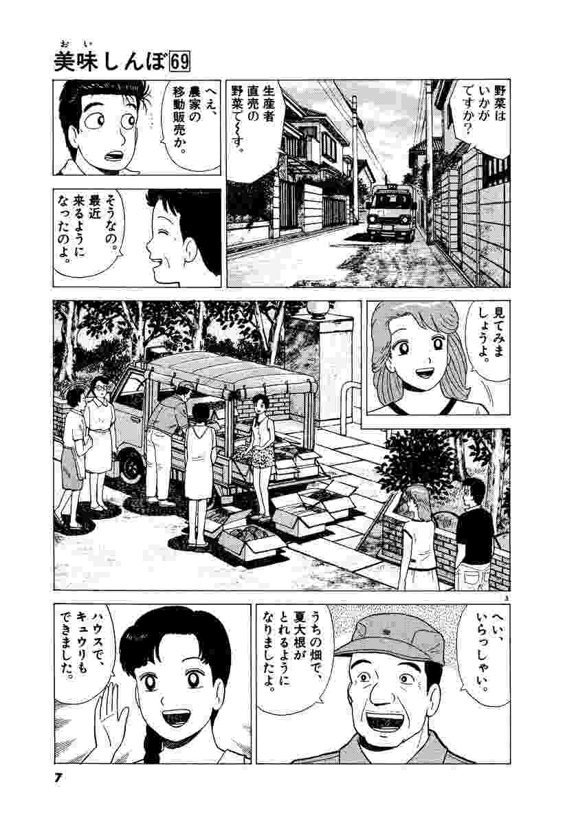 ▼第1話/野菜が危うい<前編><後編>(キュウリのぬか漬け)▼第2話/浮気計画! ?<前編><後編>(クサヤ、スルメ、レアステーキ、エビフライ、ホタテフライ、メンチカツ、チーズ、刺身)▼第3話/寿司に求めるもの<前編><後編>(ウニのキュウリ軍艦巻き)▼第4話/スランプの原因(ヴァイス・ヴルスト)▼第5話/カツオのへそ!?(牛肉丼、カツオのへその煮つけ)▼第6話/家庭崩壊防止計画(ソース焼きそば、肉焼きそば、広東風焼きそば、白味噌・八丁味噌・仙台味噌の味噌汁) ●登場人物/山岡士郎(東西新聞文化部員・膨大な食の知識を持つ。東西新聞の壮大な企画「究極のメニュー」の作成を担当)、栗田ゆう子(東西新聞文化部員・夫の山岡とともに「究極のメニュー」を担当する)、海原雄山(名だたる陶芸家にして、食の探求者。「美食倶楽部」主宰。山岡の実父)。 ●あらすじ/ゆう子の実家へ帰っていた山岡夫妻は、家の前を生産者直売の移動式八百屋が通り過ぎる音を聞き、早速様子を見に行ってみる。そこで売っていたのは、普通の流通経路には乗らないような、形はいびつだが安全に育てられた自家製の野菜の数々だった。するとそこへ、ここで野菜を買った主婦たちがキャベツの虫食い穴に文句をつけに現れる。彼女たちの野菜に対する間違った考えを正そうと、山岡はその八百屋で売っているキュウリと、一般的に流通しているキュウリの比べるようと、それぞれのぬか漬けを用意する。(第1話)▼たま代の友人・大柱さんが、手作りの野菜を手に栗田家を訪れた。ホウレンソウの出来栄えを自慢するが、山岡はこれに異を唱える。その野菜がとても安全だとは言えないという山岡は、大柱さんの菜園を訪れる。そしてそのホウレンソウを調べてみると最近の野菜が含む“硝酸態窒素”を大量に含んでいることがわかる。これを体内に取り込むと、「ニトロソアミン」という発ガン物質を作り出すのだ。窒素肥料をやり過ぎると、植物がタンパク質を作る源となる硝酸態窒素が残留してしまう。必要以上の窒素を摂取した野菜ほど、形は大きく見栄えよくなるが、硝酸態窒素を含むのだ。(第2話) ●本巻の特徴/妊娠中のゆう子は食べ物の好みが変わってしまい、山岡は大好物の“くさや”を食べられずに沈みがち。聞けば山岡の周りの男たちも、同じような悩みを抱えていた(第3、4話)