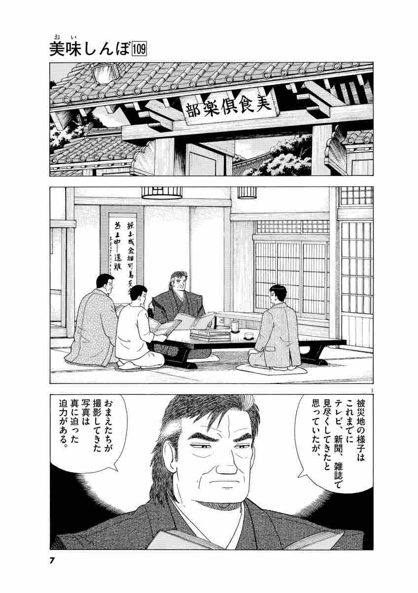 日本全県味巡り 島根編 飛沢が撮ってきた被災地の写真を見せられた雄山。雄山は、身をひきちぎられるような思いに包まれ、東西新聞と帝都新聞に「日本全県味巡り」を提案した。東北の復興に取り組むためには、日本の風土への自信を取り戻すことが必要だと言う雄山。取り組む県は、島根県。さらに、今問題となっているTPPへの解答も島根にあると、雄山は言う。「日本全県味巡り 島根編」を通じて、山岡や雄山達が見出したものは果たして!?