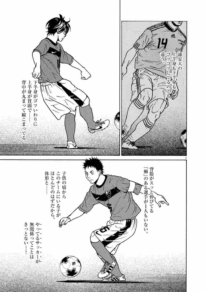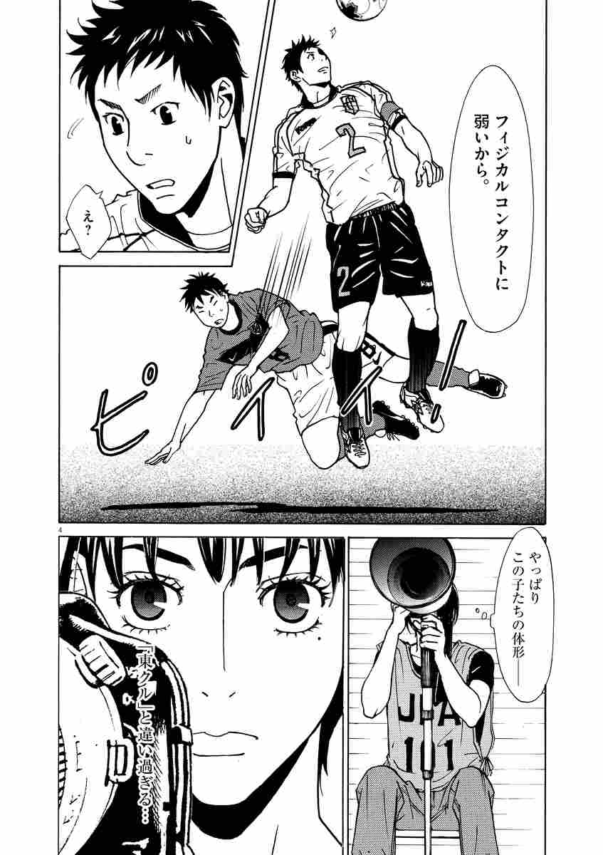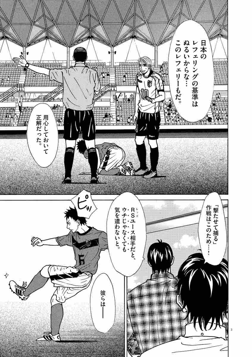日本サッカーを根本から変えるには――!? 天皇杯2回戦・RSユース戦で、東京クルセイドは前半”誤審”を恐れ「撃たせて捕る」作戦を展開。しかし、弱点・右SBを相手の10番に衝かれ、千尋がナイスカバーをするが、ファウルを取られ、FKで1点を先取される。だが、高橋監督は余裕の表情でゲームの成り行きを見ていた。そのまま前半終了後、高橋は、千尋の能力の一端が幼いときからの「イメトレ」によるものだと知るが…。そして、後半開始早々「東クル」はいきなり――!! (科学指導:高岡英夫〈運動科学総合研究所〉)
