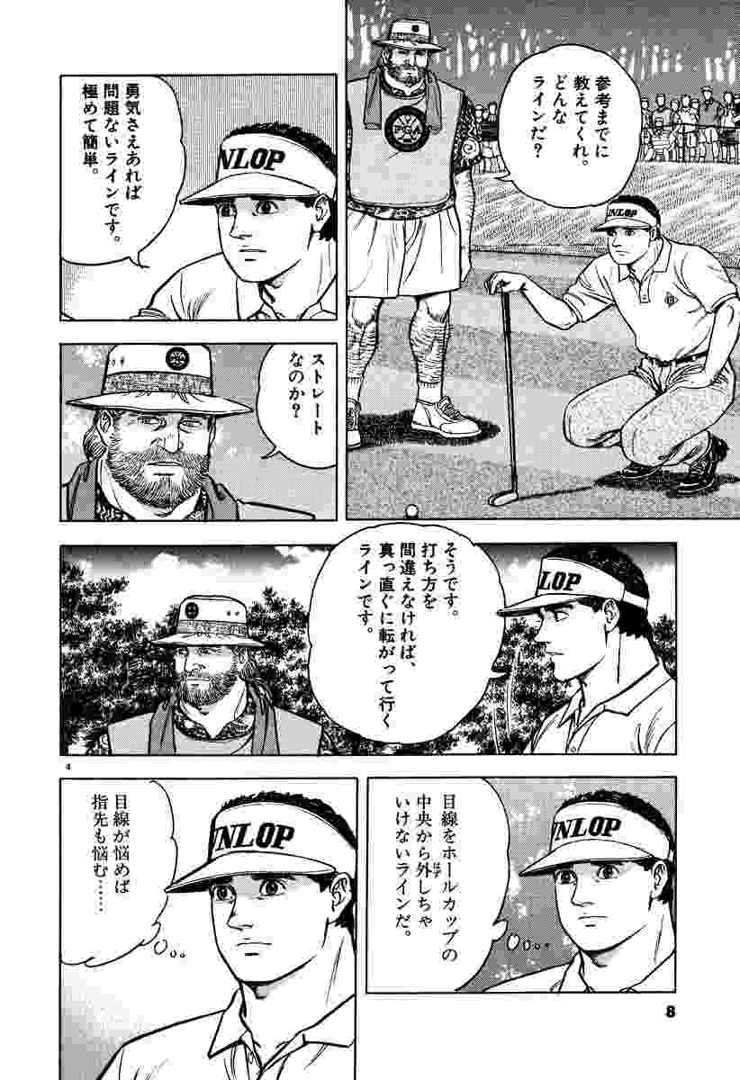 ▼第1話/目線のパッティング▼第2話/勇者▼第3話/プロの球▼第4話/それぞれの朝▼第5話/孤独な戦い▼第6話/二人の天才▼第7話/静寂▼第8話/突き進む勇気▼第9話/無謀な賭け●登場人物/沖田圭介(鹿沼カントリークラブ初のプロゴルファー)、シルバー・スコット・ウォーレン(天才ゴルファー。プロ歴7戦全勝。大財閥の御曹司)、グレゴリー・オースティン(下町のジャズハウスに出演中に沖田と出会ったサックス奏者)●あらすじ/コングレッショナルCCでの全米プロ選手権3日目。大会中、スランプが続く沖田だったが、10番ホールで二打目をピン右の“ベタピンショット”を放つ。ここでバーディを取りたい沖田はパティングの際、研修生のときに亡くなった宇賀神に言われた「パッティングは、目線を悩ませちゃいかん。」という言葉を思い出した……(第1話)。▼沖田は10番の後、13番でもバーディを取り、通算スコアをー7とし、トーナメントリーダーのウォーレンとノーマンと二打差まで追いついた。そして、17番ホール。ピンの位置がグリーン左奥にあるにもかかわらず、沖田はティショットで左サイドに打ってきた。このショットは、ミスなのか、それとも沖田の作戦なのか!?(第2話)●本巻の特徴/最終日、ウォーレンと回ることになった沖田は、観客がすべてウォーレンの味方という不利な状況の中、戦わなければならなかった。しかし、落雷の事故で入院したトム、日本で待つ友人たち、天国にいる宇賀神とリリィの応援を背にうけ、沖田は戦い続ける。