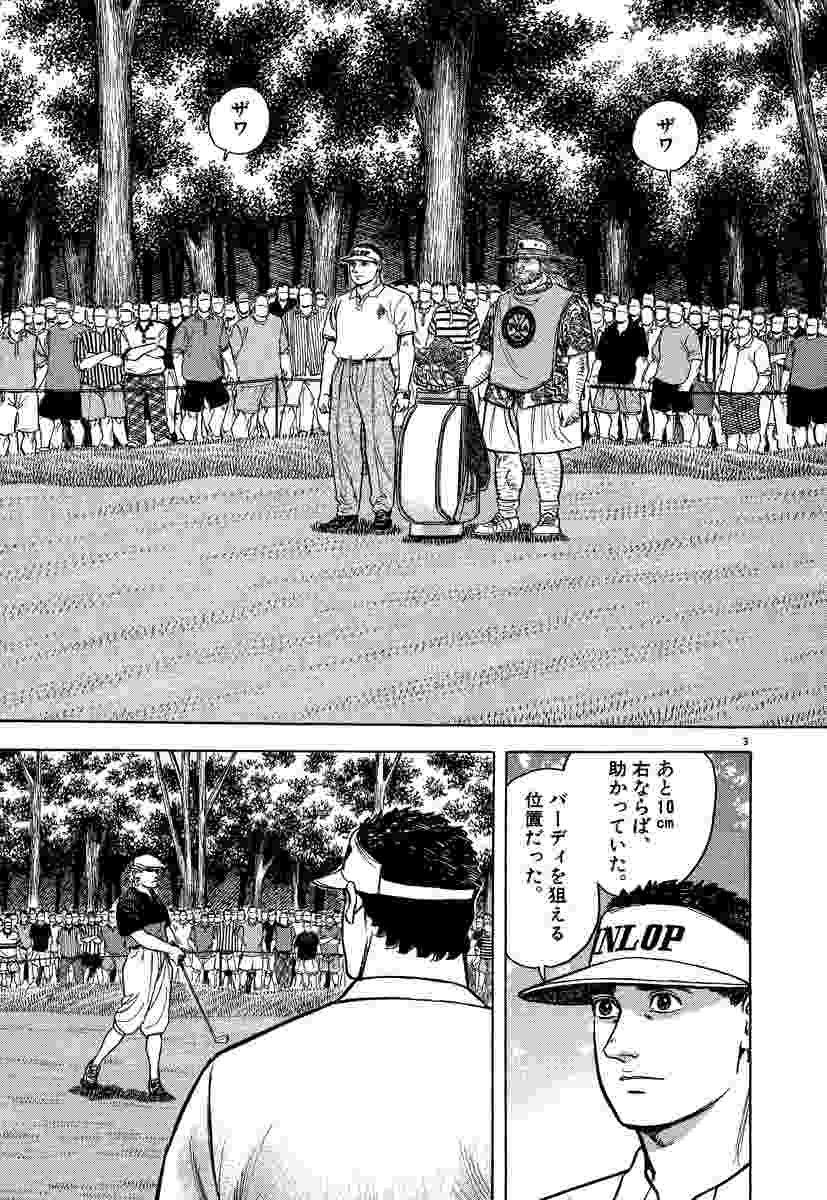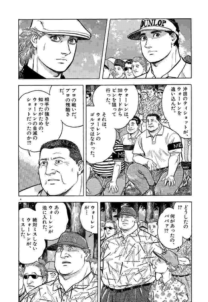 ●あらすじ/全米プロ選手権、最終日17番ホール。完璧なプレーで知られるシルバー・スコット・ウォーレンのボールが、グリーンを越え池の中に! 沖田のバーディを直感したウォーレンがミスを犯したのだ。そして、沖田の第二打。師・宇賀神の教え通り、攻めの姿勢でピンデッドを狙った沖田のボールは……(第1話)。▼ピンに向かって一直線に飛んだ沖田の第二打。ピンそばで止まるかと思われたボールが、戻ってきてしまった。グリーン手前から中央にかけては3つの強い受け傾斜があり、それを超えると池に落ちてしまう! 固いグリーンにもかかわらず、想像以上にスピンが強かった沖田のボールは、スピードを緩めることなく池をめがけて転がり続ける……(第2話)。