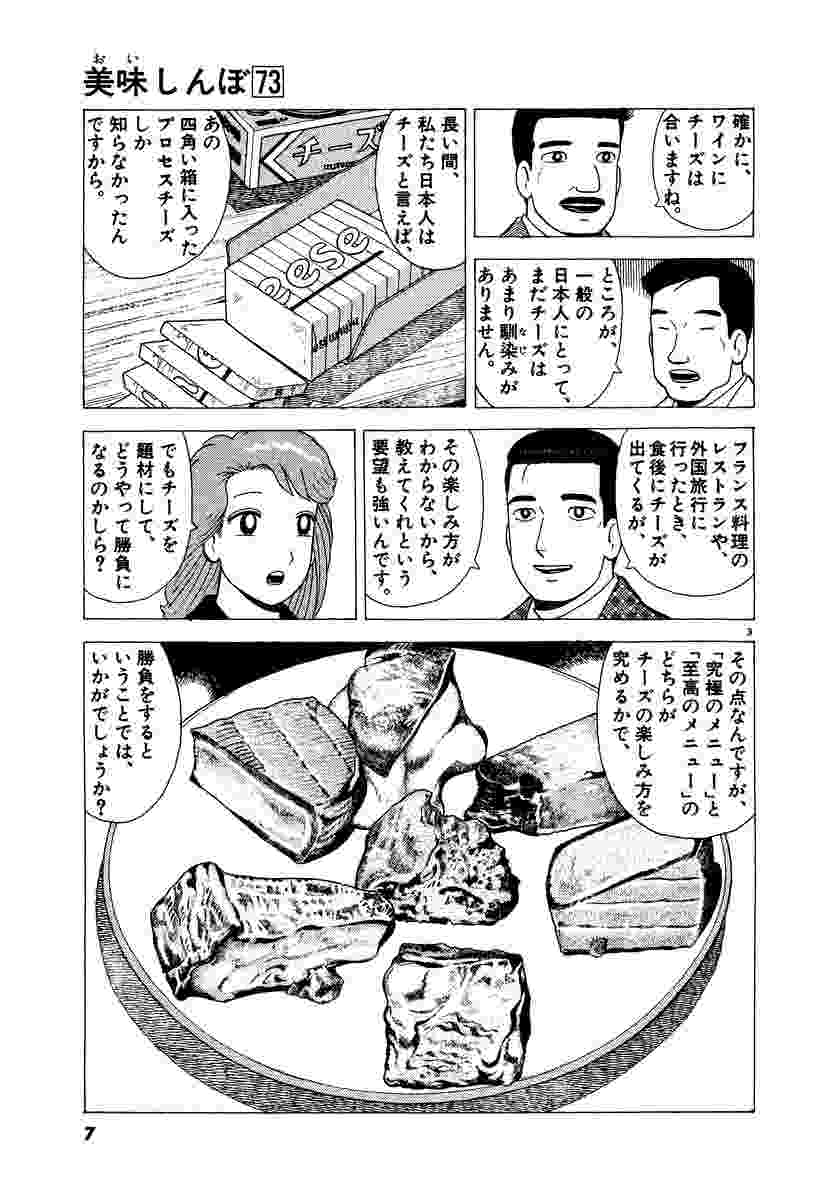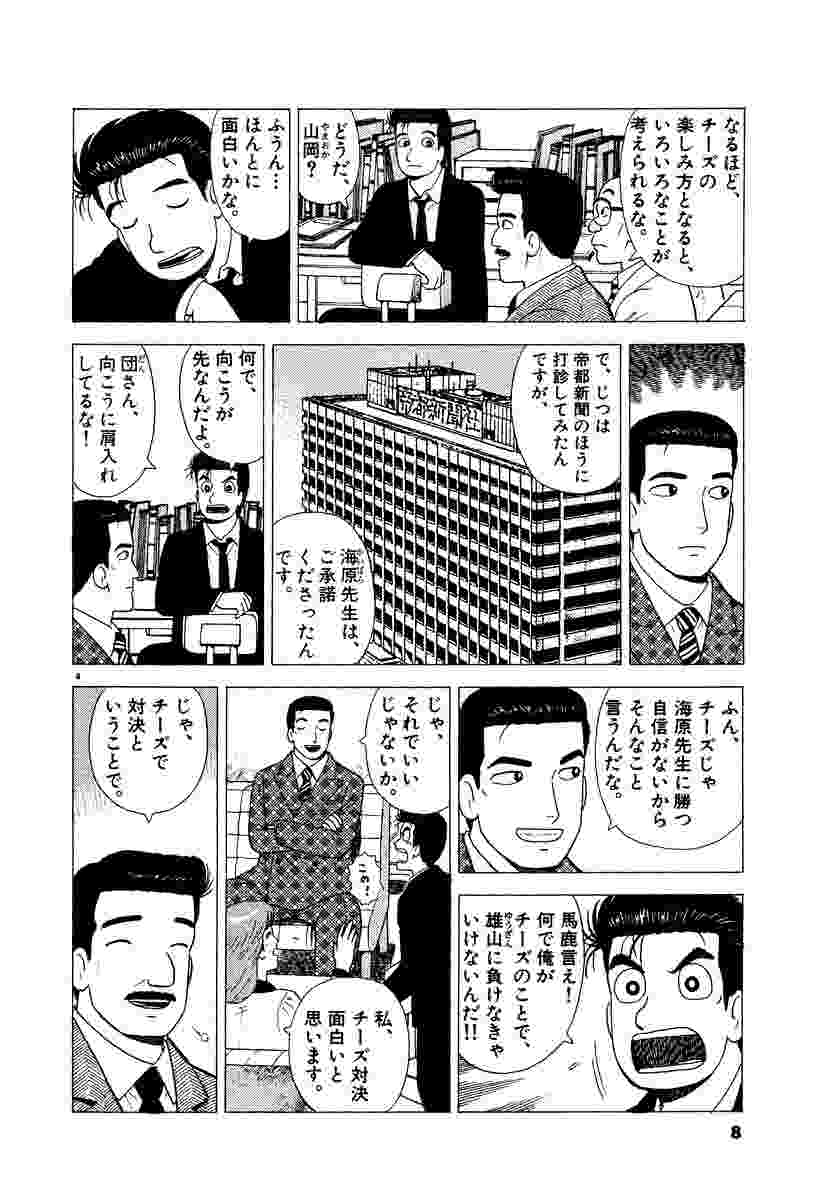 ●あらすじ/久し振りに「究極のメニュー」と「至高のメニュー」の対決が行なわれることになった。今回のテーマは“チーズ対決”で、日本人になじみの薄いチーズをどのように楽しむかという点で争われることに。そのメニュー作りに頭を悩ませる、ゆう子と山岡に、ゆう子の通う産婦人科医の西浜先生からある頼みごとが舞い込んでくる。その頼みごとというのは……(第1話)。▼ヨーロッパに長期滞在していた近城夫妻が東西新聞社文化部にやって来た。長い外国生活で和食が恋しくなったときには、いろんな工夫をして日本風の味つけをしていたという近城夫妻の話を聞いているうちに、いつしか文化部員をまきこんでの、和洋中混淆料理の自慢大会を開くことになり……(第2話)。