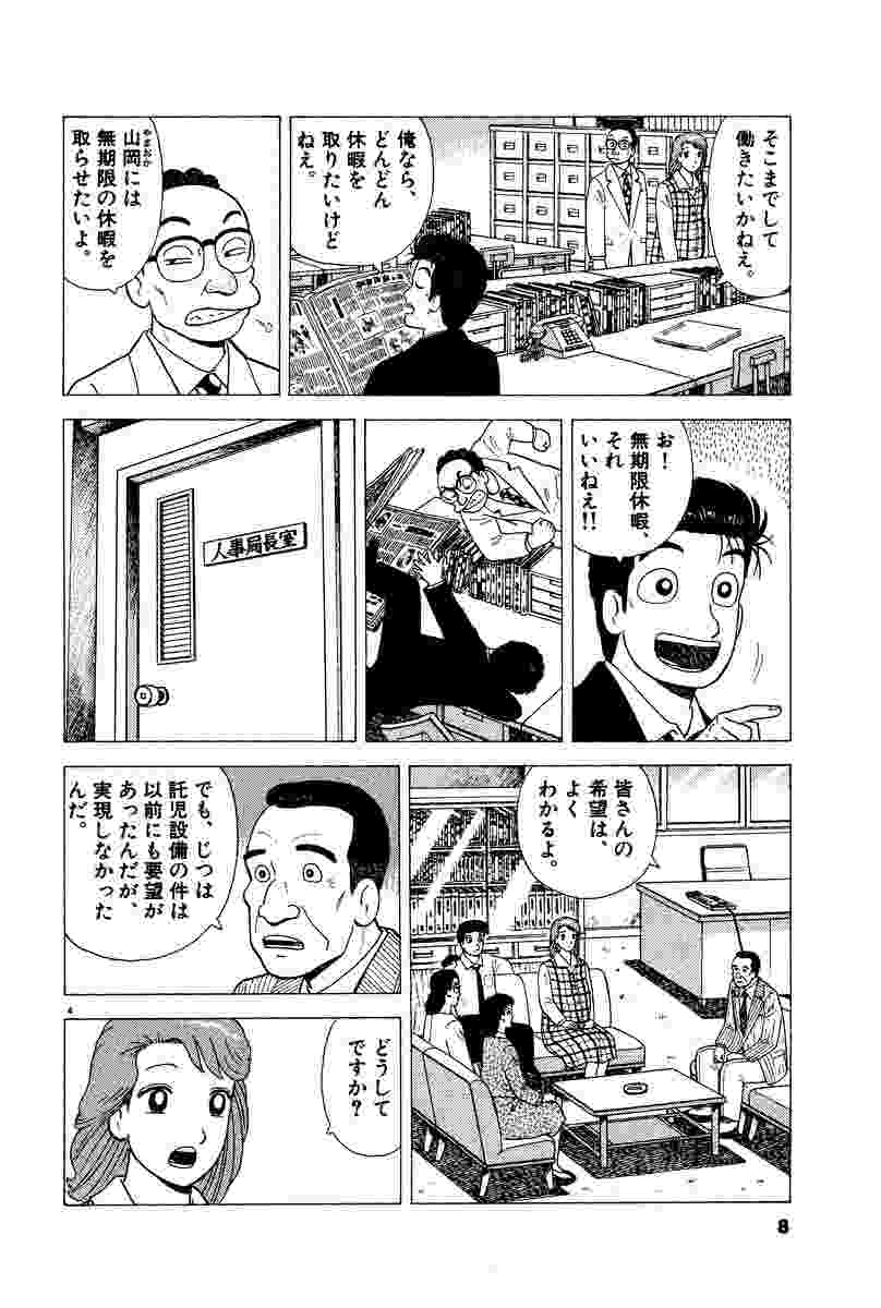 ●あらすじ/ある日、東西新聞社主の大原から呼び出された山岡とゆう子は、ソムリエになりたいという姪の夢を、断念させてほしいと頼まれる。ソムリエは素晴らしい職業だと山岡は反撃するが、大原は聞く耳を持たない。仕方なく二人は、姪のさとみに会いに行くのだが……(第1話)。▼噺家のブラックのところに、待望の赤ちゃんが生まれた。しかし、ブラックの妻・テルエは妊娠ですっかり食が細くなってしまい、おっぱいの出もあまりよくないという。そこでブラックは、「イカの煮物なら食べられそう」というテルエのために、さっそくイカ煮作りを始めるが、なかなかうまくできなくて……(第2話)。