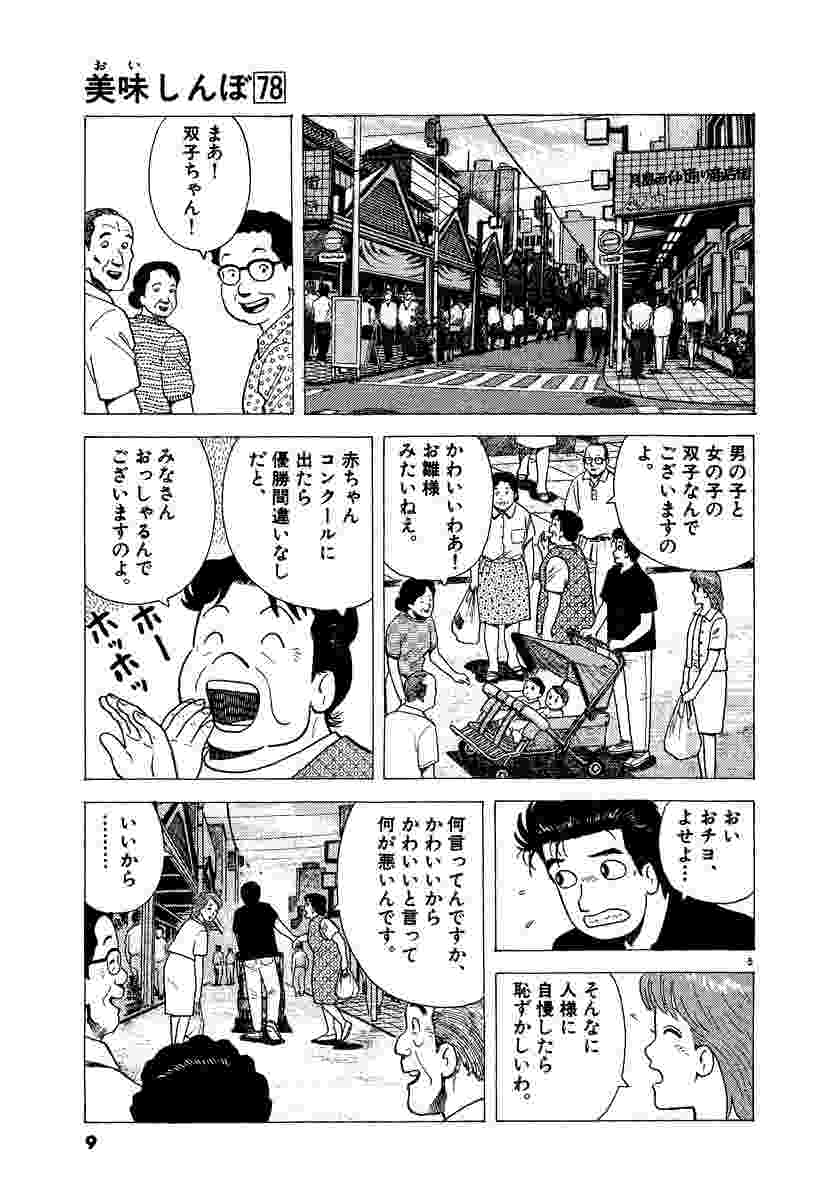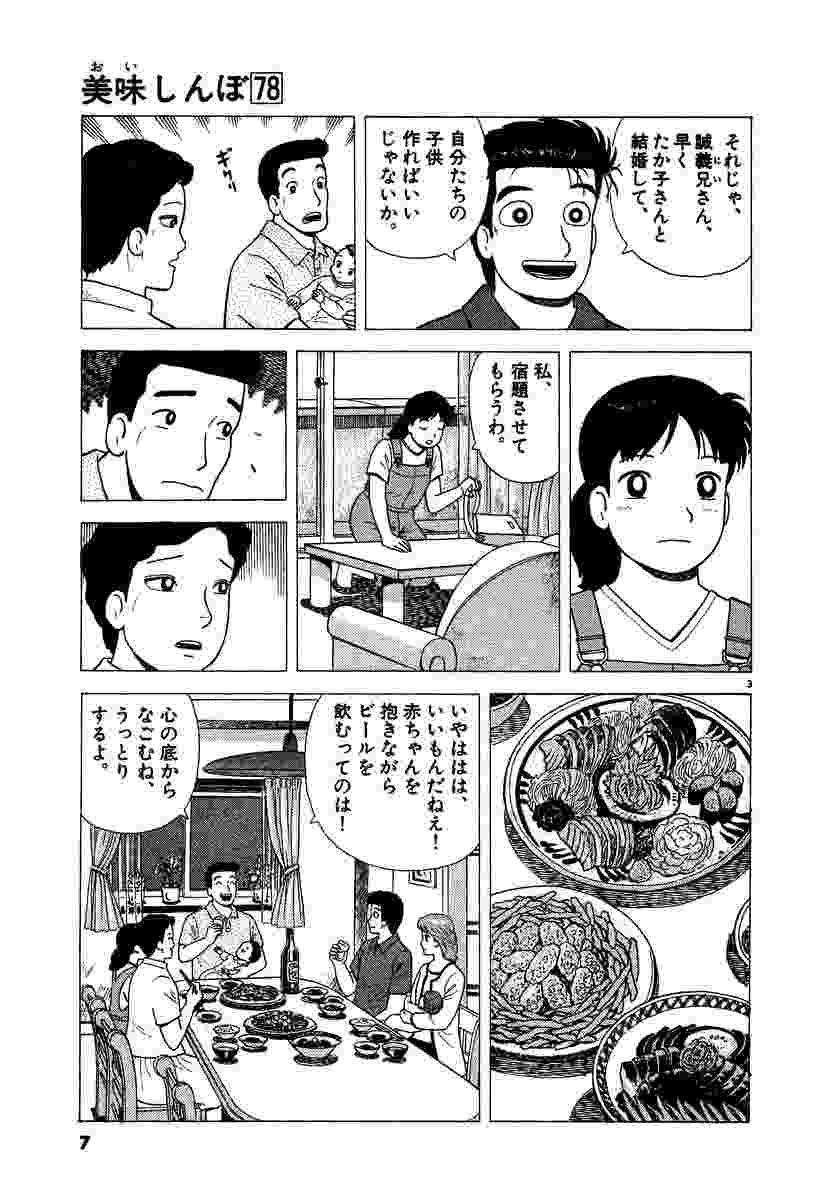 ●主な登場人物/山岡士郎(東西新聞文化部員。膨大な食の知識を持つ。東西新聞の壮大な企画「究極のメニュー」の作成を担当。ゆう子と結婚し、双子の父に)、山岡ゆう子(旧姓・栗田。東西新聞文化部員。夫の士郎とともに「究極のメニュー」を担当)、海原雄山(超高級料亭「美食倶楽部」を主催する希代の美食家。自分に反抗し家を出た実の息子・士郎を勘当。「至高のメニュー」で対決する)