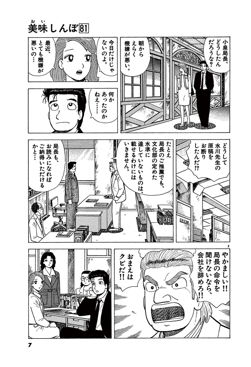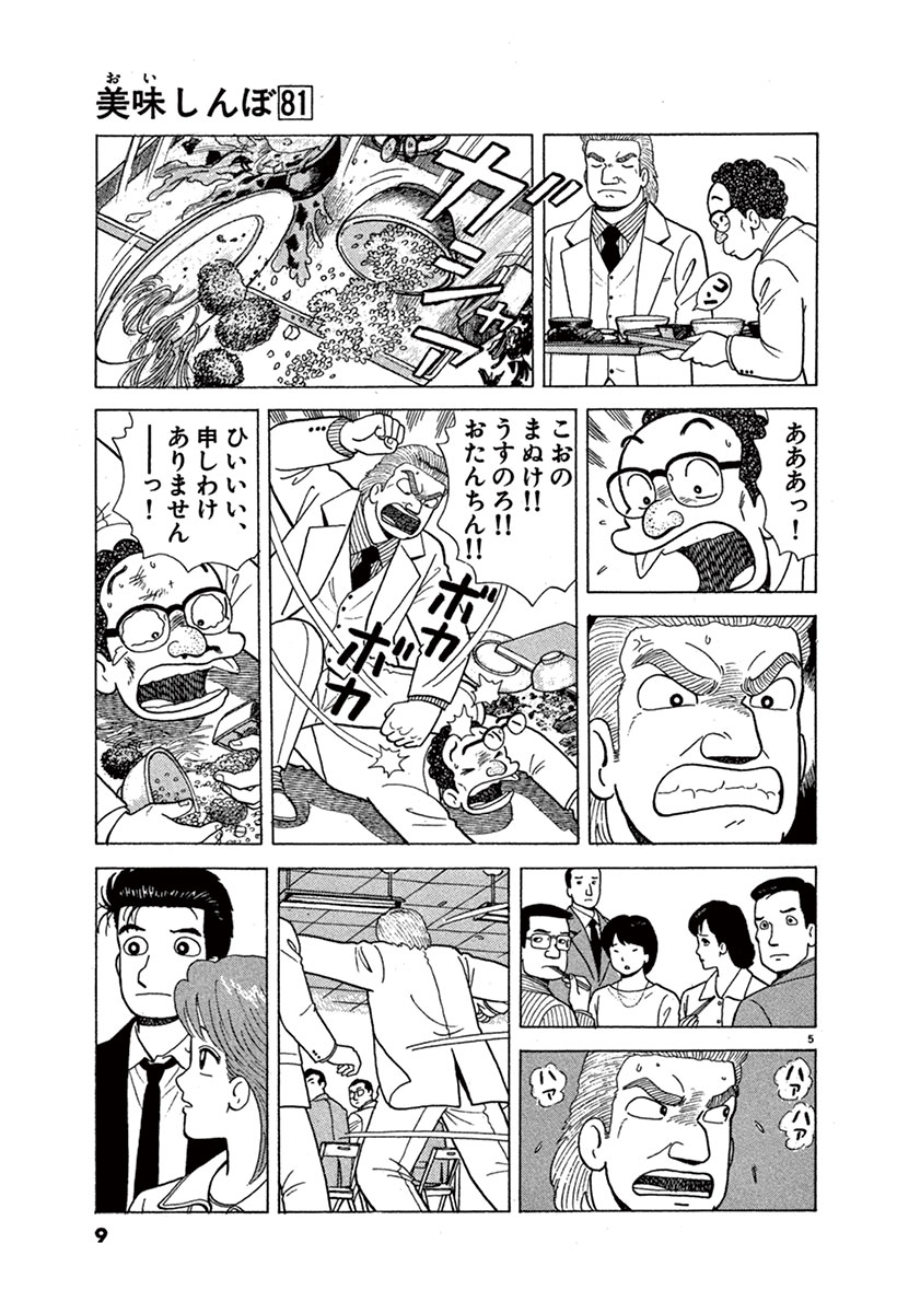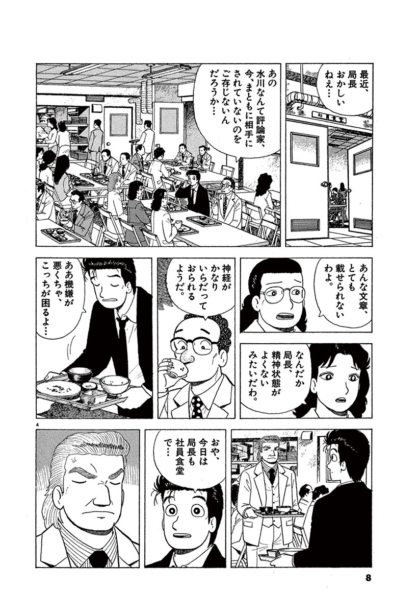 ▼第1話/甘い良薬▼第2話/親ばなれ、孫ばなれ▼第3話/イタリア対決!!<1>▼第3話/イタリア対決!!<2>▼第3話/イタリア対決!!<3>▼第3話/イタリア対決!!<4>▼第3話/イタリア対決!!<5>▼第3話/イタリア対決!!<6>▼第4話/どたんば食事会▼第5話/夏ばて局長命令!●主な登場人物/山岡士郎(東西新聞文化部員。膨大な食の知識を持つ。東西新聞の壮大な企画「究極のメニュー」の作成を担当。ゆう子と結婚し、双子の父に)、山岡ゆう子(旧姓・栗田。東西新聞文化部員。夫の士郎とともに「究極のメニュー」を担当)、海原雄山(超高級料亭「美食倶楽部」を主催する希代の美食家。自分に反抗し家を出た実の息子・士郎を勘当。「至高のメニュー」で対決する)●あらすじ/断酒中で機嫌が悪い小泉局長に、飴玉をなめることを勧めた山岡とゆう子。ところが、次の日になっても彼の機嫌は回復しない。小泉は様々な飴玉を試してみたのだが、どれも刺激が強すぎて体が受け付けなかったのだ。頭を抱える小泉に、山岡は「本当の飴」を試すことを提案する…(第1話)。●本巻の特徴/美食倶楽部の若手料理人・岡星良三をめぐり、「究極のメニュー」と「至高のメニュー」が競う「イタリア対決!!」では、食の都イタリア・パルマを舞台に、パルメザン・チーズ、プロシュート(生ハム)などの高級食材がテーマとなる。ほか、飴玉、ギョウザなど身近なものをテーマにした全5編で、「食」の根源を追求する。●その他の登場人物/山岡陽士・遊美(士郎とゆう子の間に生まれた双子)、大原大蔵(東西新聞社社主)、小泉鏡一(東西新聞社取締役編集局長。プライドが高く、自説を曲げない頑固者)、谷村秀夫(東西新聞社編集局次長兼文化部長。温厚な性格で、常に冷静。部下からの人望が厚い)、富井富雄(東西新聞社文化部副部長)