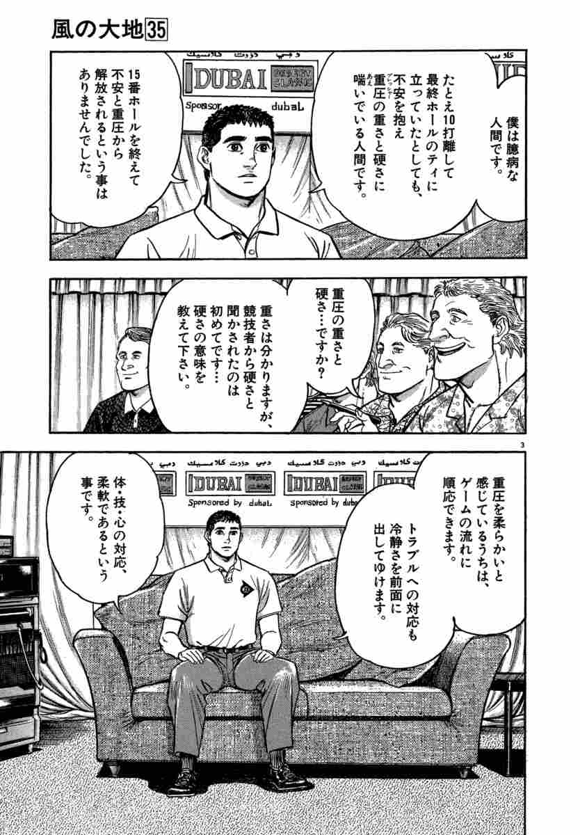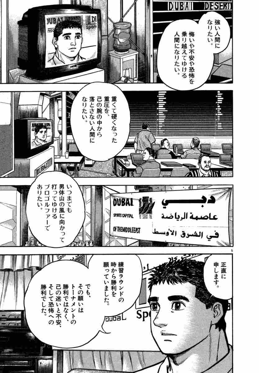 ▼第1話/ドバイの夕日▼第2話/帰路につく者達▼第3話/凱旋帰国▼第4話/憶測▼第5話/安らぎの場所▼第6話/くすぶる不安▼第7話/クラブの心▼第8話/三本のウッド▼第9話/95%の信頼●主な登場人物/沖田圭介(鹿沼カントリークラブ初のプロゴルファー)、ウォーレン(アメリカのプロゴルファー。知性のゴルフ)、アベル(ポルトガルのプロゴルファー。神の子と呼ばれる)、物部麗子(沖田の憧れの女性)●あらすじ/ドバイオープンで優勝が決定し、沖田は記者達に囲まれてインタビューを受ける。結果的には2位以下に8打差と圧勝のように見えたが、実際には大きな葛藤や重圧があったことを、素直に沖田は語っていく。その様子をテレビの中継でじっと見ていたアベルは…(第1話)。▼ホテルでキャディのガンディと朝食を取っていた沖田だったが、その日はドバイオープンを戦った仲間たちとの別れの日でもあった。もう一日ドバイに残る沖田は、帰路につくウィリーやウォーレンらと堅い握手を交わし、友情と再戦を誓うのだった…(第2話)。●本巻の特徴/ドバイから日本に舞台を移し、新展開を迎える本巻では、沖田から麗子へのプロポーズ、クラブ職人・杉山健三との出会いなど新たな人間模様が描かれる。