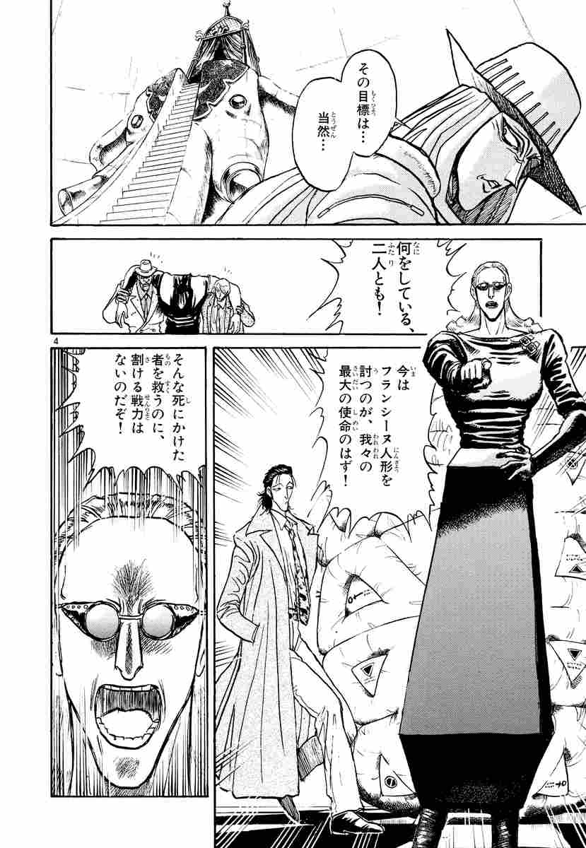サハラ砂漠を赤く染めた決戦、ついに決着! ルシールのフランシーヌ人形は「最古の四人」の足止めに成功。先の戦いで傷つき、壊れゆく加藤鳴海には、ダール、ティンババティ、トーアの思いが注がれていく。手術が続く中、自由を取り戻した人形たちは「長足クラウン号」でテントから脱出を図る。ミサイルで人形を一網打尽にする作戦は、逆利用されていたのだ!