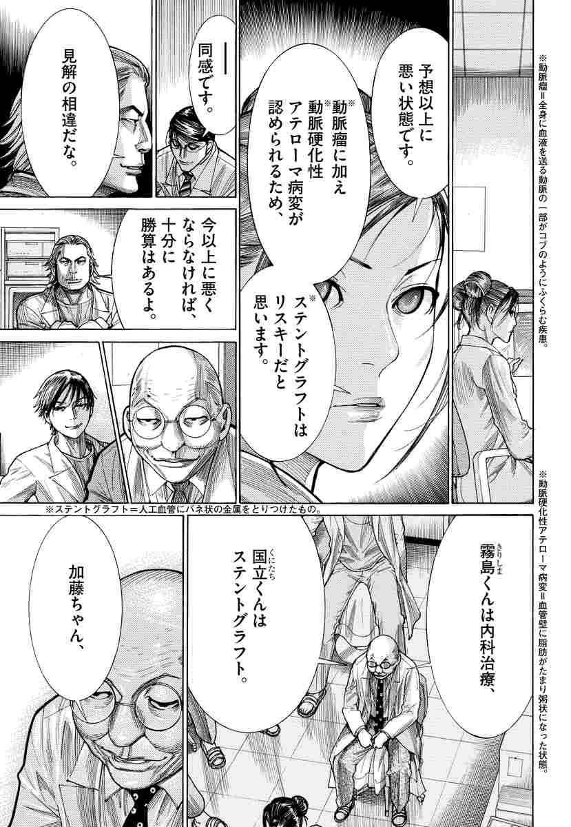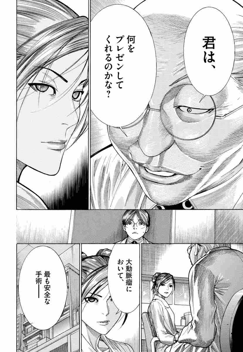 チームを抜けた朝田…さらなる覚醒へ!! 求心力を失った野口教授主催の納会に現れたのは、野口の心臓病を察知した朝田のみ。納会は二人だけの酒宴となり、なぜかその後、朝田と野口は親密な関係となる。そんな中、野口は明真大胸部心臓外科次期教授候補の3人を自らの主治医に指名、各々に治療プランの作成を求める。各候補の治療方針の最終プレゼンが始まるが…一人目の霧島は内科治療、二人目の国立はステントグラフトを提唱する中、最後の三人目、チームから朝田が抜けた加藤のプランは――!? そして、野口が選ぶのは!??