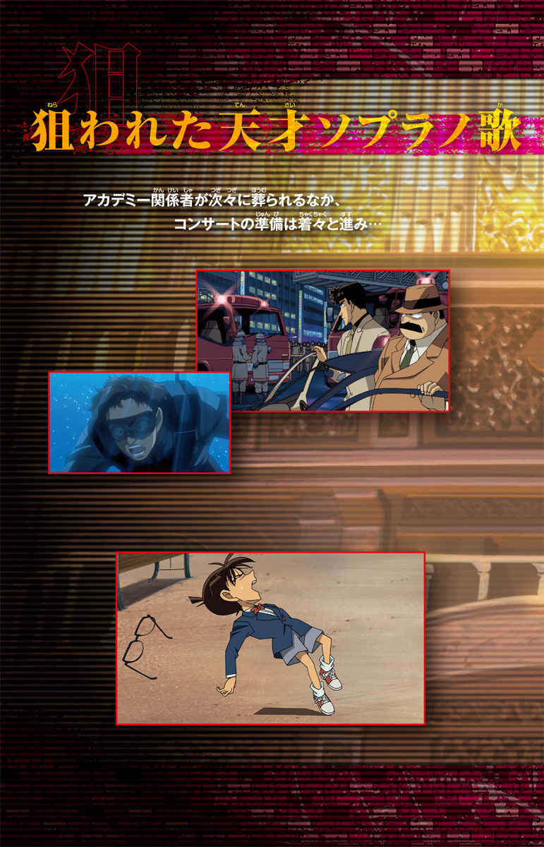 天才女性歌手を巡る怪事件の謎に迫る! 有名音楽アカデミーで爆破事件が発生!現場からはフルートの一部が発見された。続いて二人、アカデミー卒業生が殺害され、やはり現場でフルートが見つかったことで、連続殺人事件として捜査が始まる。一方、コナンたちはアカデミーの創設者が作った新しいホールのこけら落としコンサートに招待され、リハーサルで絶対音感を持つソプラノ歌手・秋庭怜子と出会う。秋庭もまた、何者かに狙われていることを知ったコナンは…?